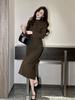 2025 Novo Outono Vestido Feminino Francês de Gola Alta Abotoamento Simples Ajustado até o Joelho Cobre o Quadril Lã 61150