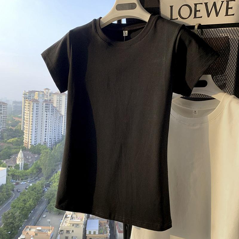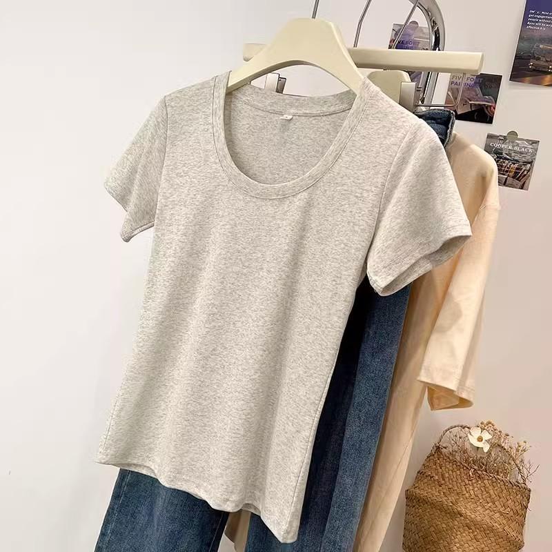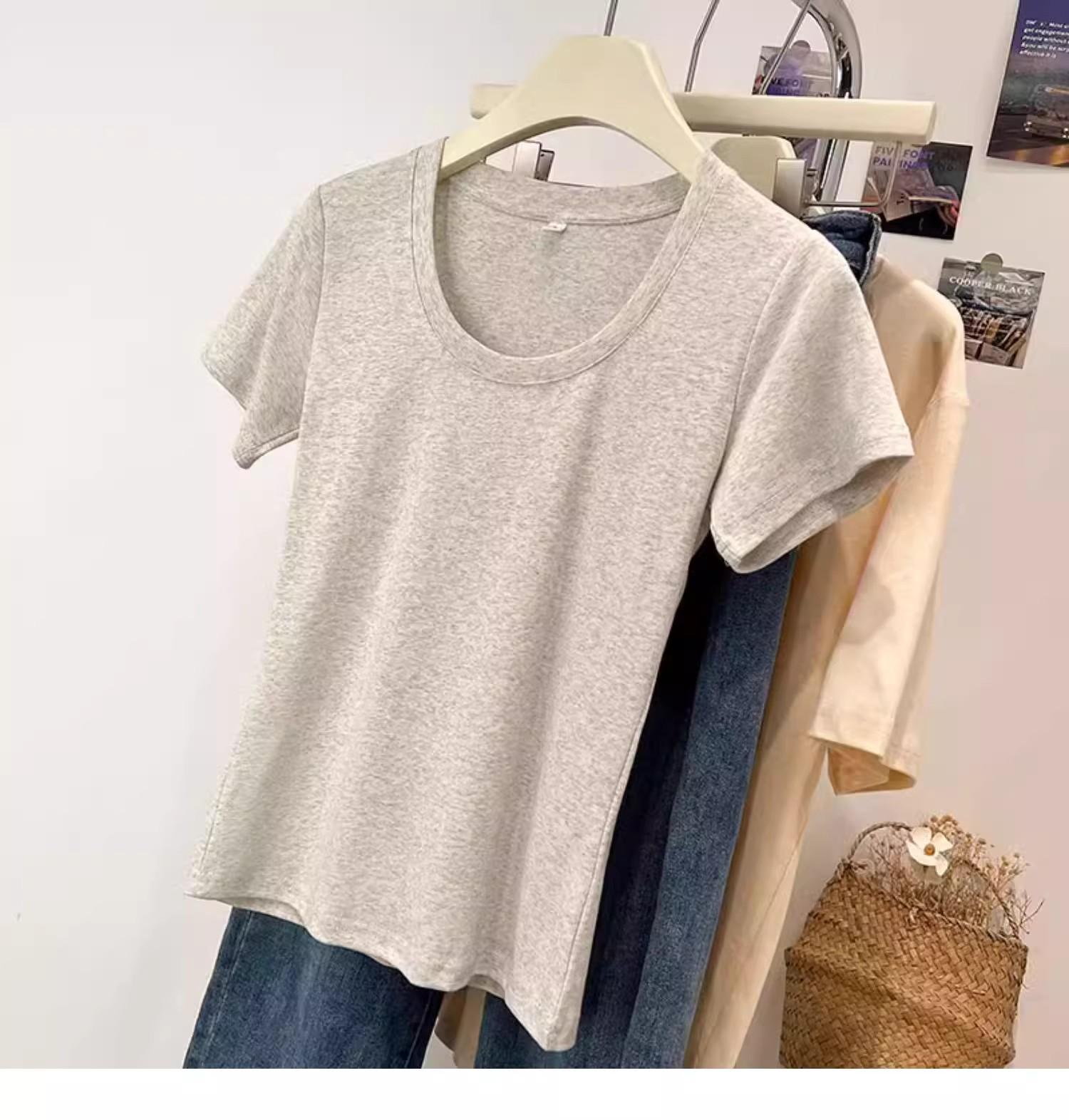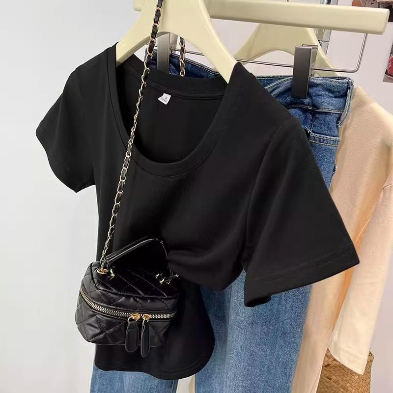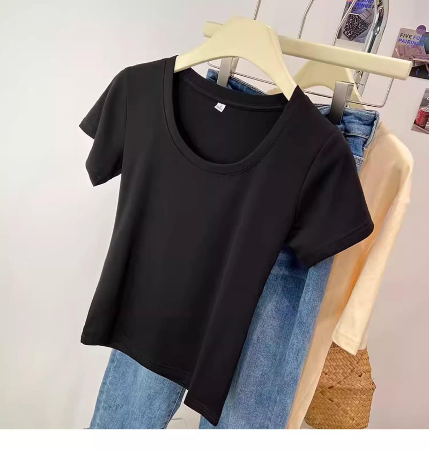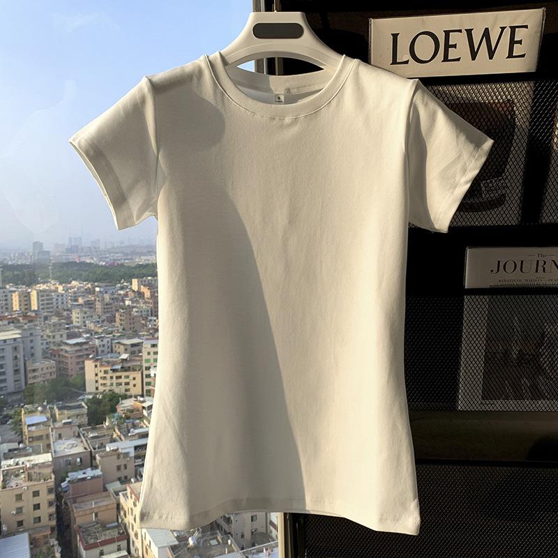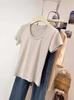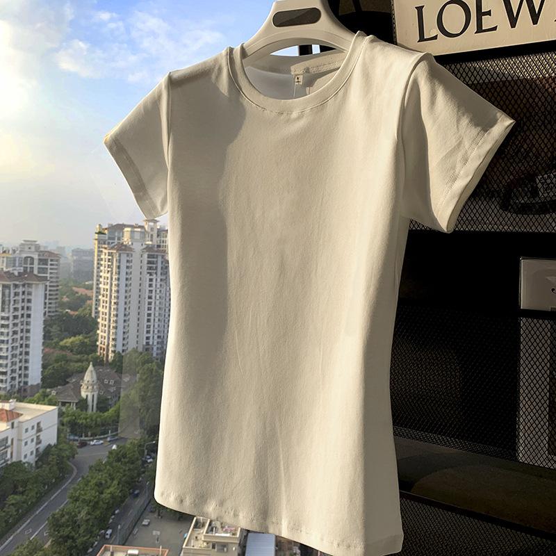 Camiseta de Algodão com Decote U Feminina Manga Curta 2025 Nova Verão Stretch Slim-fit Camiseta Slim-fit Camisa Básica Regata Ombro para Mulheres