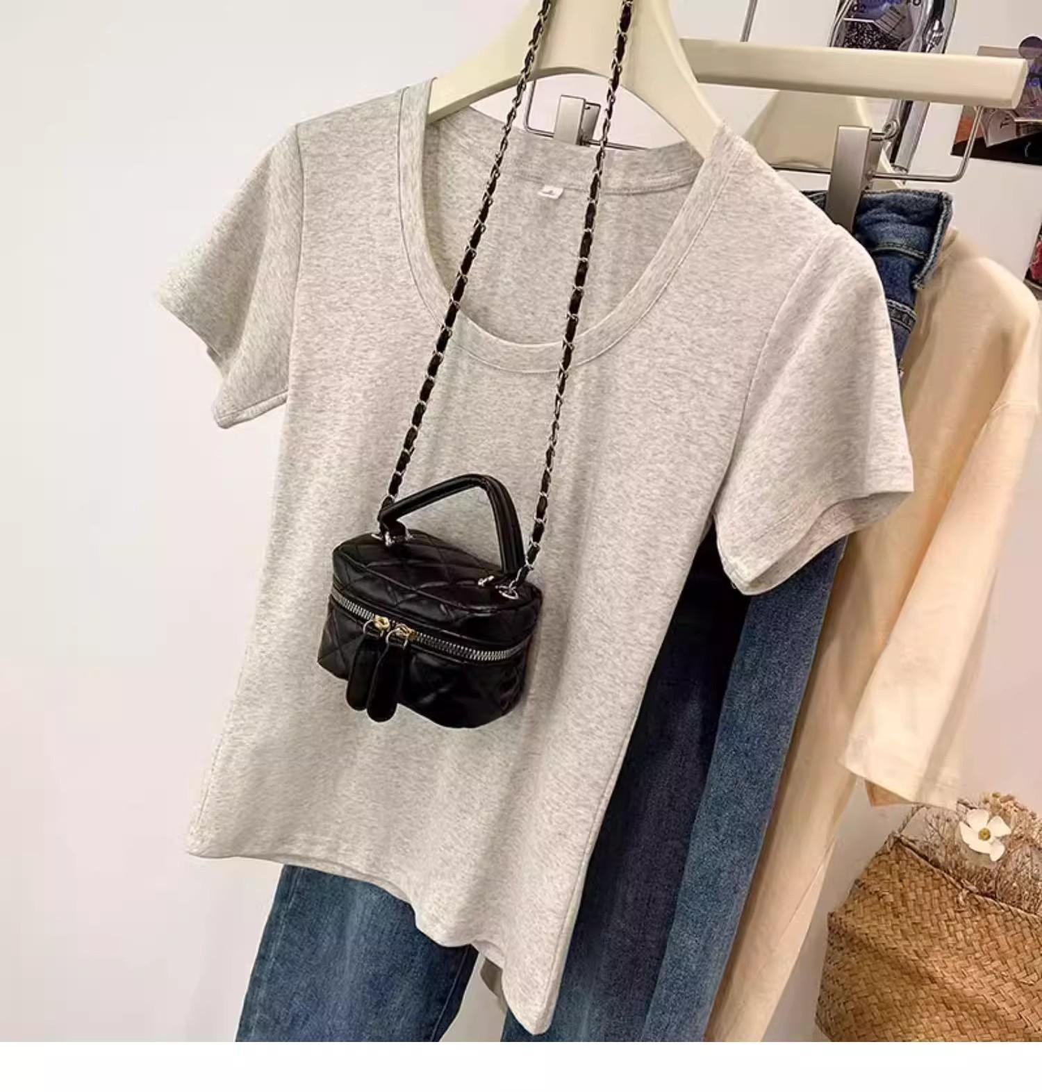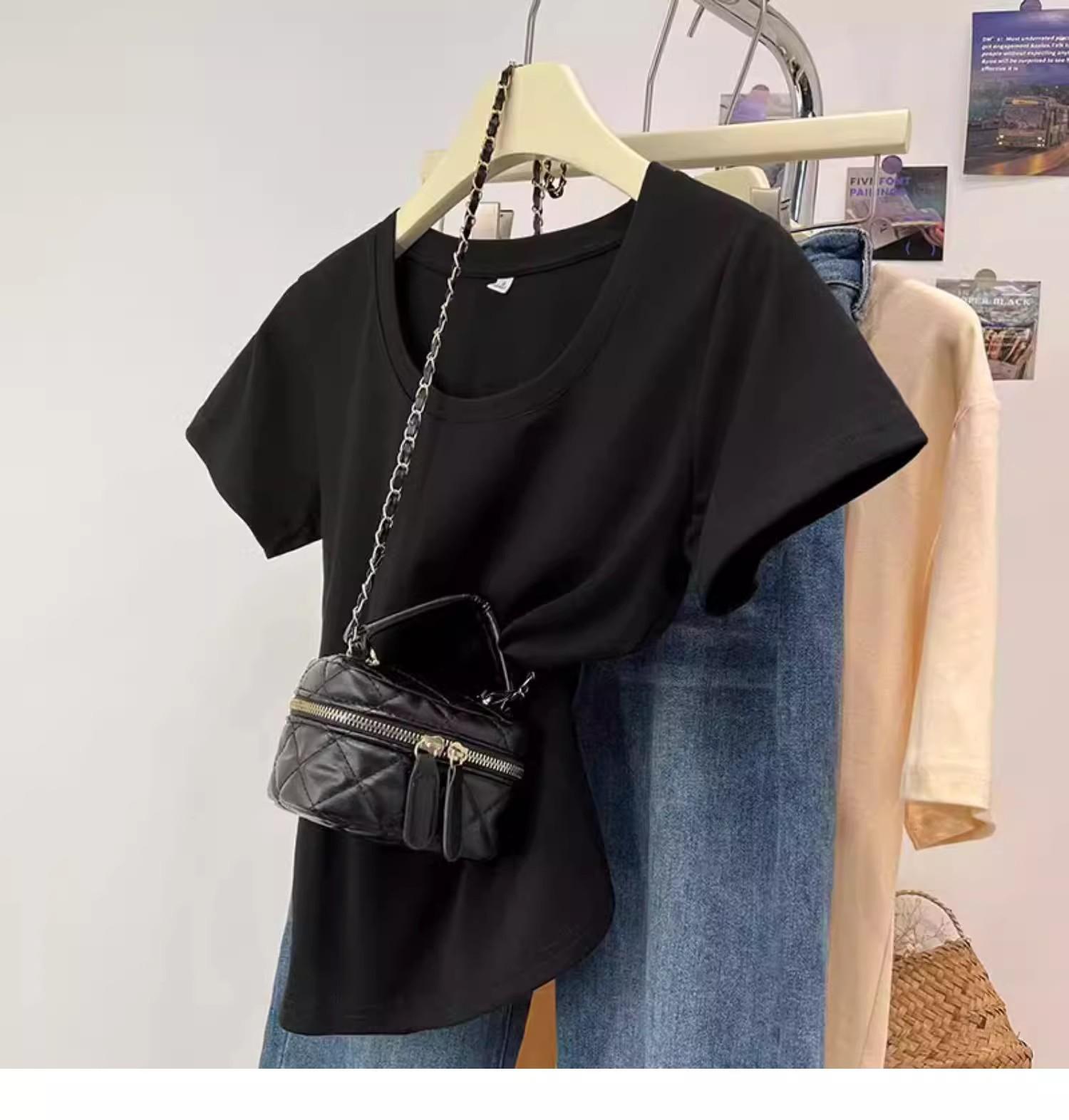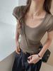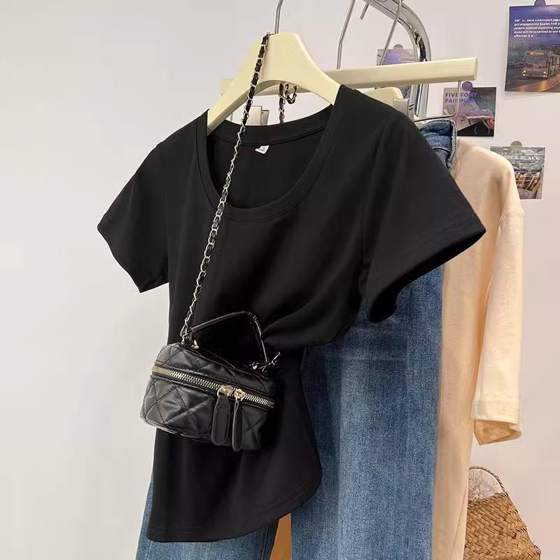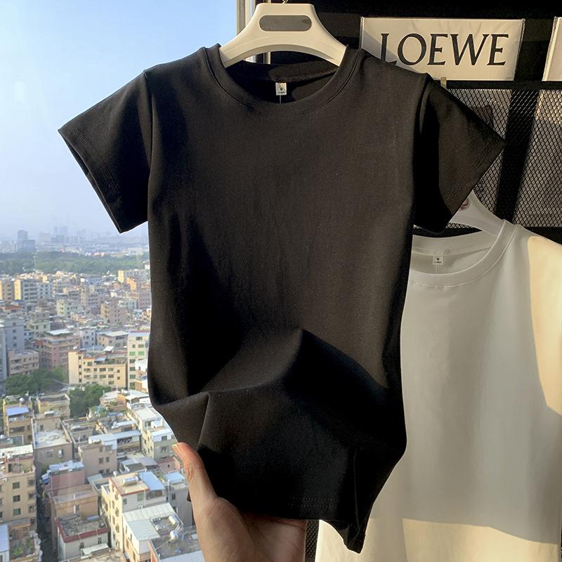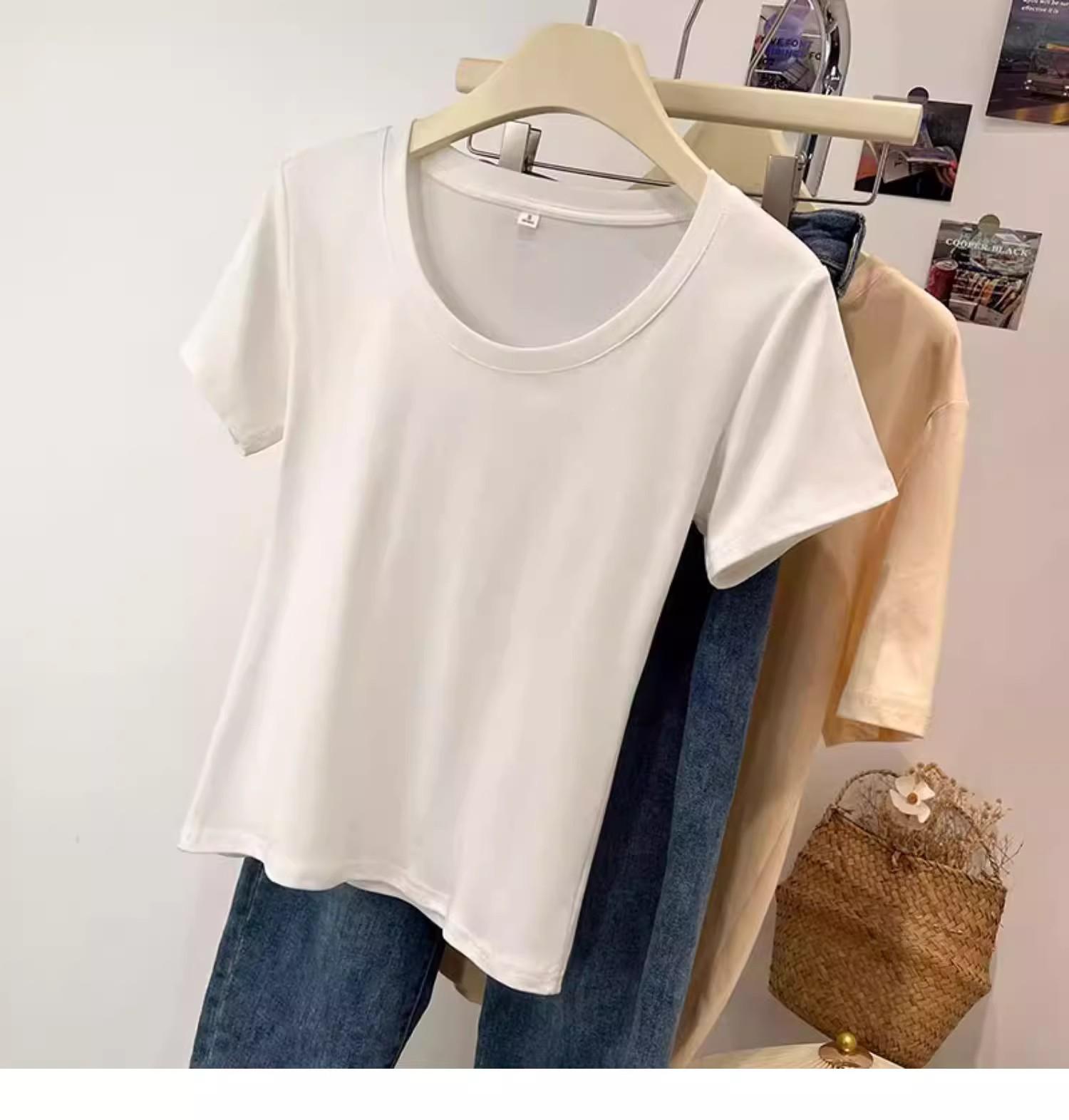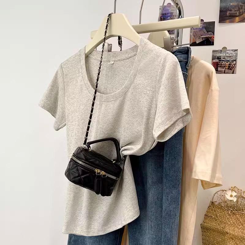 Camiseta de Algodão com Decote U Feminina Manga Curta 2025 Nova Verão Stretch Slim-fit Camiseta Slim-fit Camisa Básica Regata Ombro para Mulheres