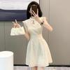 Vestido cheongsam feminino de alta qualidade, estilo chinês, 2025, novo, retrô, manga voadora, flor queimada, cintura plissada, divisão, diário