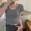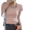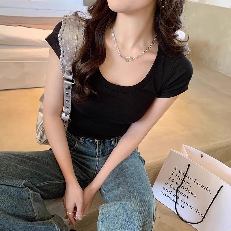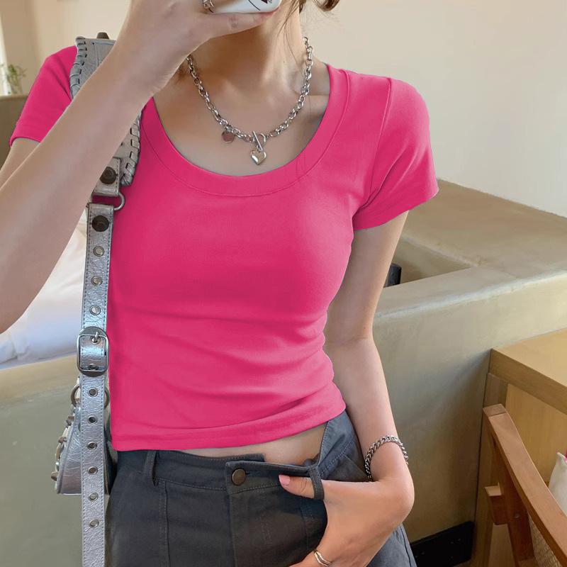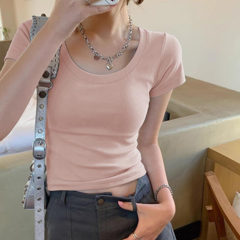 Compre Camiseta feminina de verão 2025, nova, cor sólida, com gola U, manga curta, estilo coreano, slim fit, estilo ocidental, top interno no atacado no Joom.pro