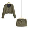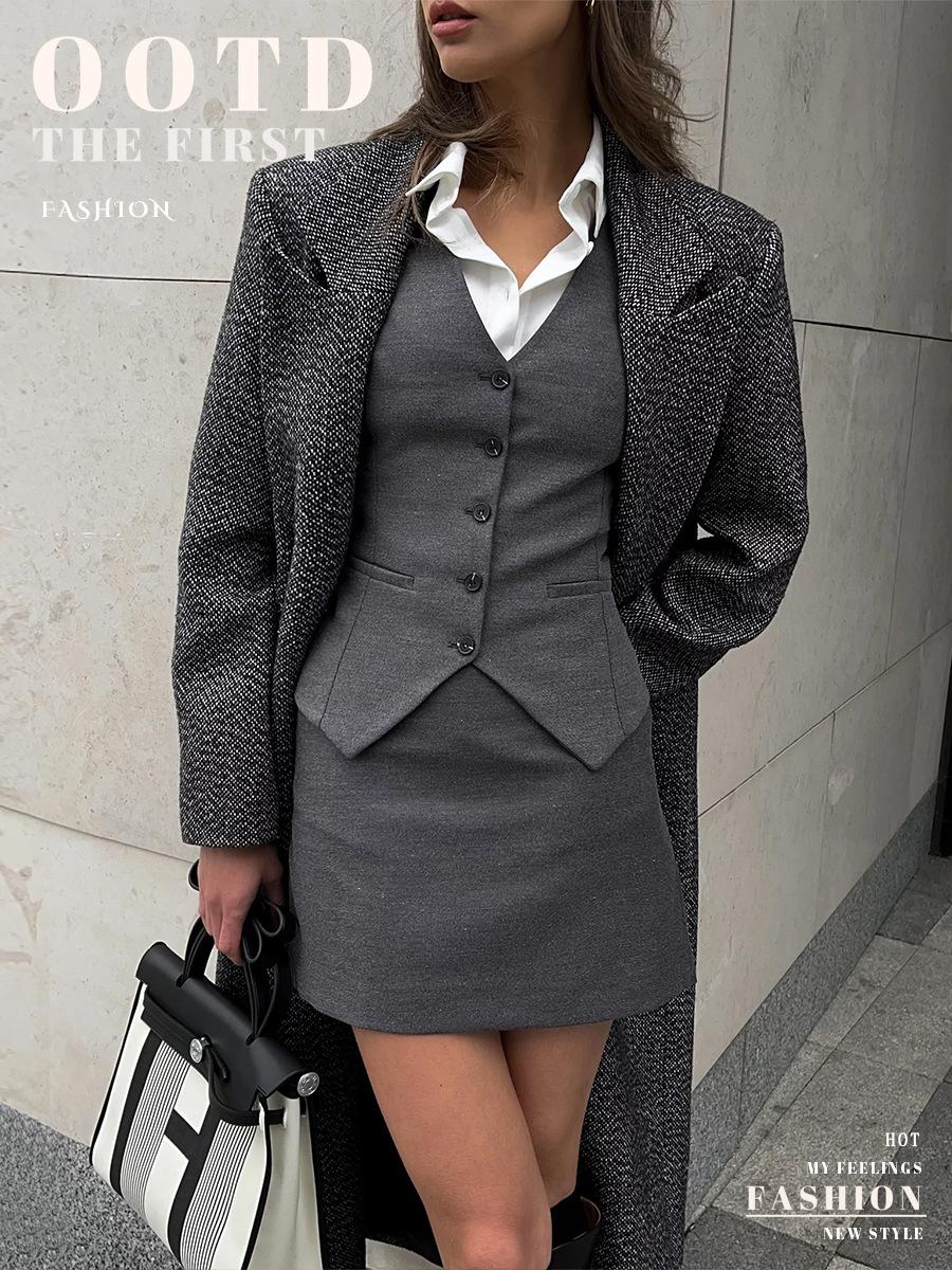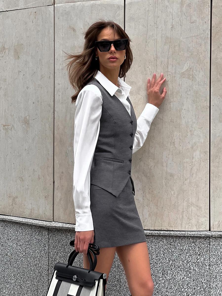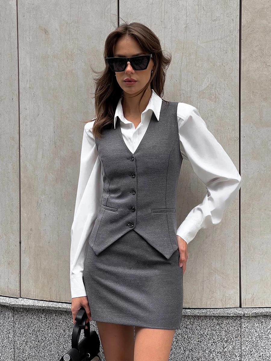 Terno de saia colete cinza transfronteiriça europeu e americano 2025 verão novo botão cardigan colete saia curta