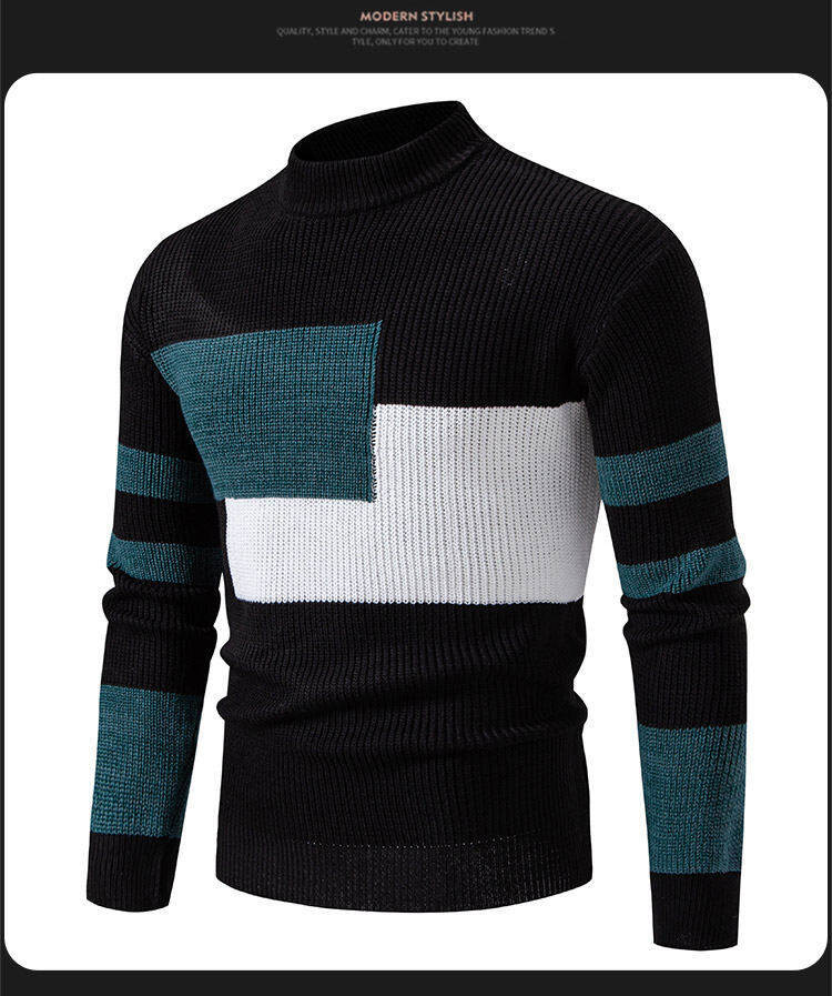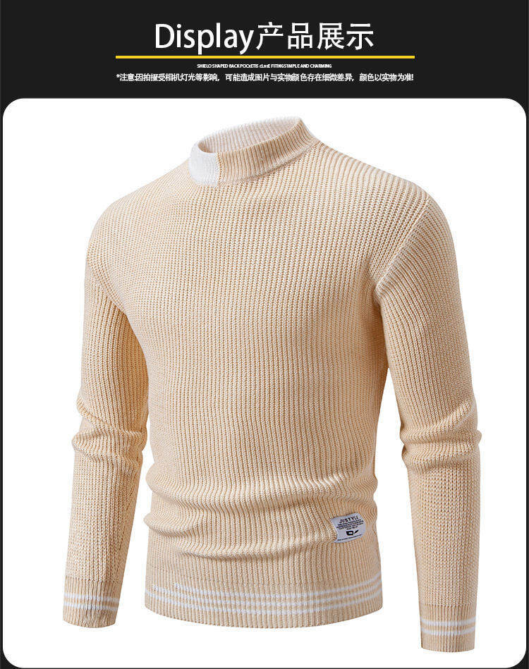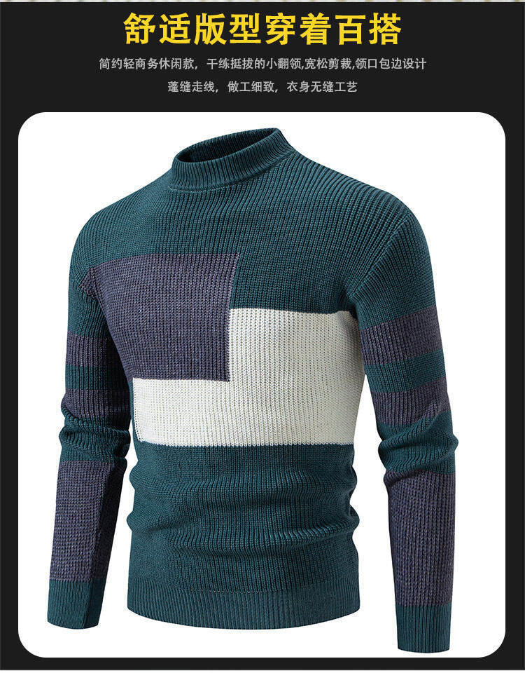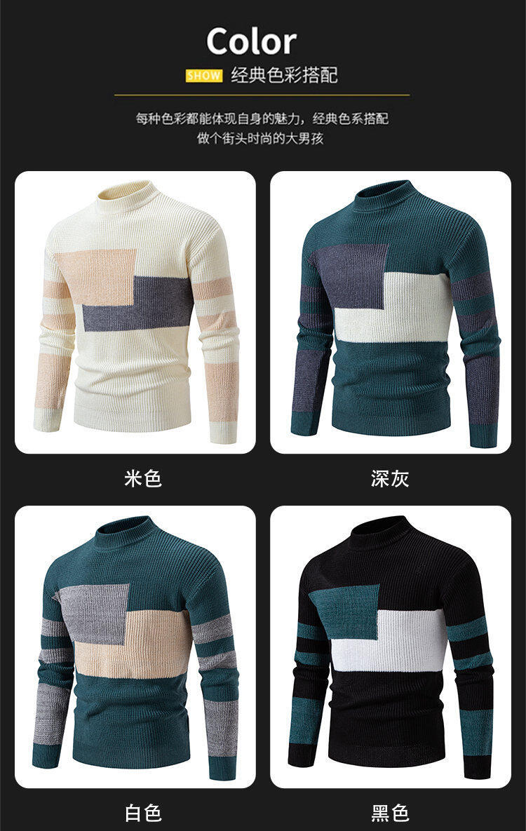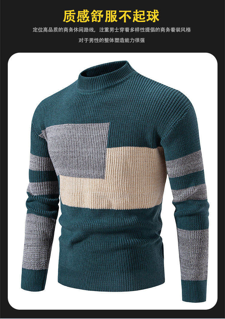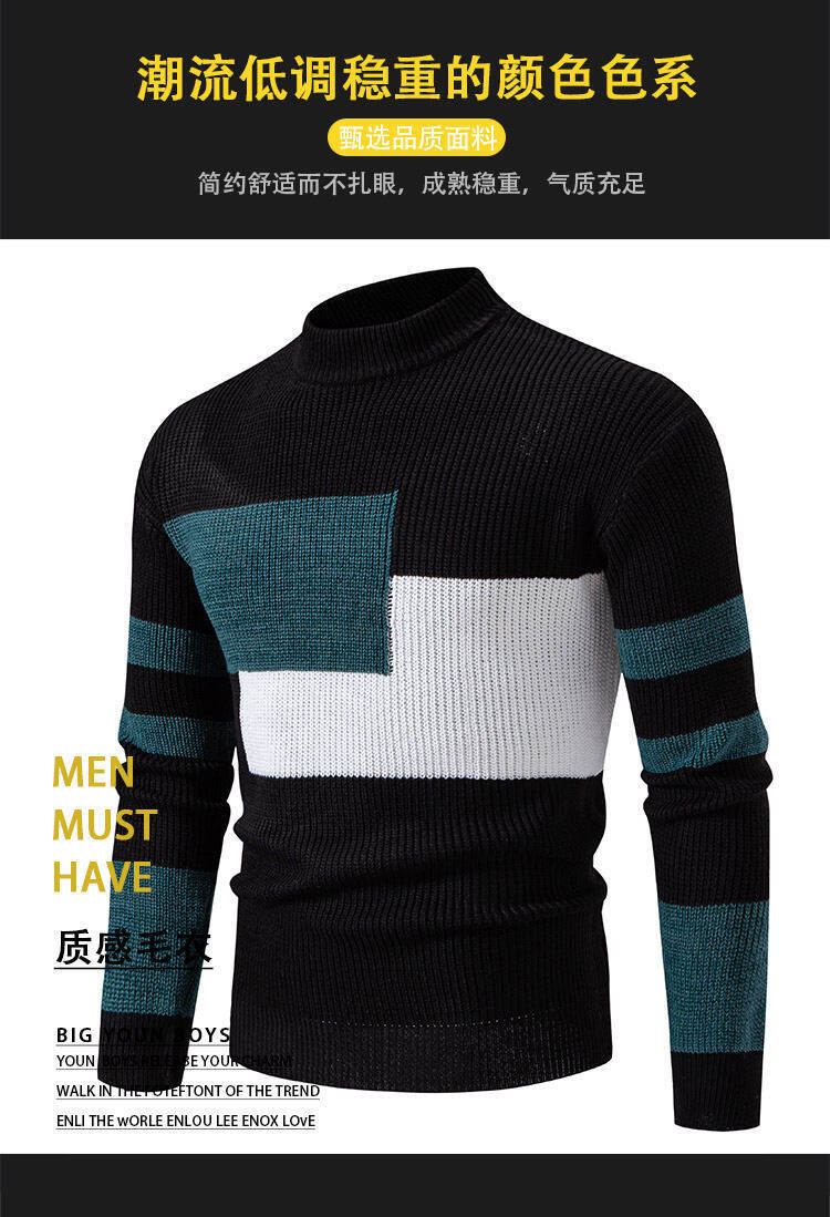 Suéter masculino de primavera e outono, moda de comércio exterior, costura de cor contrastante, gola semi-alta, suéter de malha quente, suéter de combinação completa, moda para jovens