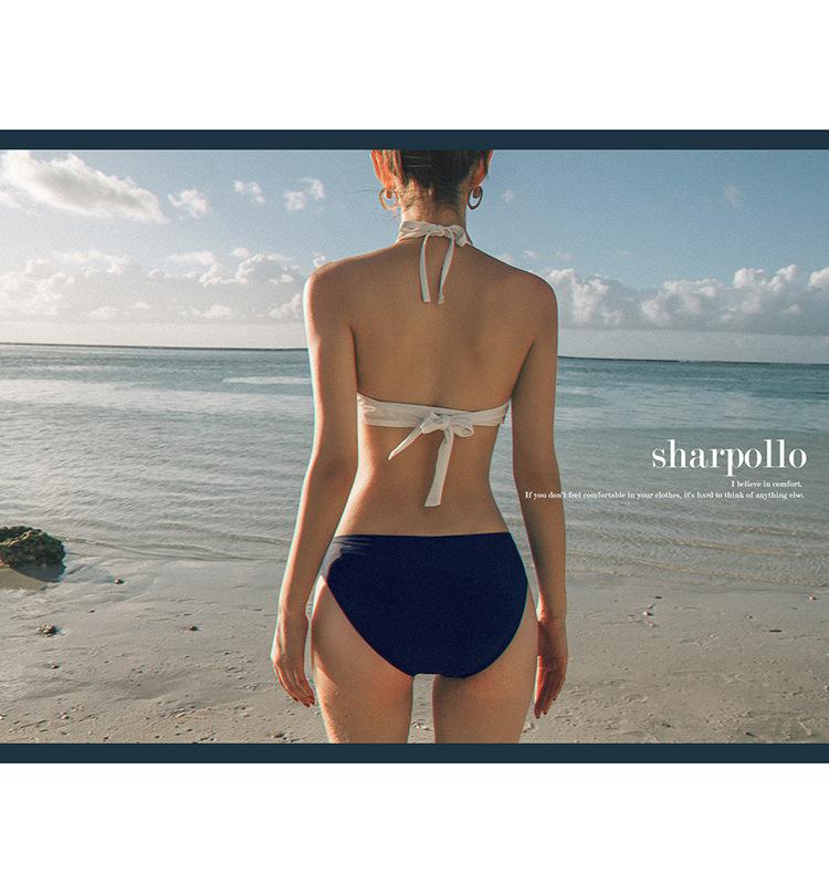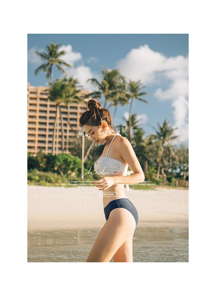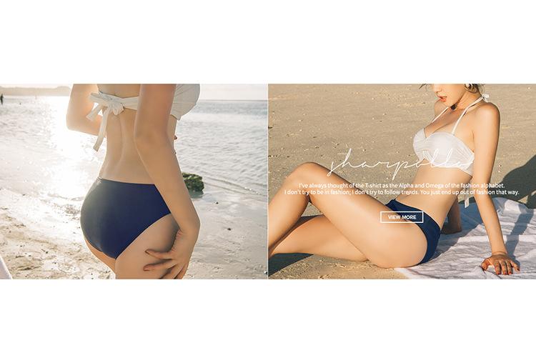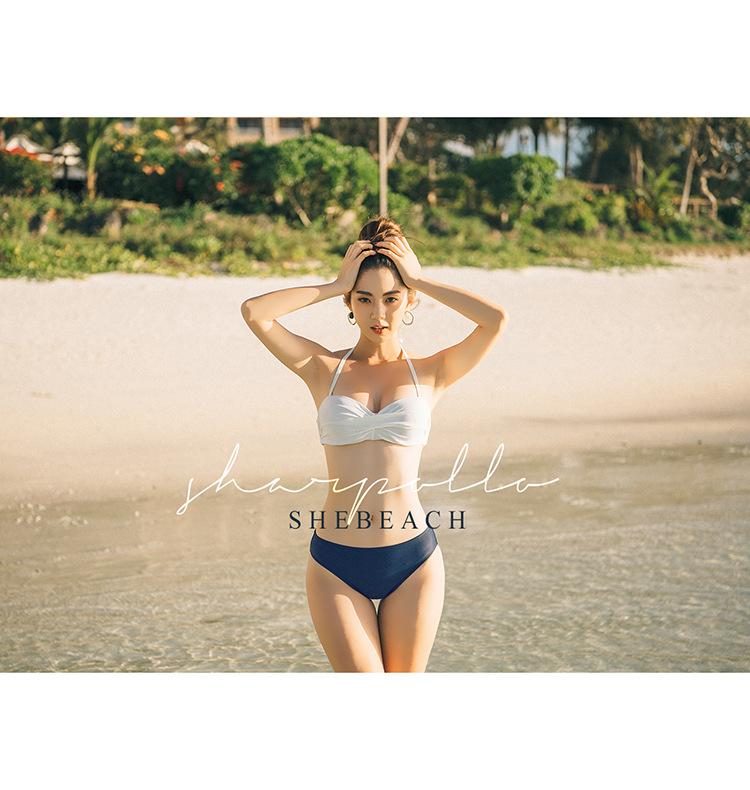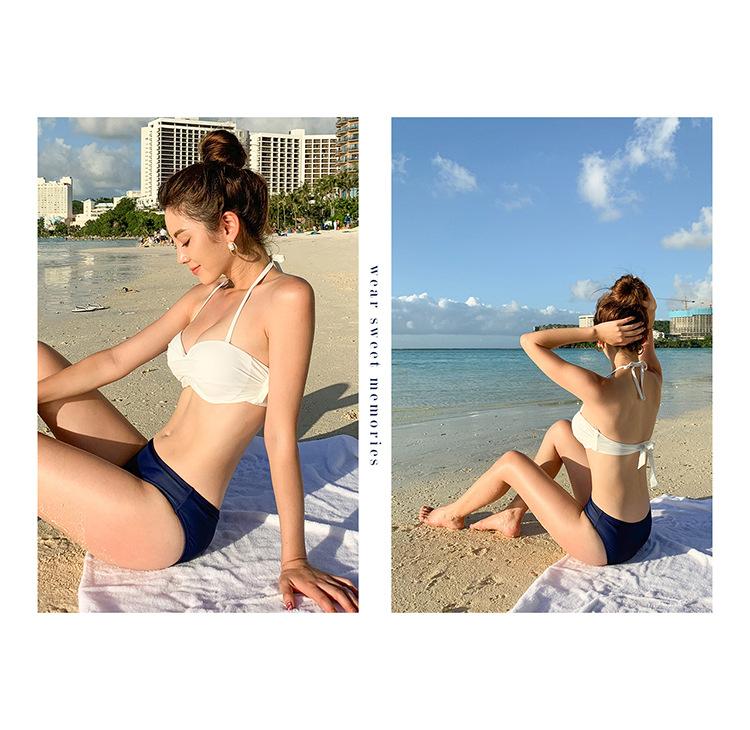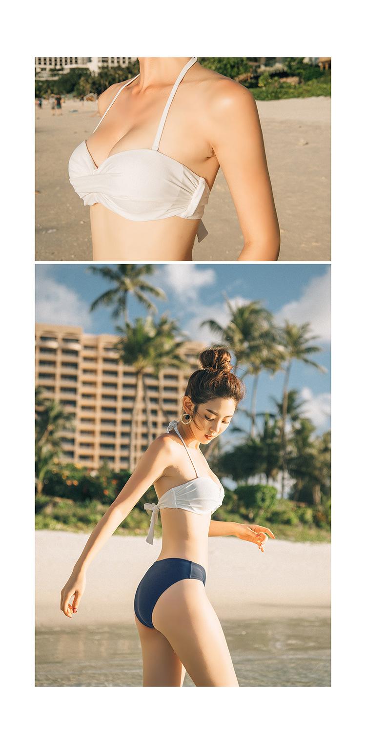 Versão coreana direta da fábrica de maiô triângulo simples branco com decote fendido, cadarço, busto pequeno franzido, costas nuas, praia de águas termais