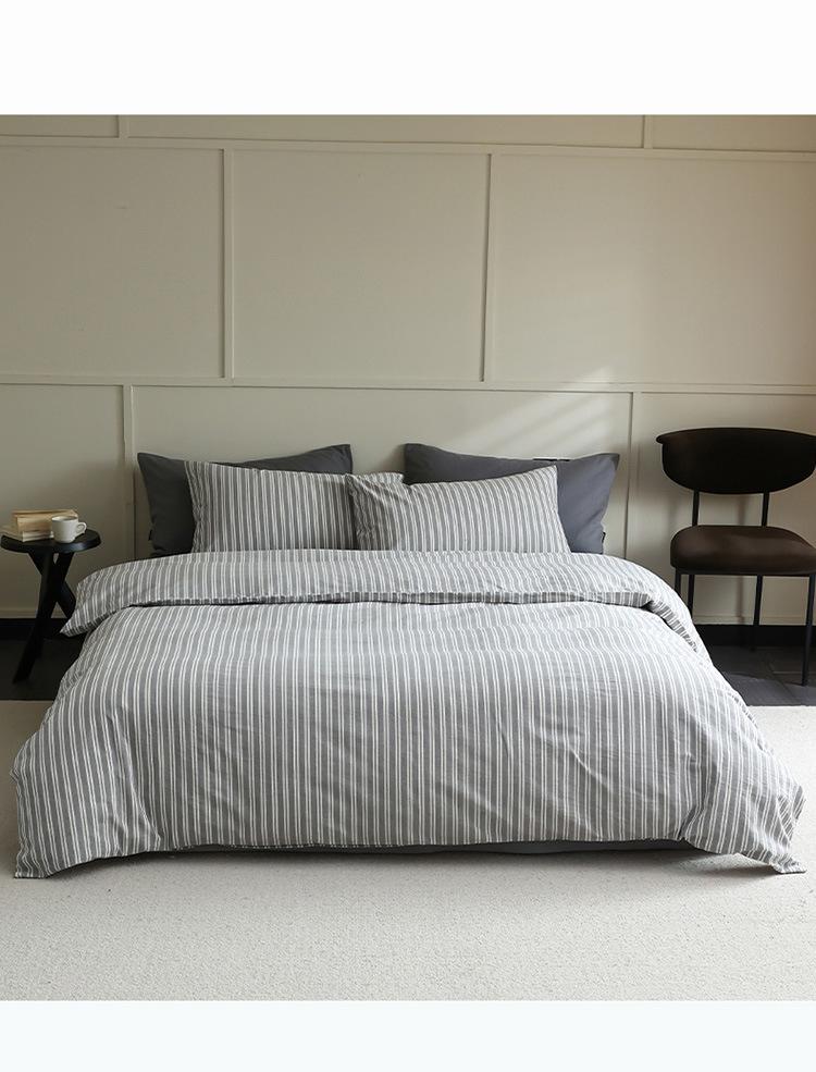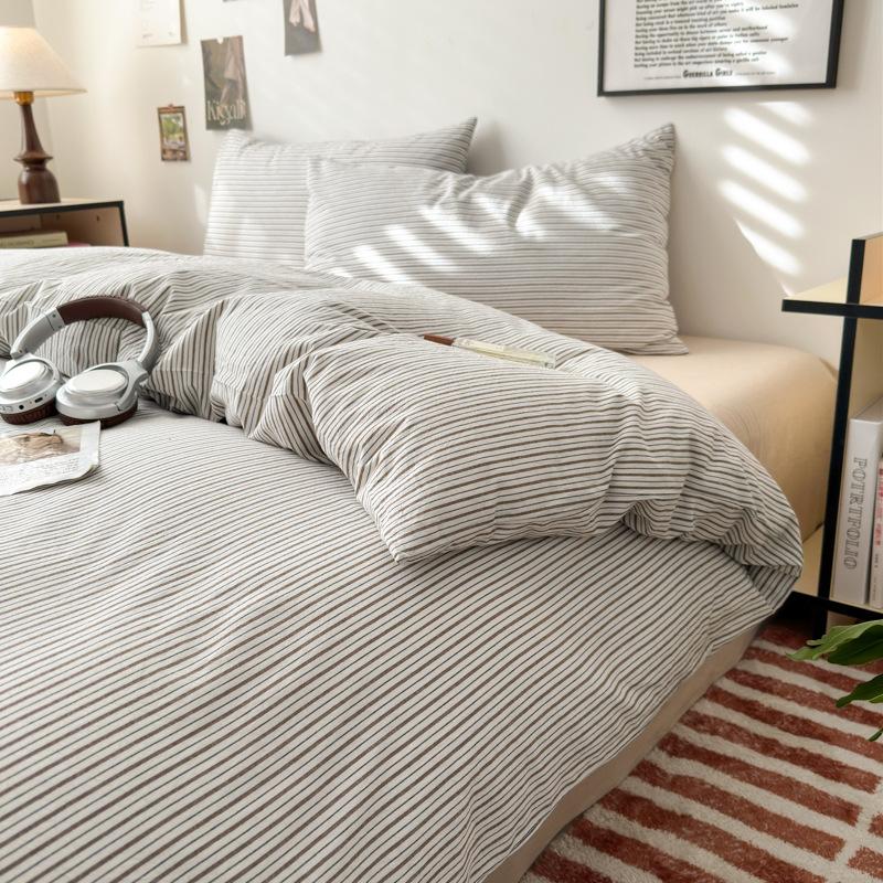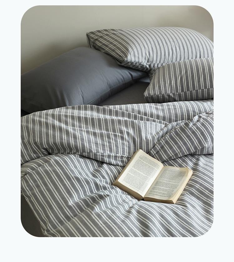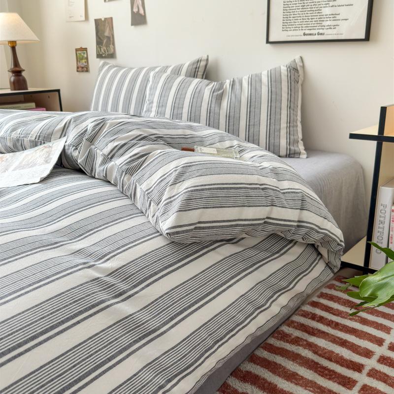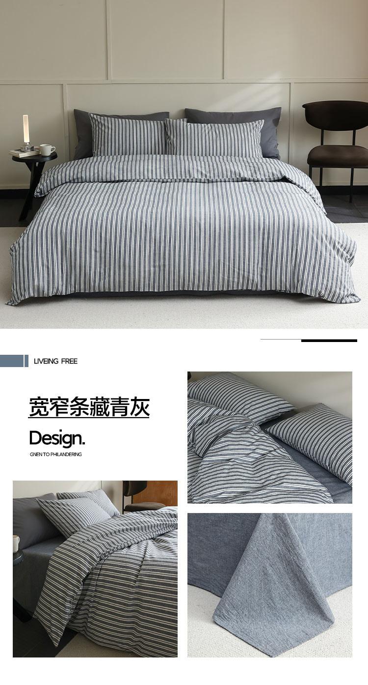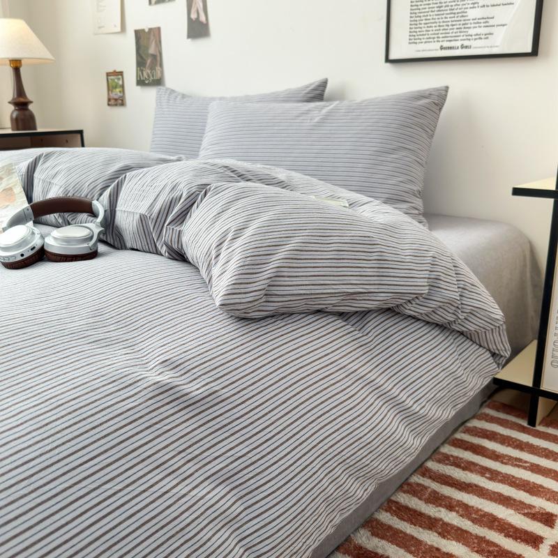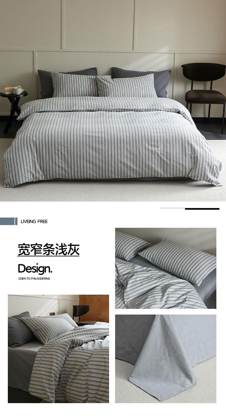 Conjunto de quatro peças de algodão lavado sem estampa em estilo japonês, kit de cama de algodão listrado, conjunto de algodão prateado, largo e estreito