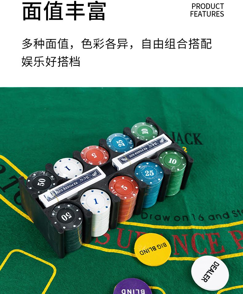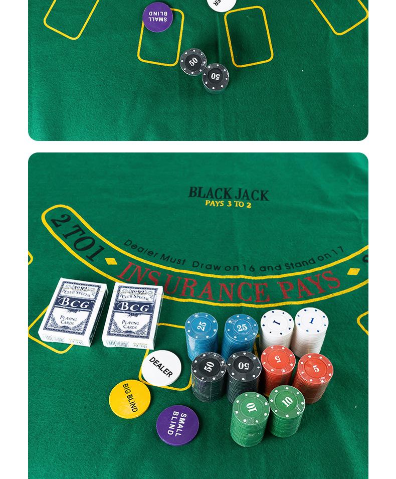 O conjunto completo inclui: 200 fichas + 2 baralhos de cartas + uma toalha de mesa + 1 manual de instruções + 3 botões de dealer + um saco plástico com bolhas, muitas fábricas economizam não incluindo o manual de instruções e o saco plástico com bolhas, haha!