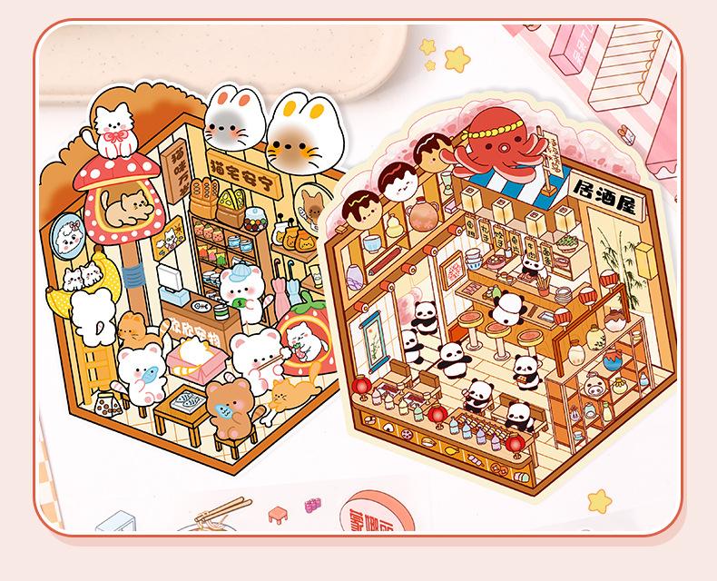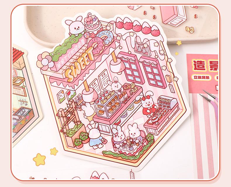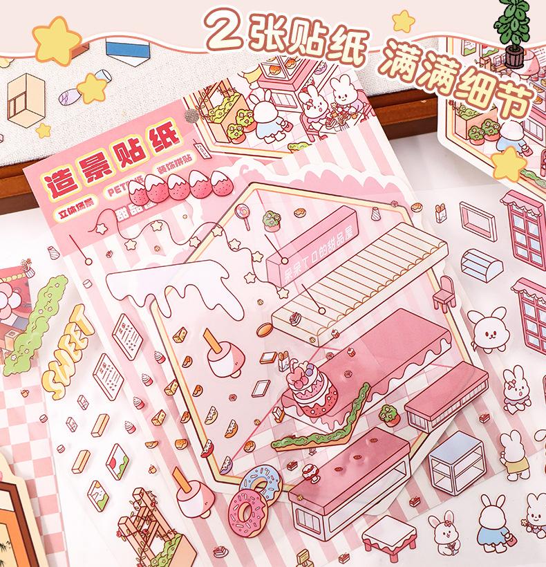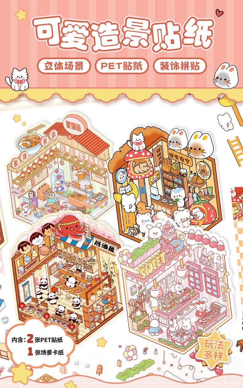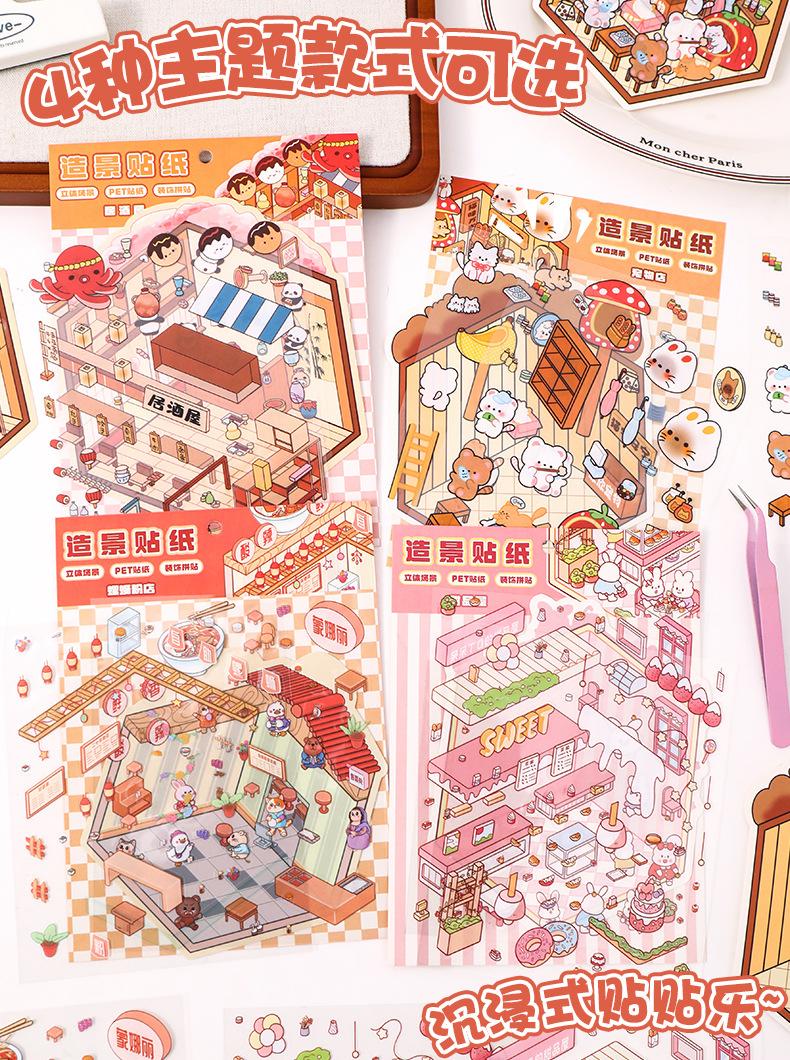 Adesivos de paisagismo de tamanho pequeno Art Blue Novos adesivos de paisagem em miniatura stand-up 3D tridimensional cabana cena fofa adesivos de pilha