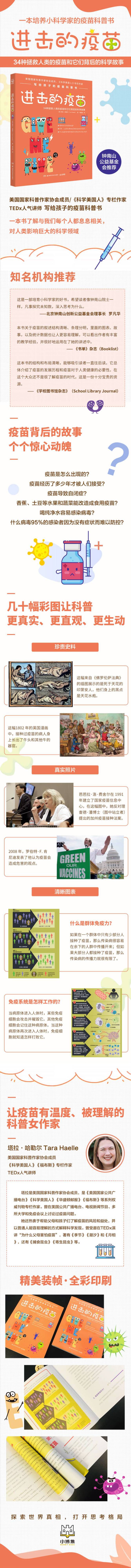 Este livro sobre vacinas, escrito para crianças pela Zhong Nanshan Charity Foundation, membro da American Science Writers Association, colunista da Scientific American e um palestrante popular do TEDx, permite que as crianças aprendam sobre 34 vacinas que salvaram a humanidade e as histórias científicas por trás delas, inspirando o interesse e a admiração das crianças pela ciência.