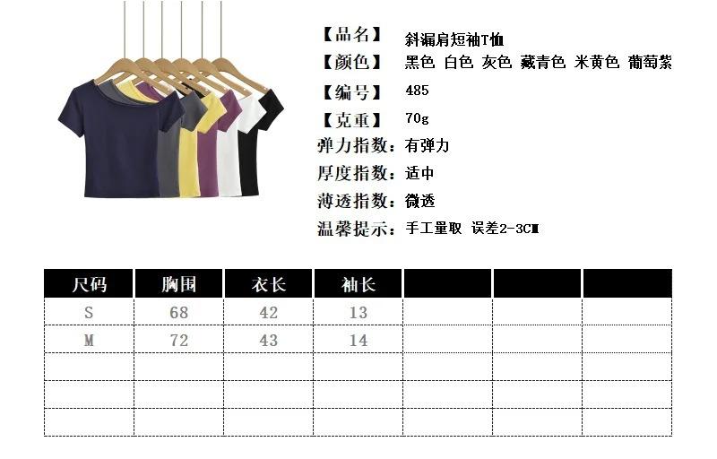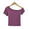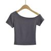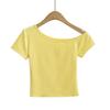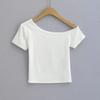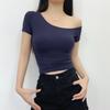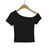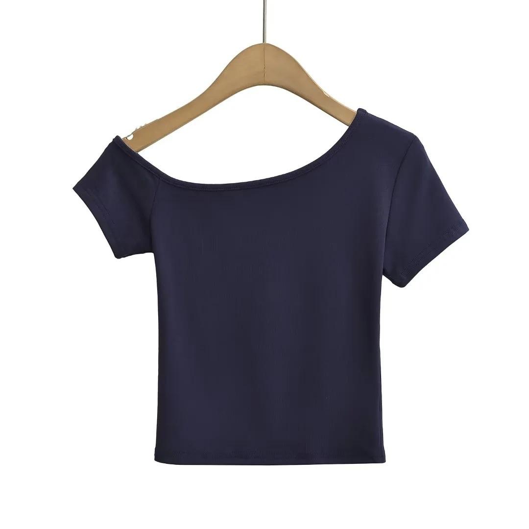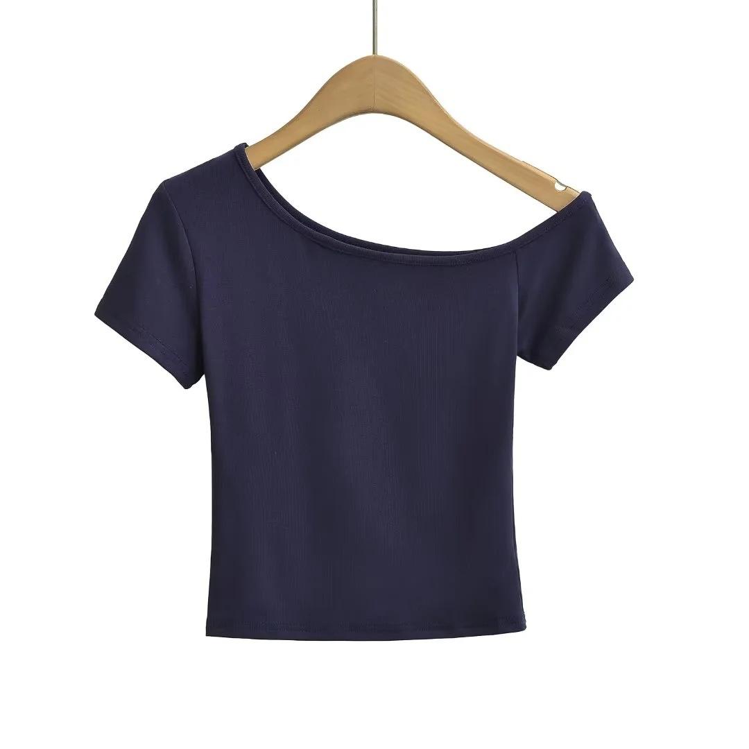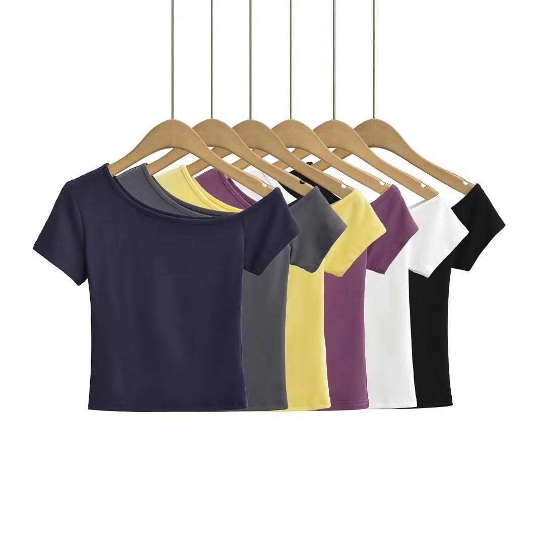 Estilo americano Slim-fit 2024 Verão Nova Cor Sólida Curta Top Feminino Nicho Ombro Inclinado Design Garota Quente Camiseta de manga curta