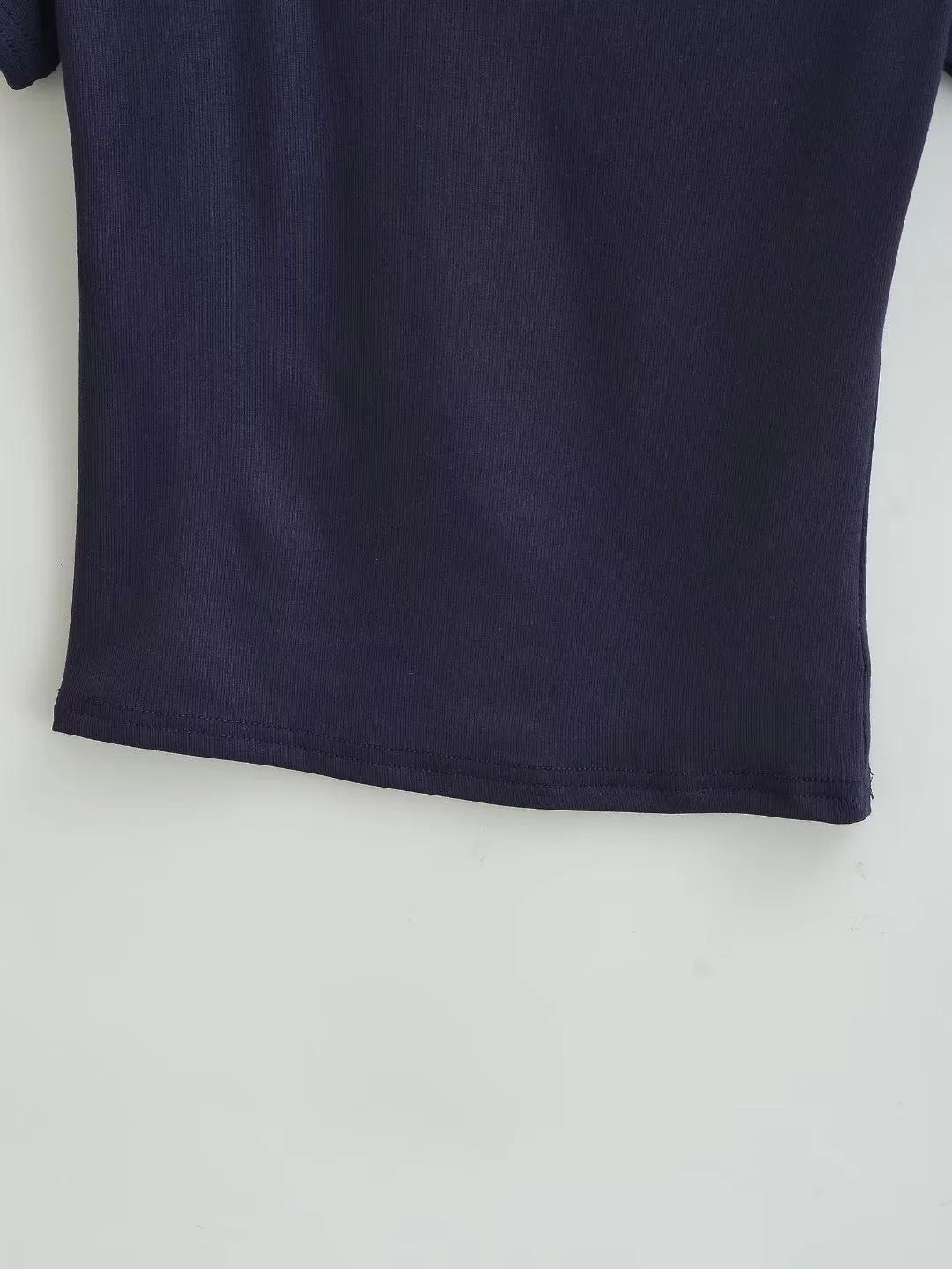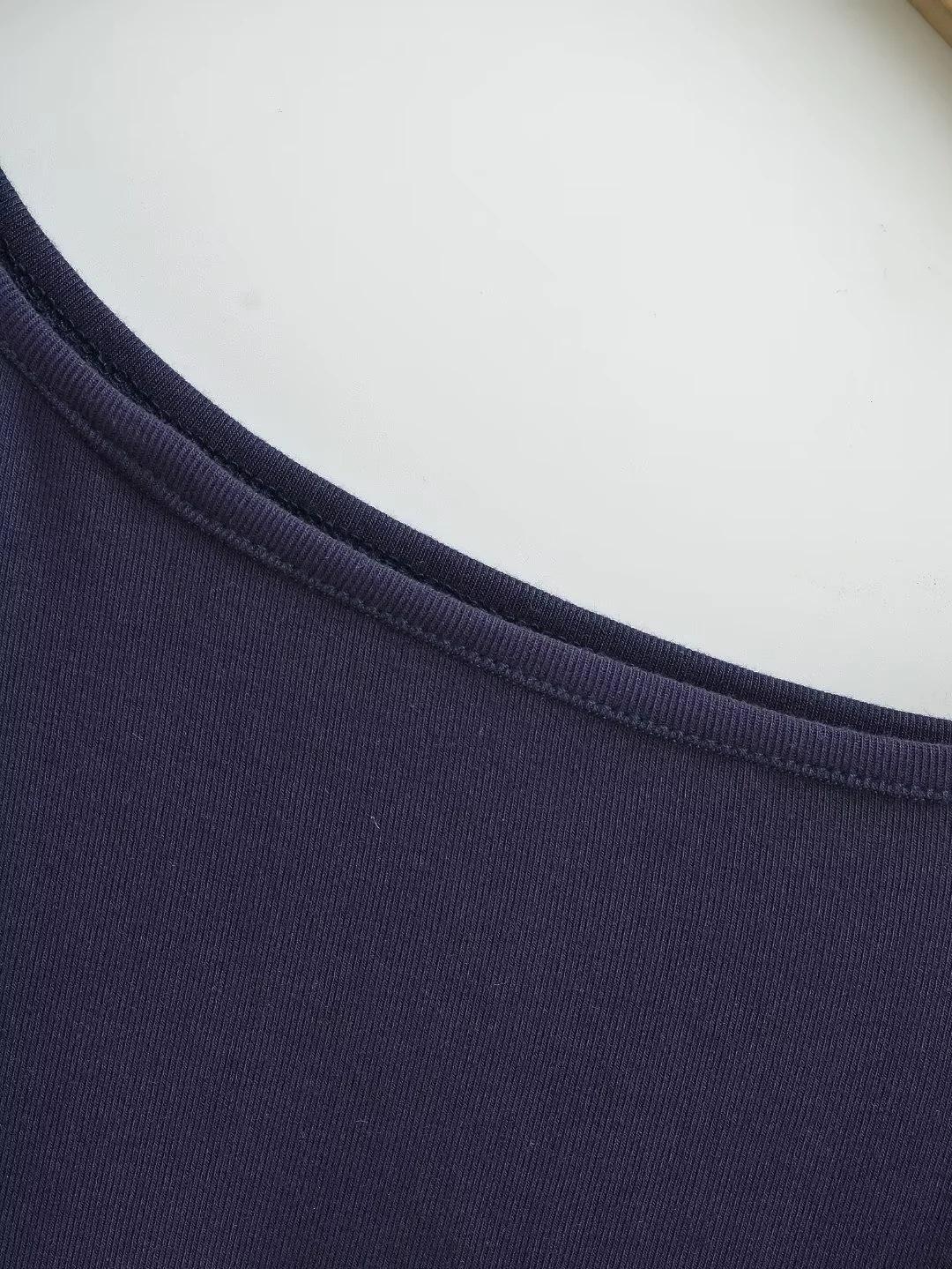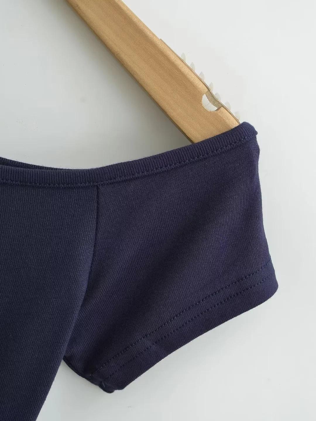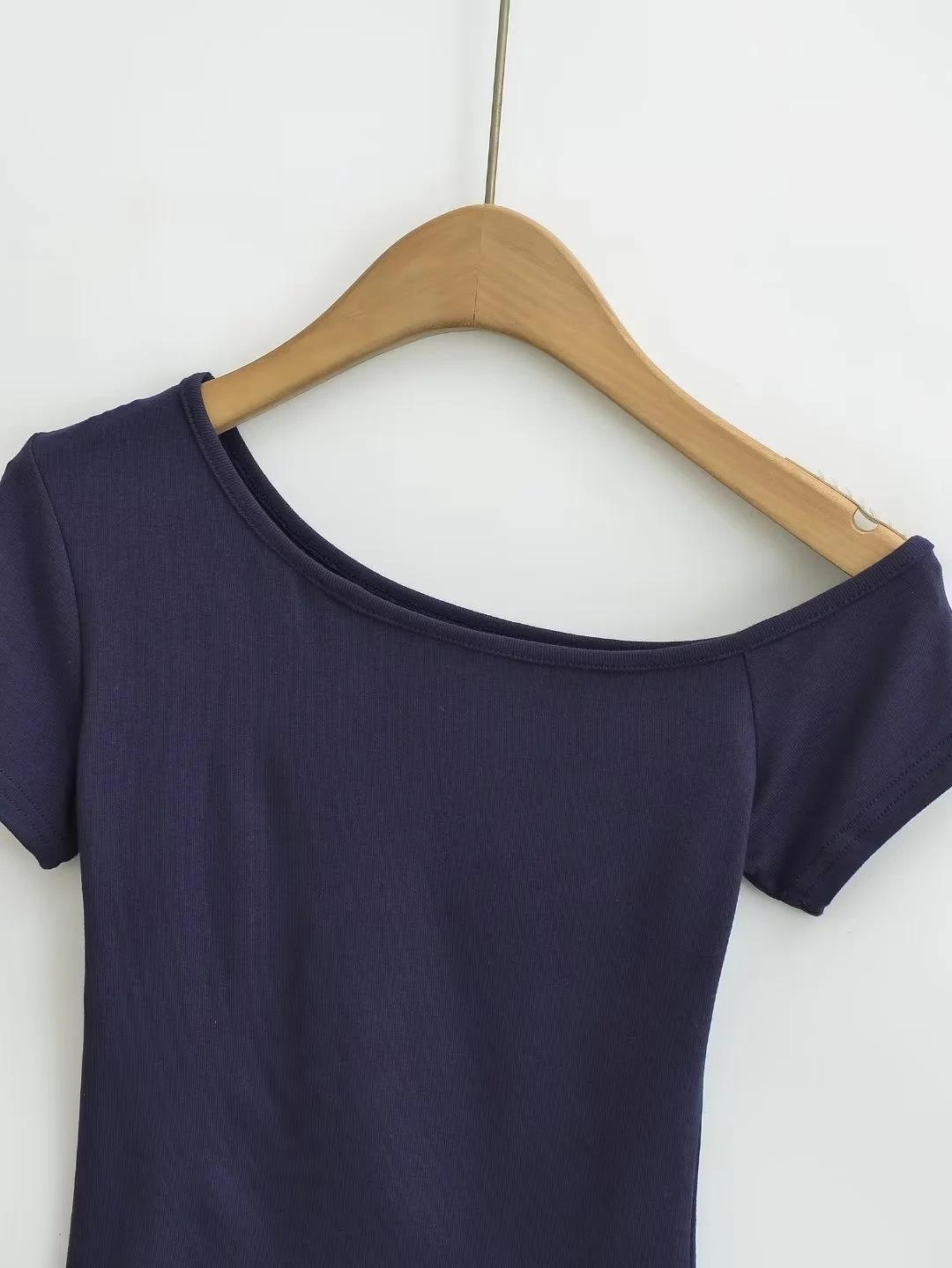 Estilo americano Slim-fit 2024 Verão Nova Cor Sólida Curta Top Feminino Nicho Ombro Inclinado Design Garota Quente Camiseta de manga curta