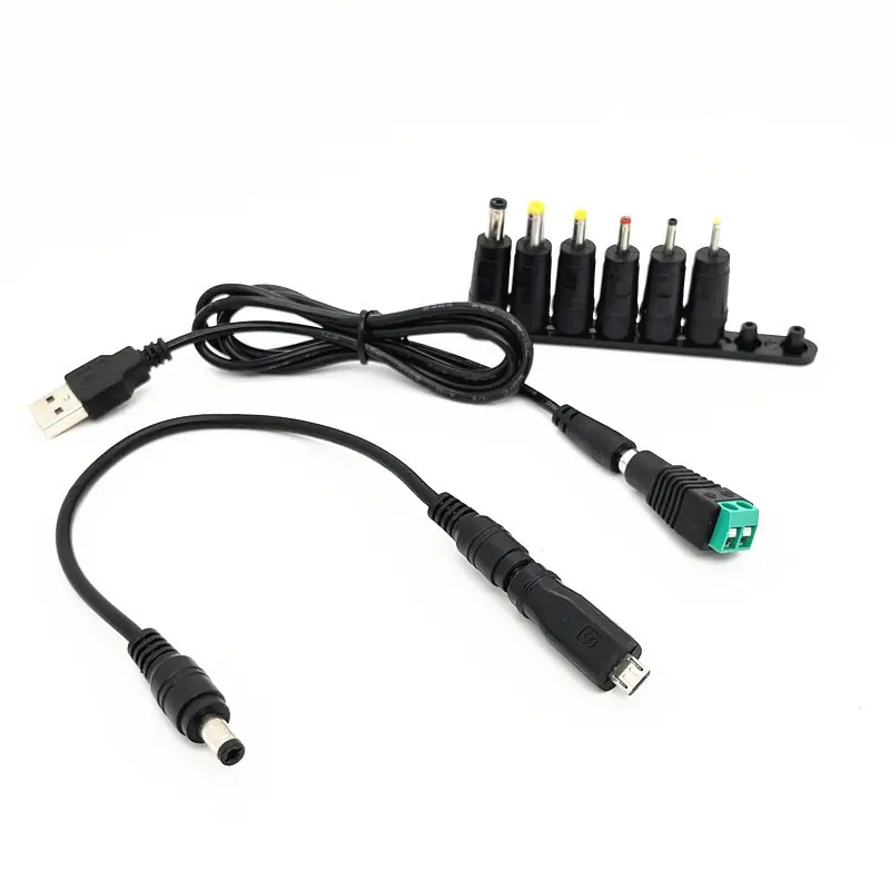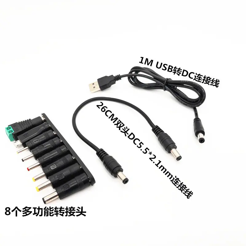 Os tamanhos dos 8 conectores machos são: 1: 5,5*2,5 2: 5,5*2,1 3: 4,0*1,7 4: 3,5*1,35 5: 3,0*1,1 6: 2,5*0,7 7:Micro USB Android 8: Não há necessidade de soldar positivo e negativo