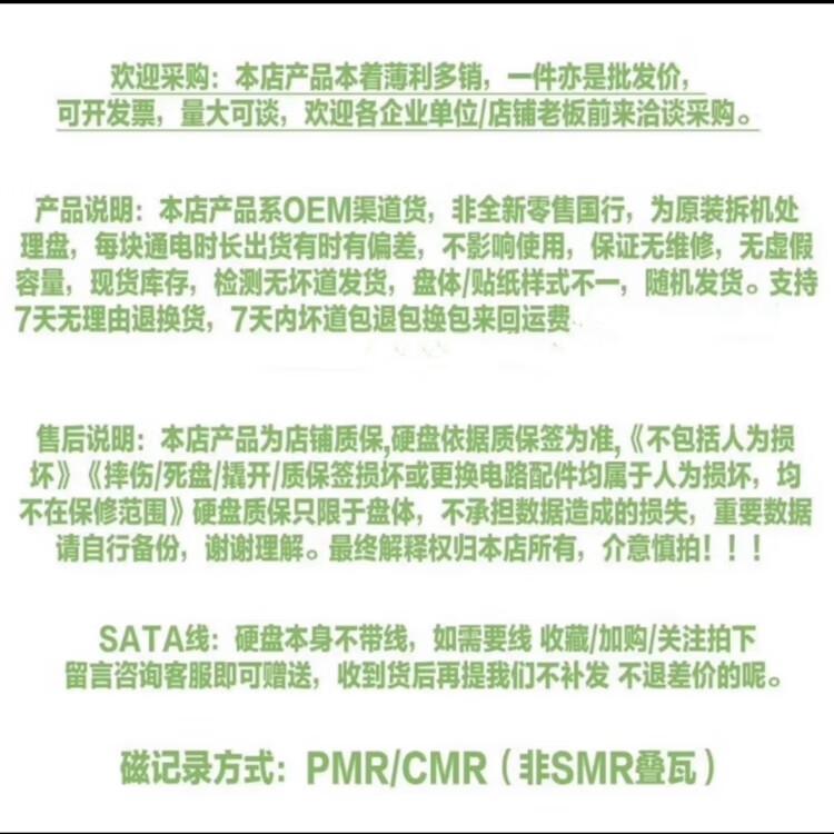 Primeiro: Os preços de todos os produtos nesta loja não incluem notas fiscais! Por favor, solicite a fatura conscientemente! Tecnologia CMR! Todo o disco é enviado sem setores defeituosos! Segundo: Esta loja vende produtos de canal OEM, não de varejo doméstico e com garantia conjunta doméstica. Os produtos na loja são todos discos rígidos usados que não são garantidos pela loja doméstica. Devido à transferência das condições de garantia, garantia conjunta e consulta não são suportadas. Entre em contato com esta loja para garantia! Se você precisar de um disco rígido com garantia conjunta do banco doméstico, entre em contato com o atendimento ao cliente manual! O estoque disponível é ligado sem energia! Terceiro: Suporte para 7 dias sem motivo! O gravador de vídeo e a placa-mãe do host desktop são incompatíveis e danificados, e nenhum reembolso ou garantia será fornecido para discos rígidos queimados! É melhor devolver a embalagem original para todas as devoluções e trocas por correio! Preste atenção à embalagem de enchimento interna para evitar danos, caso contrário, não será devolvido ou trocado! O novo gravador de vídeo é incompatível com o disco desmontado usado, causando danos ao disco rígido e nenhum reembolso será fornecido! ! (Gravadores de vídeo TP prestam atenção especial) Certifique-se de embalar os produtos na embalagem original ou embalá-los bem com materiais de enchimento de espuma. Se estiverem danificados, nenhum reembolso será fornecido. (Preste atenção especial à voltagem do disco rígido. Quarto: A cabeça se solta e o disco rígido congela devido a quedas repentinas de energia por parte do comprador. Tudo isso anulará a garantia. Quinto: Se precisar interceptar os produtos, pague 5% do custo do produto você mesmo. Espero que entenda. Problemas de qualidade não suportarão o reembolso do preço original!!