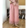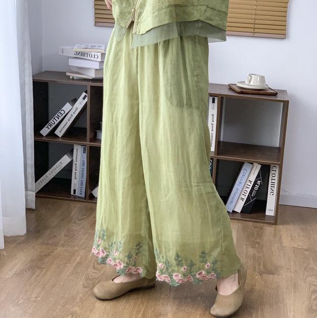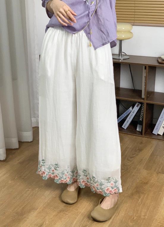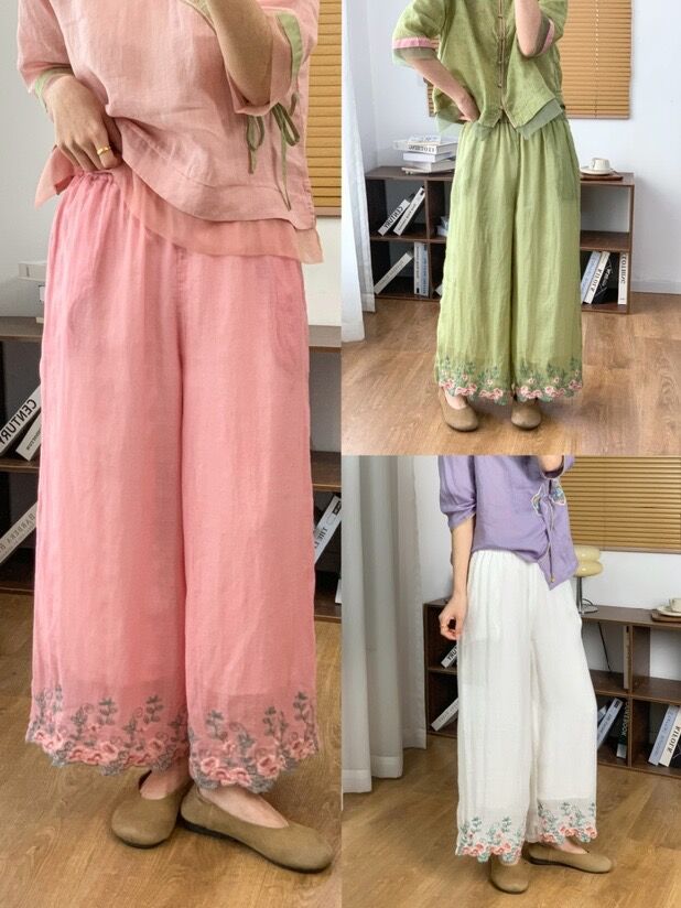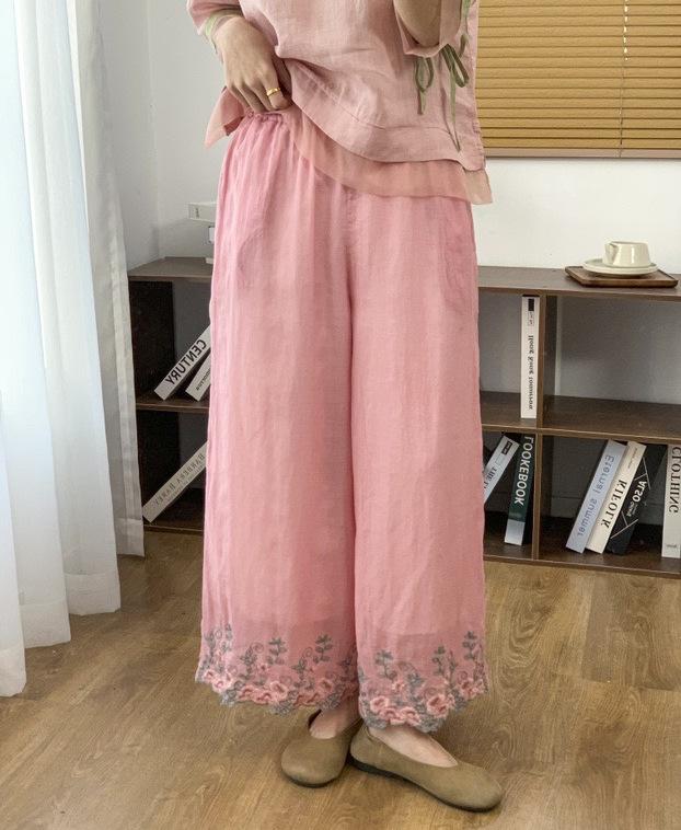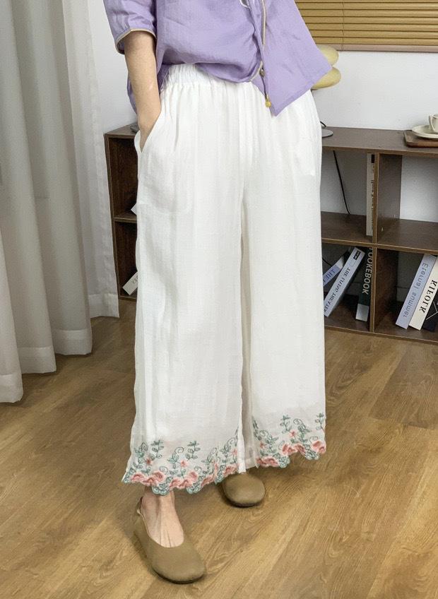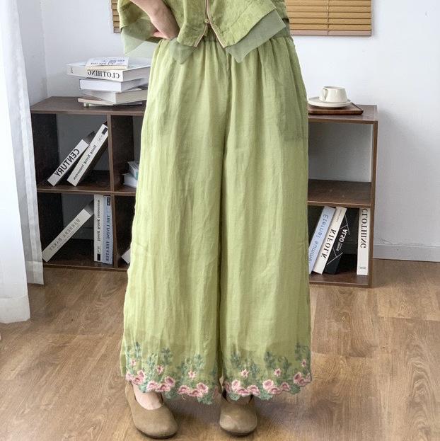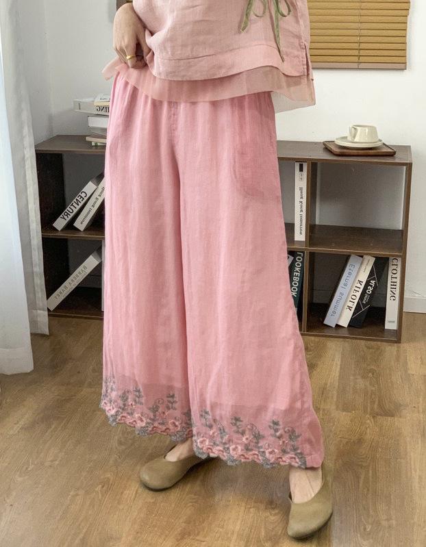 2025 Verão Novas Calças de Perna Larga de Algodão e Linho Estilo Nacional Vintage Bordado Solto Slimming Calças Casuais para Mulheres