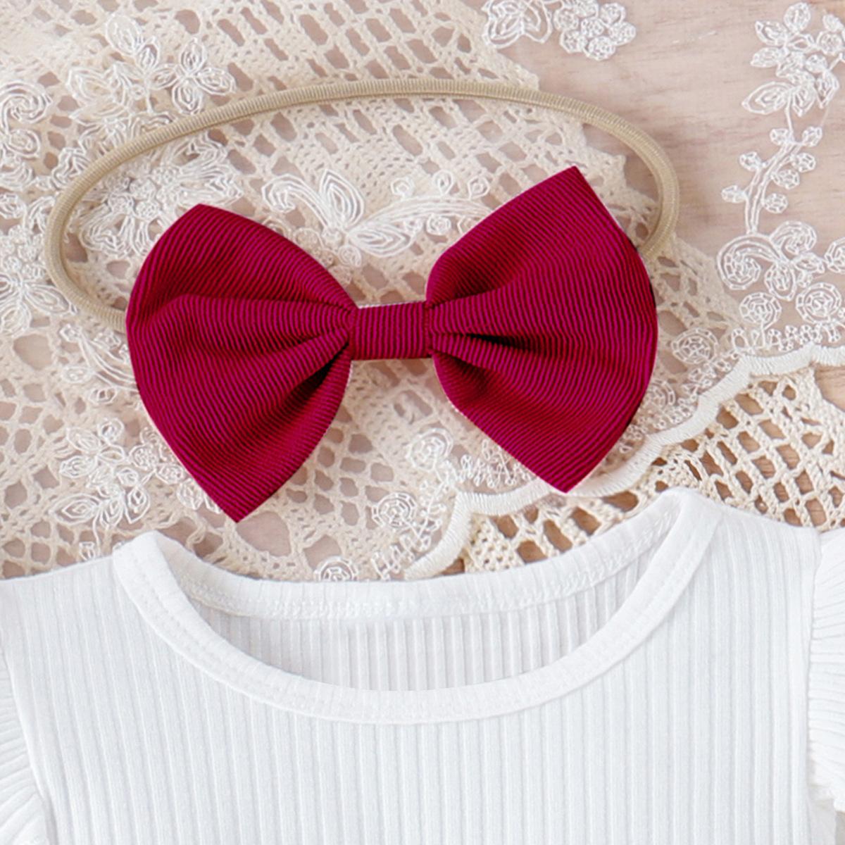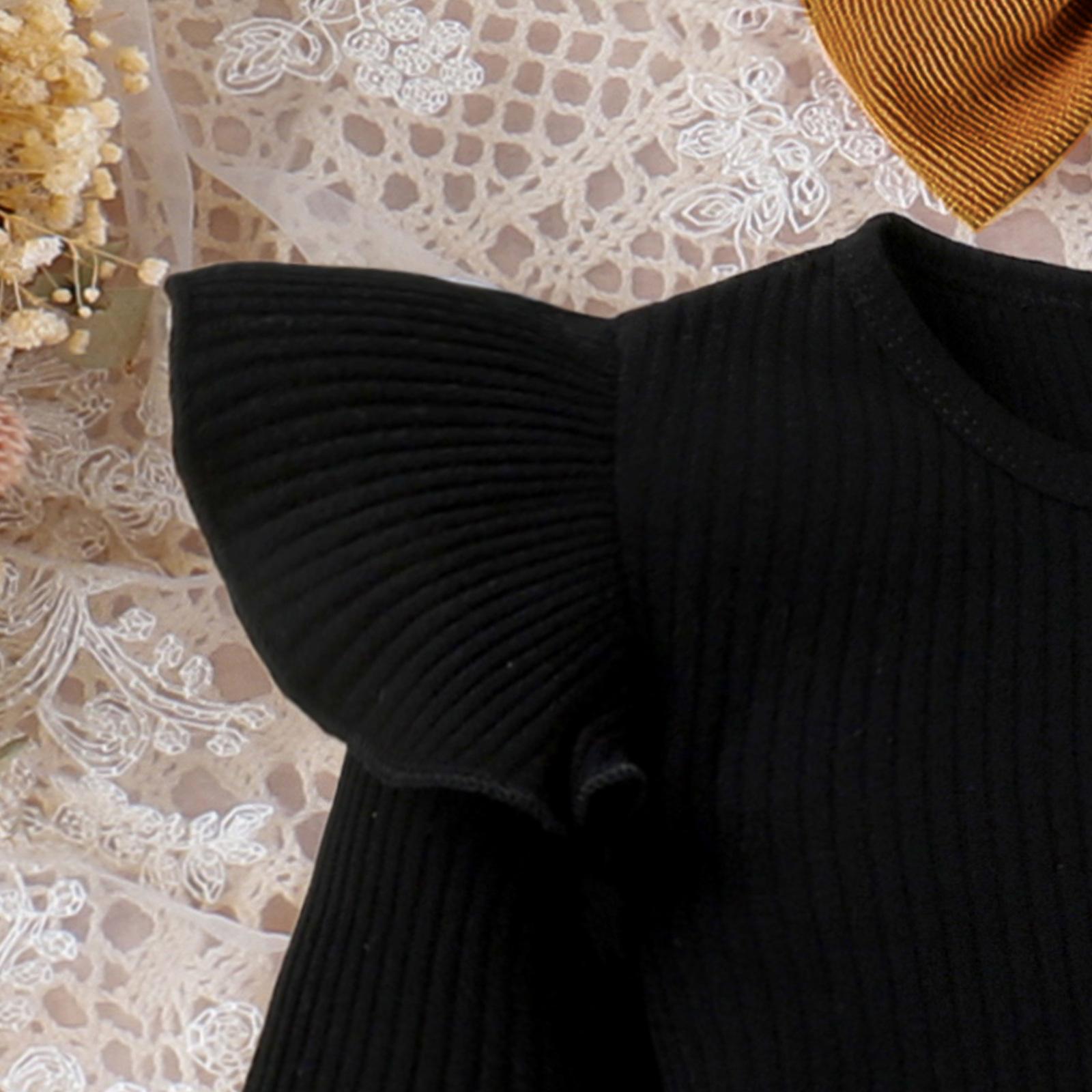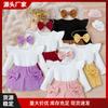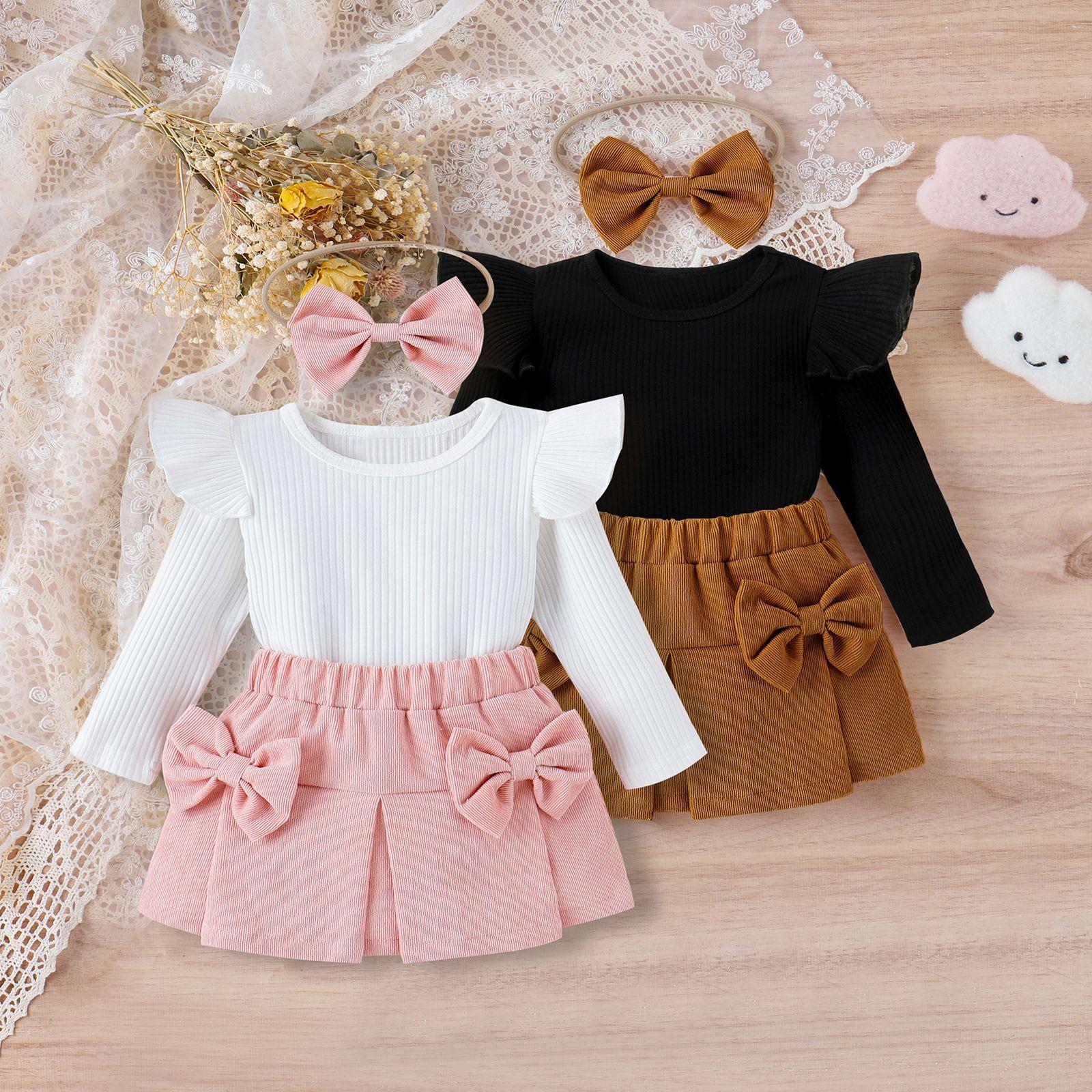 Europeu e Americano Outono e Inverno Bebê Listra Pit Manga Voadora Manga Longa Top Saia Curta com Laço de Veludo Cinto de Cabelo Roupa de Menina