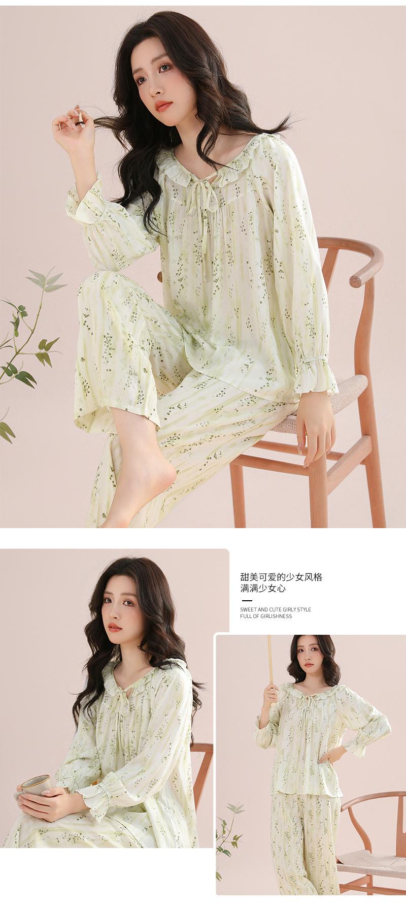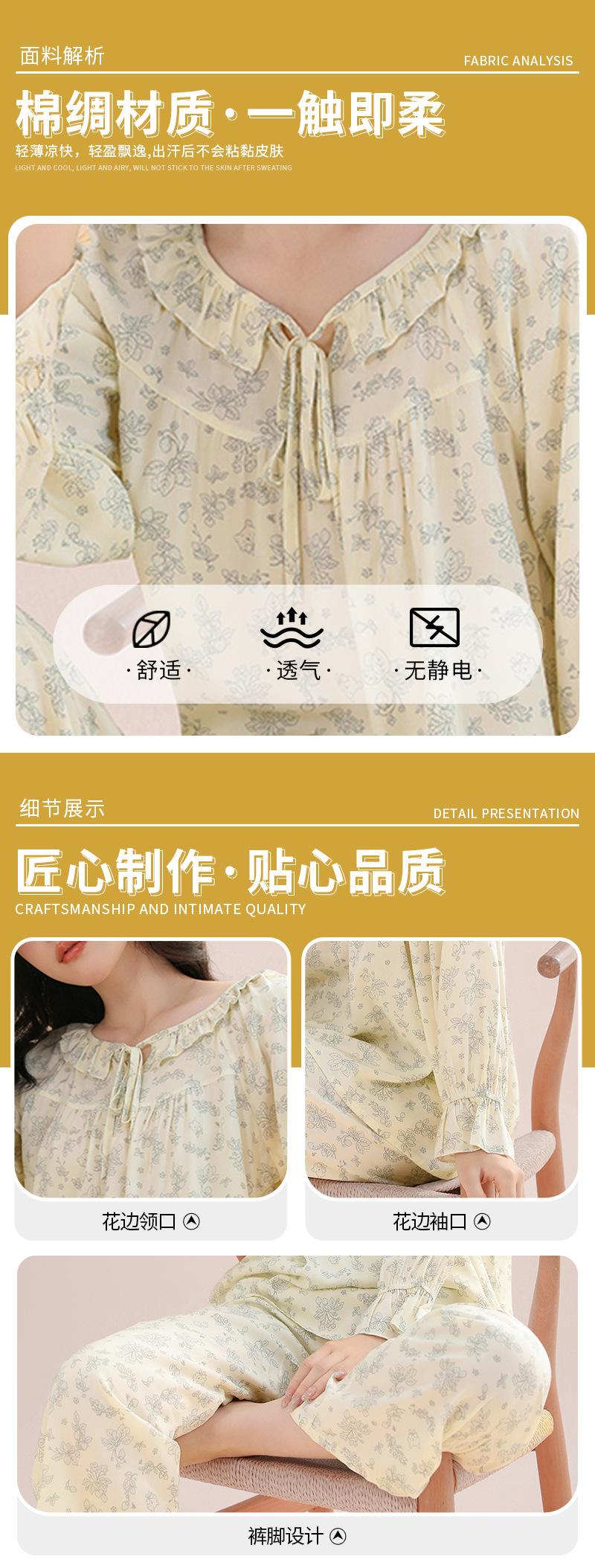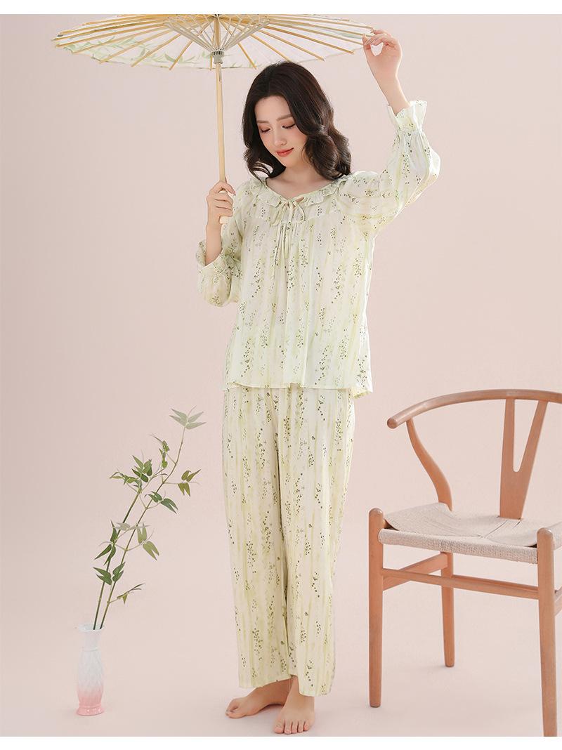 Pijama feminino de algodão e seda, macio e confortável, respirável, solto, com cadarço, calças de manga comprida para uso em casa