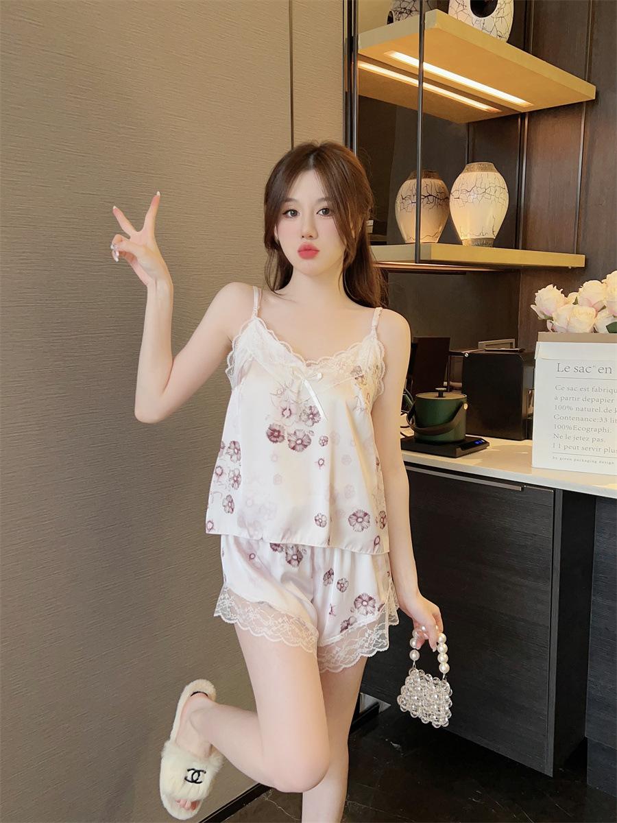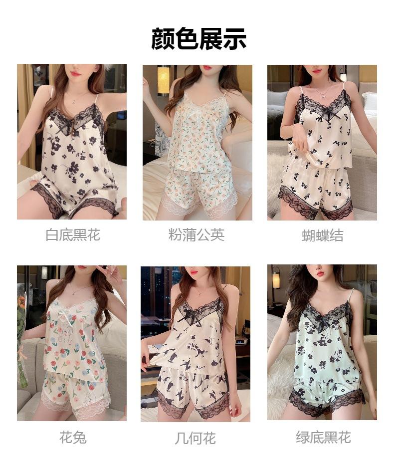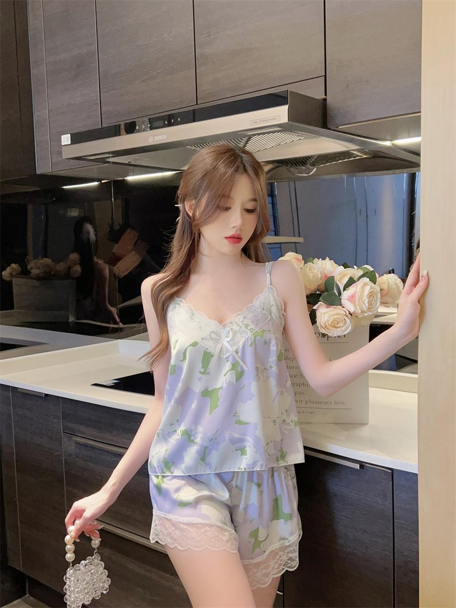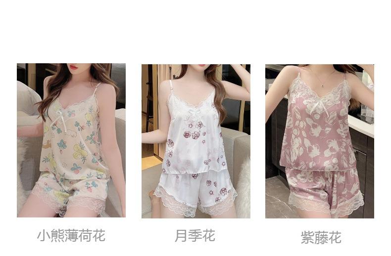 Pijama feminino de verão, novo, sexy, de seda gelada, camisola, shorts, renda, casual, estampado, roupa de casa