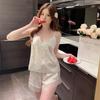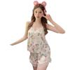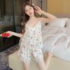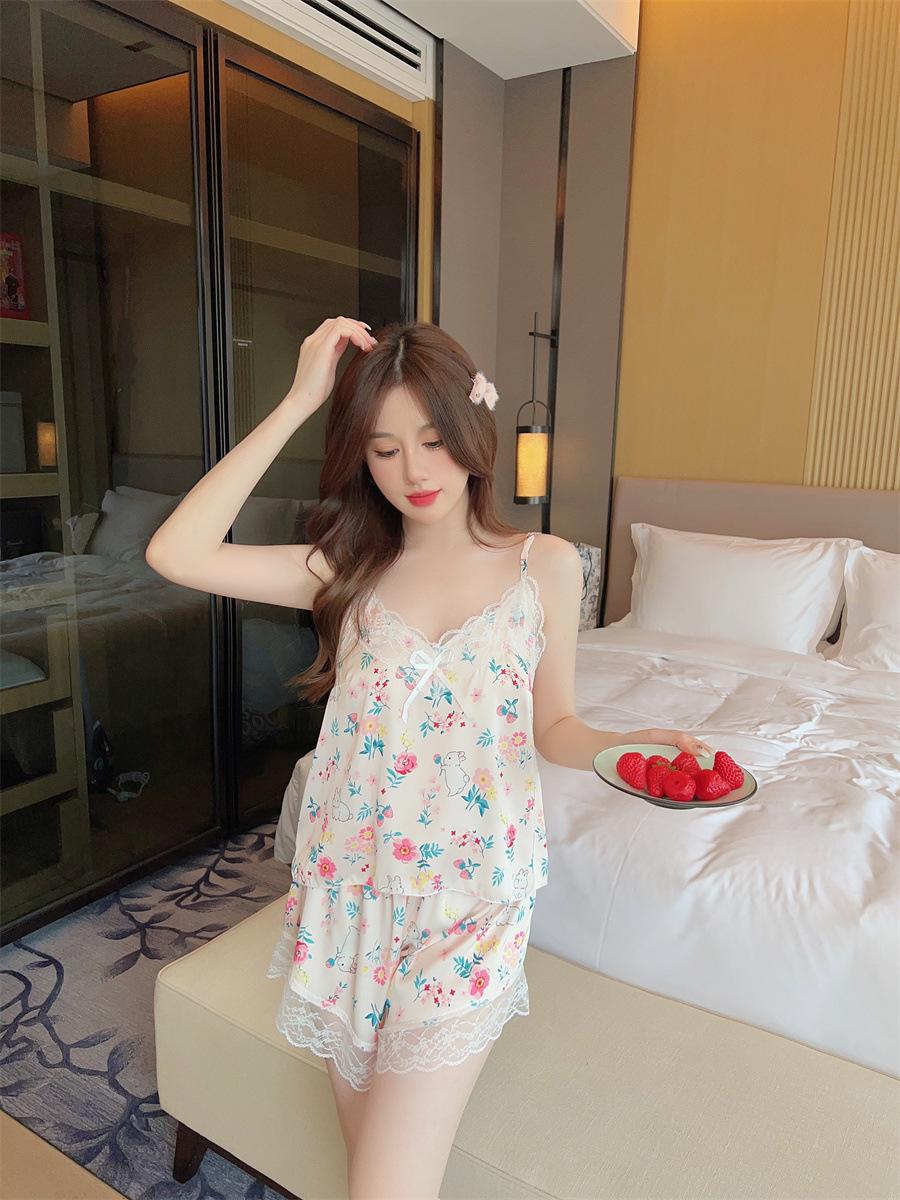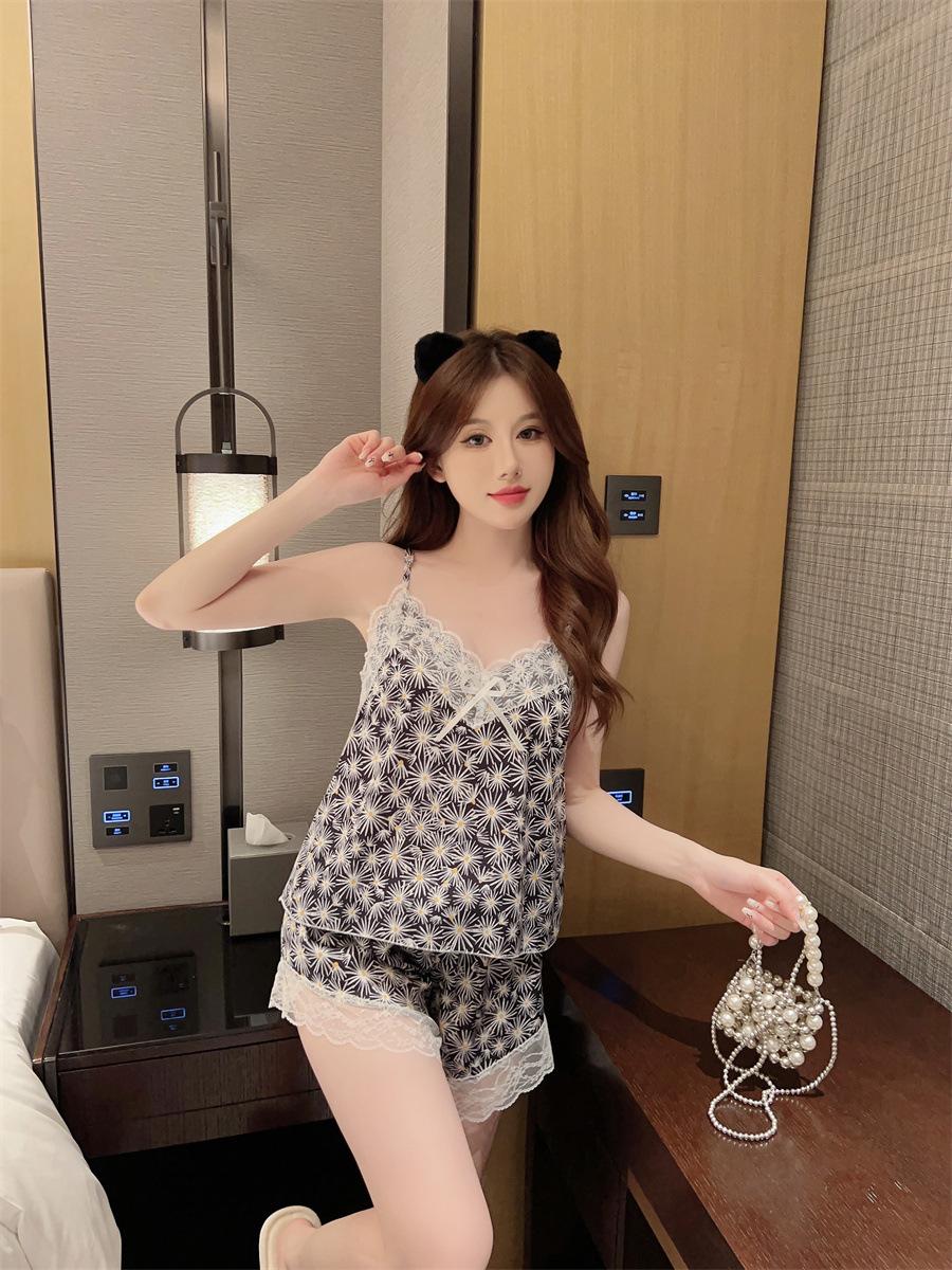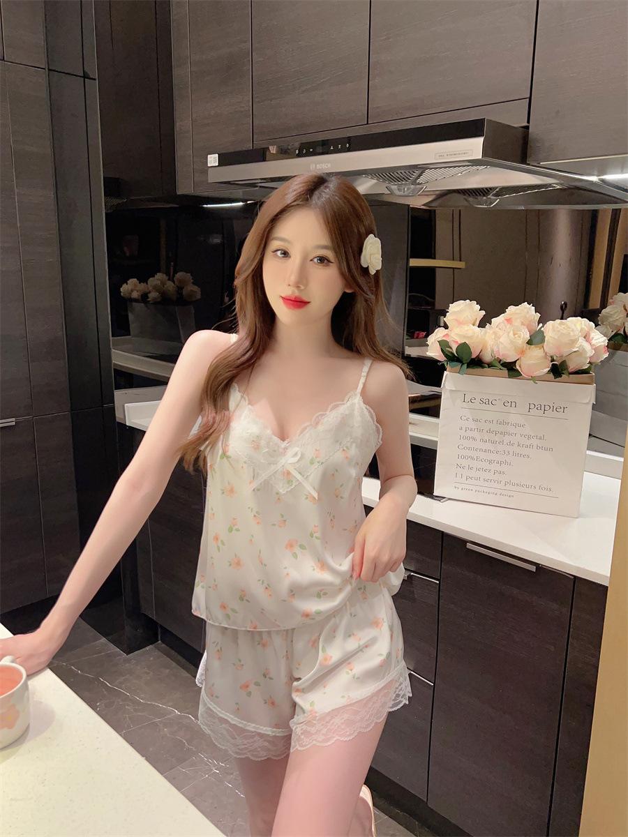 Pijama feminino de verão, novo, sexy, de seda gelada, camisola, shorts, renda, casual, estampado, roupa de casa