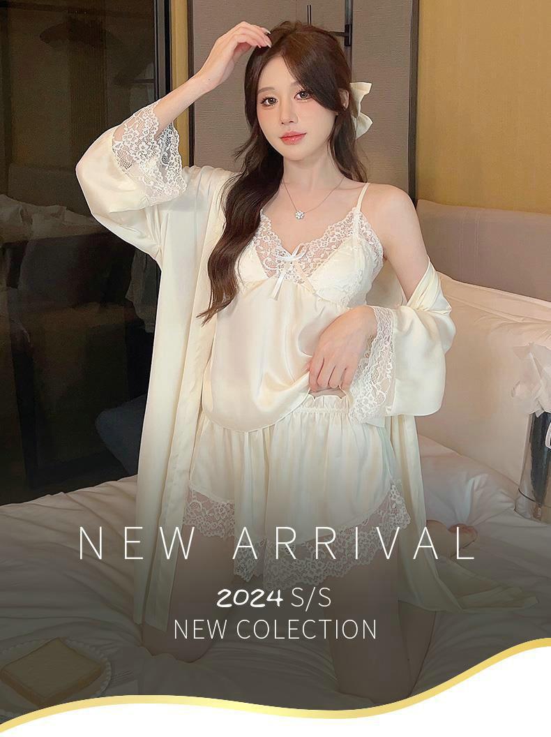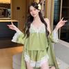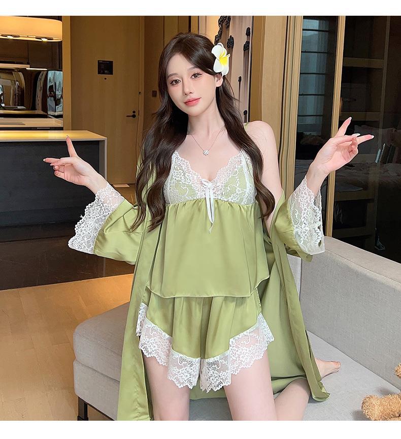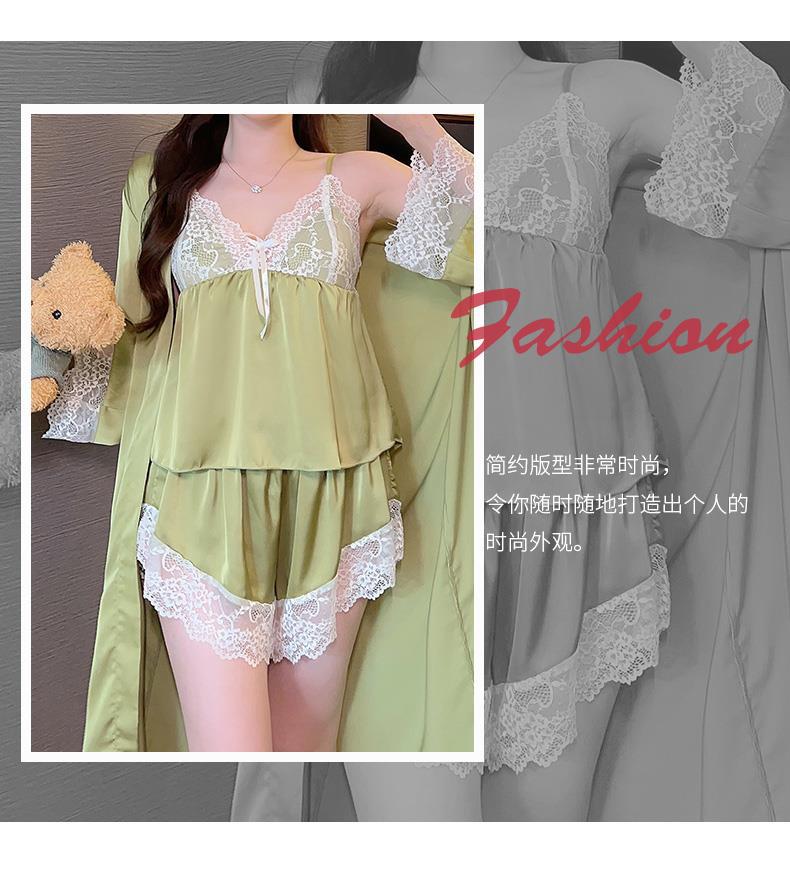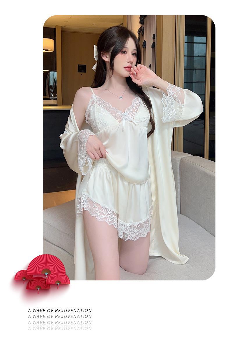 Novo Pijama Feminino Estilo Sexy Conjunto de Três Peças com Bojo Regata Shorts Conjunto Seda Gelo Cetim Renda Renda Pura