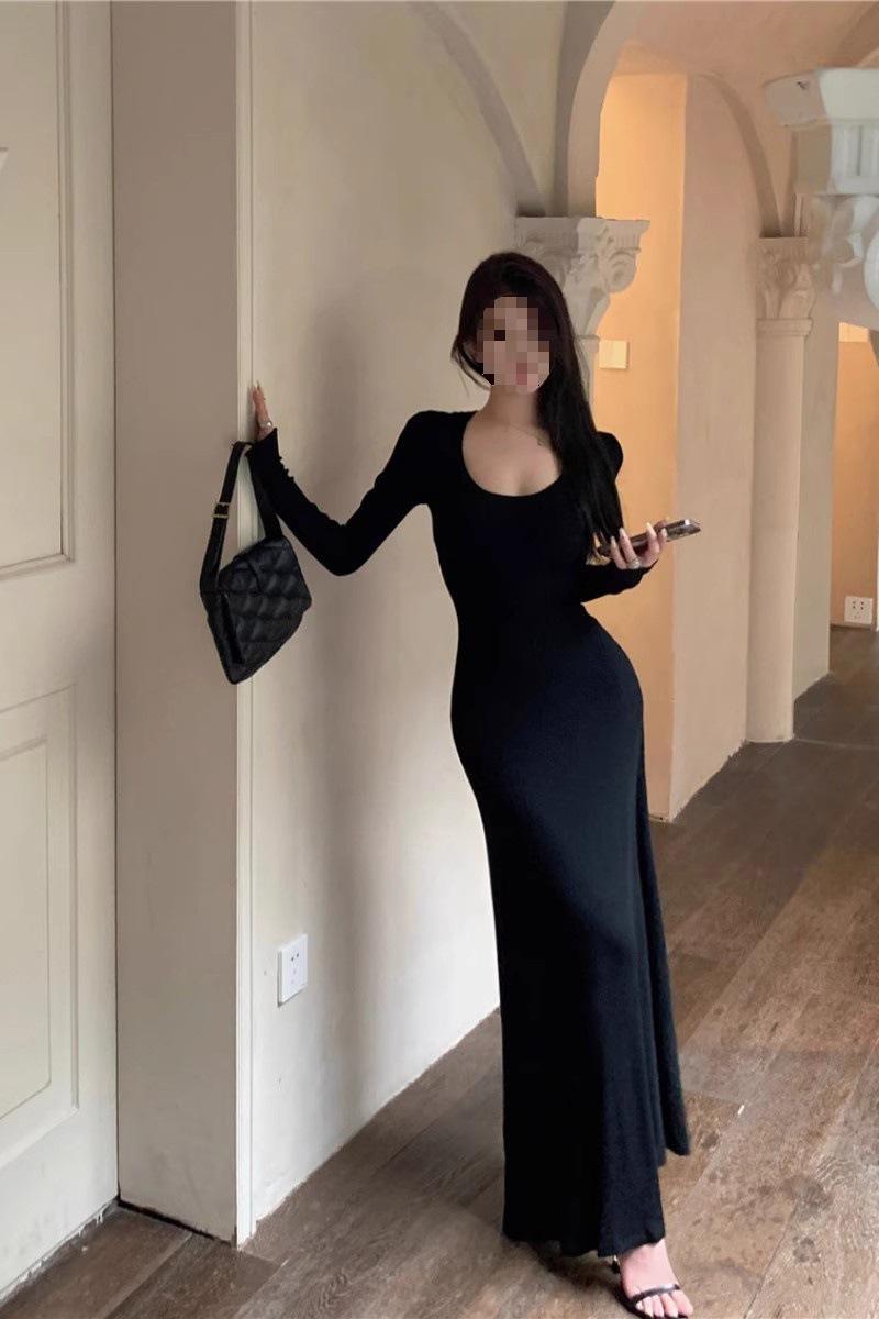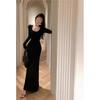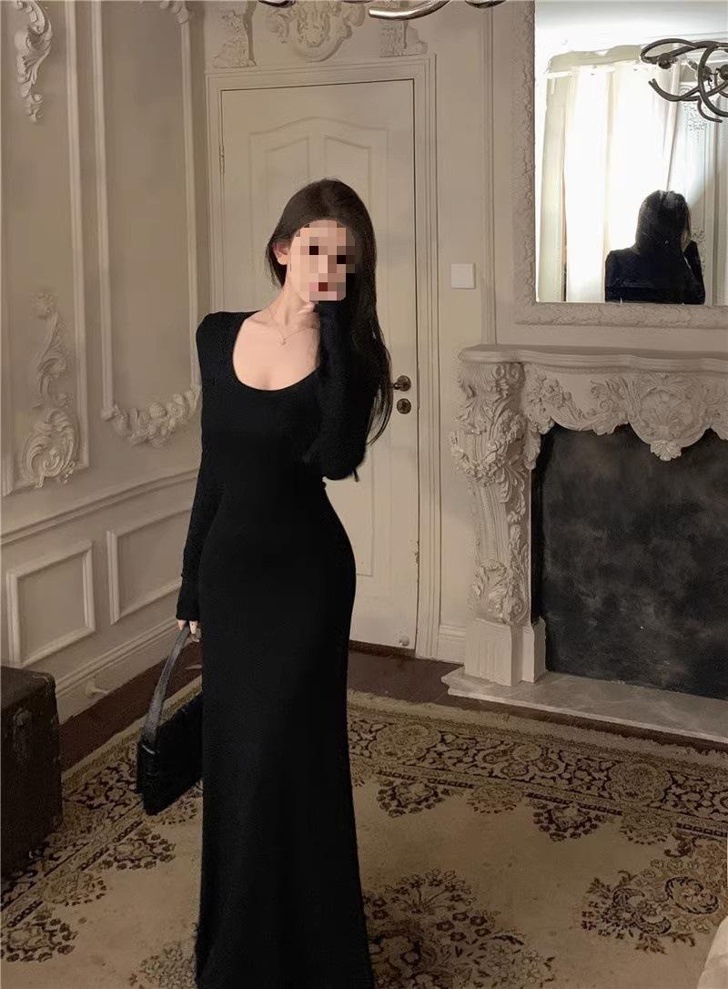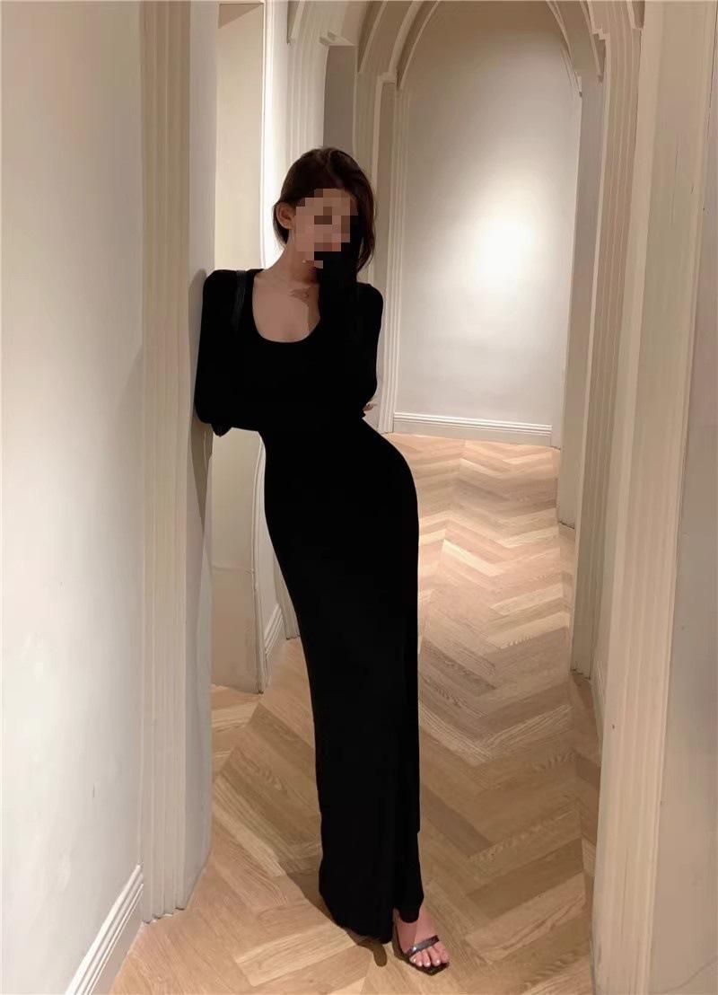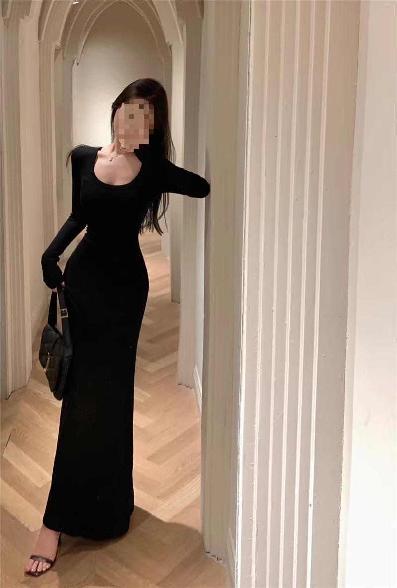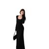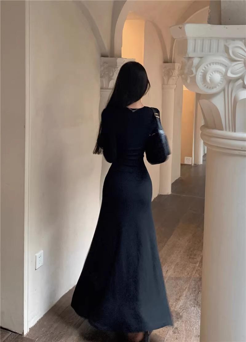 Vestido preto sexy europeu e americano de manga longa para mulheres, cintura justa, emagrecimento, bainha drapeada, vestido rabo de peixe