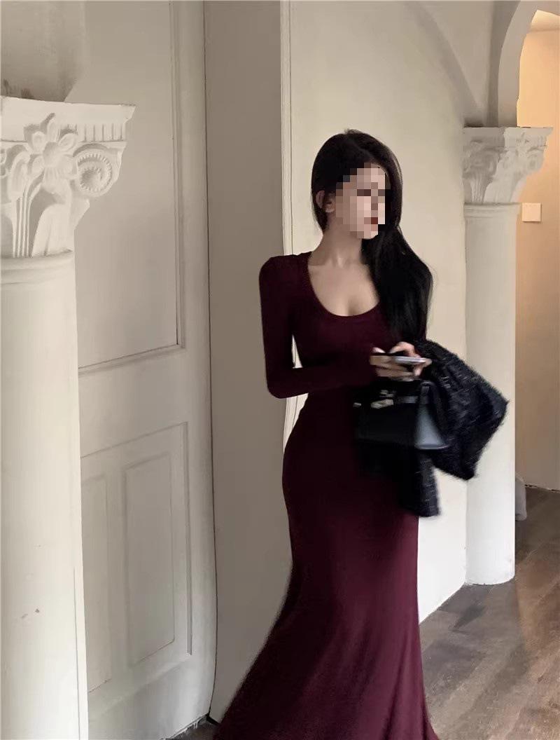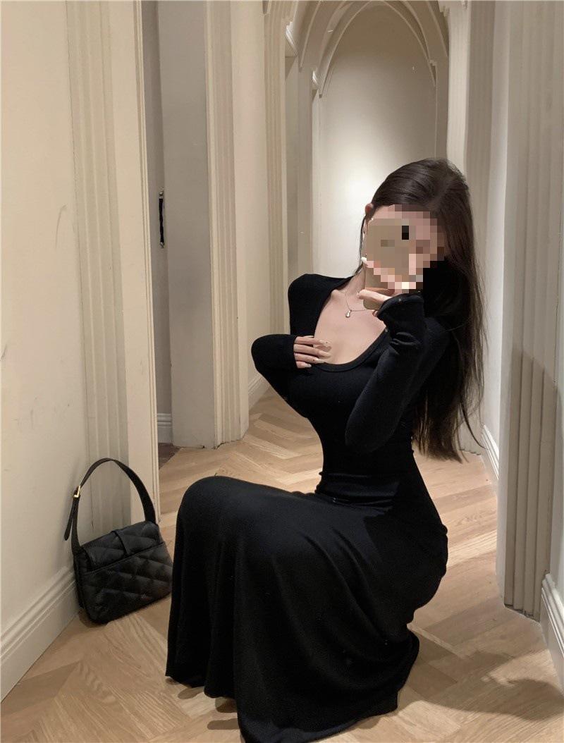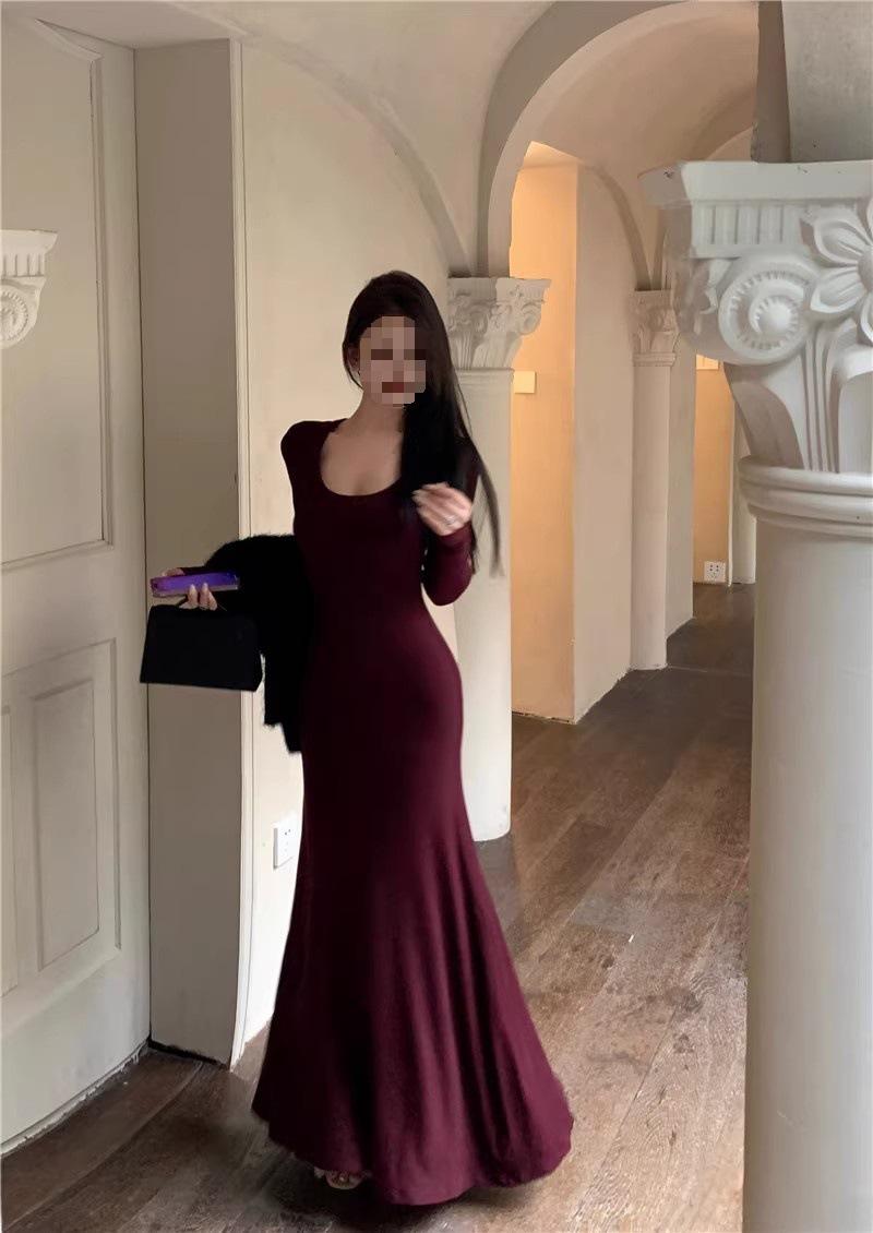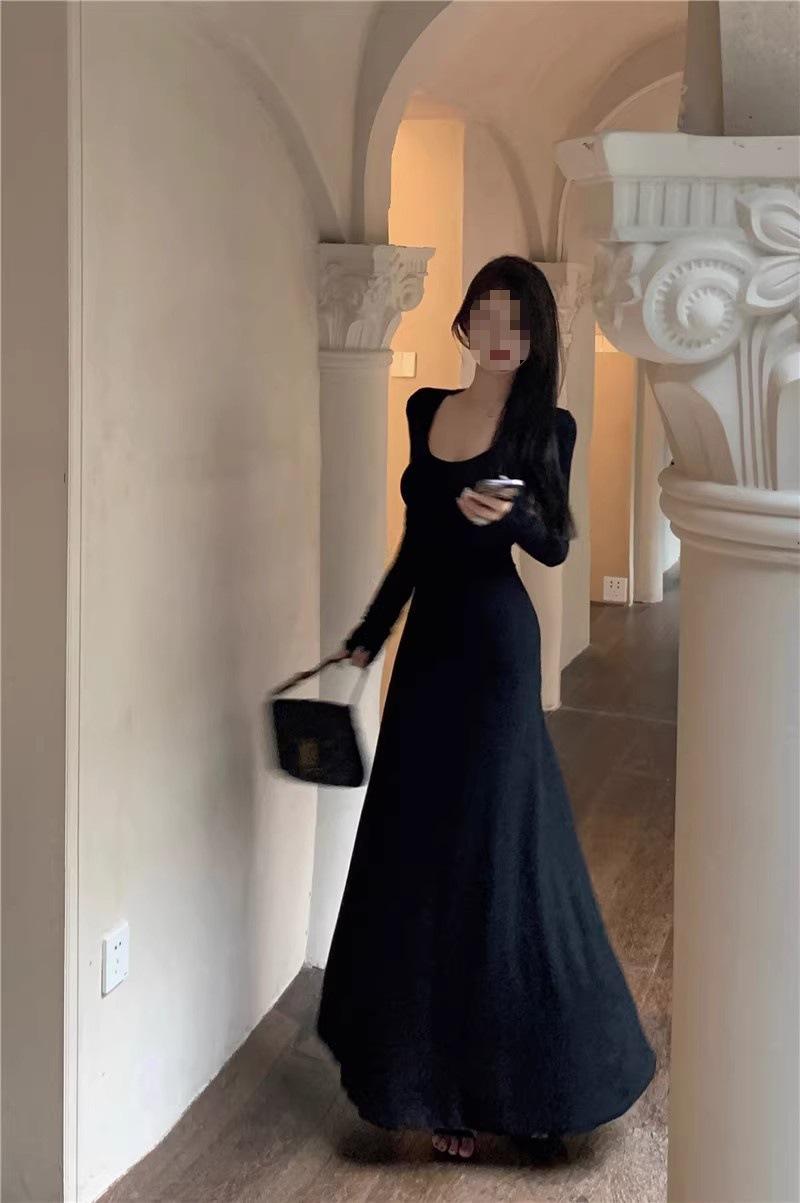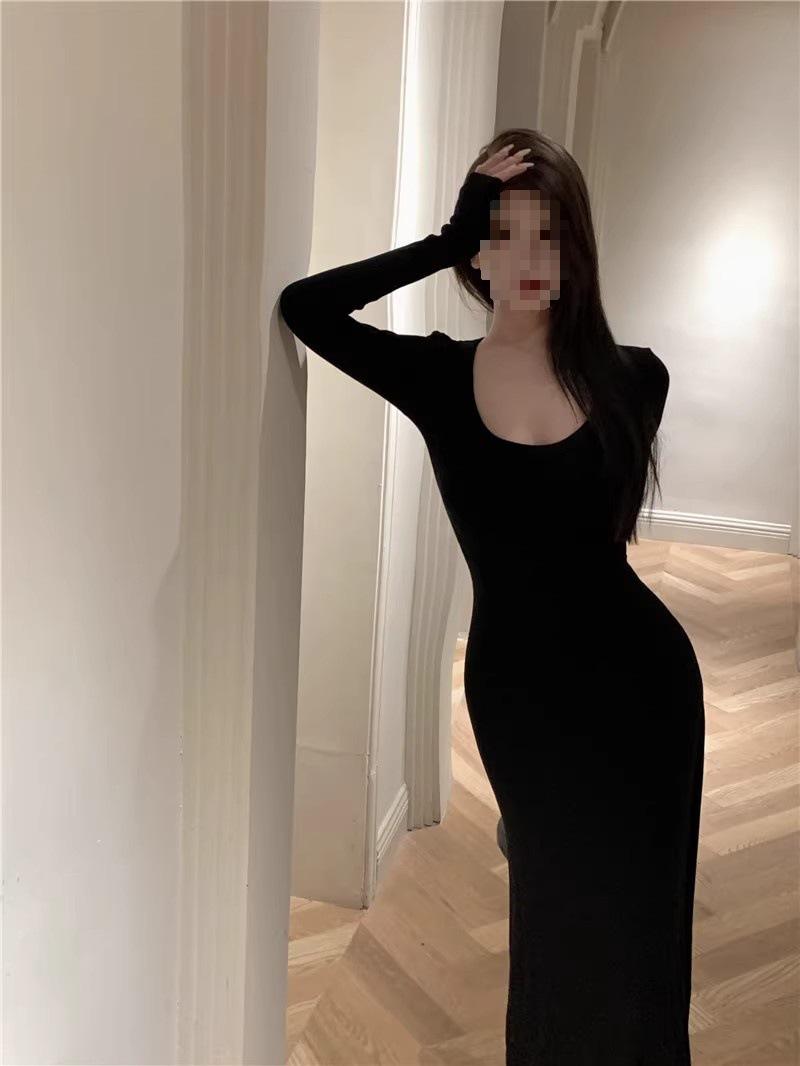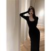 Vestido preto sexy europeu e americano de manga longa para mulheres, cintura justa, emagrecimento, bainha drapeada, vestido rabo de peixe
