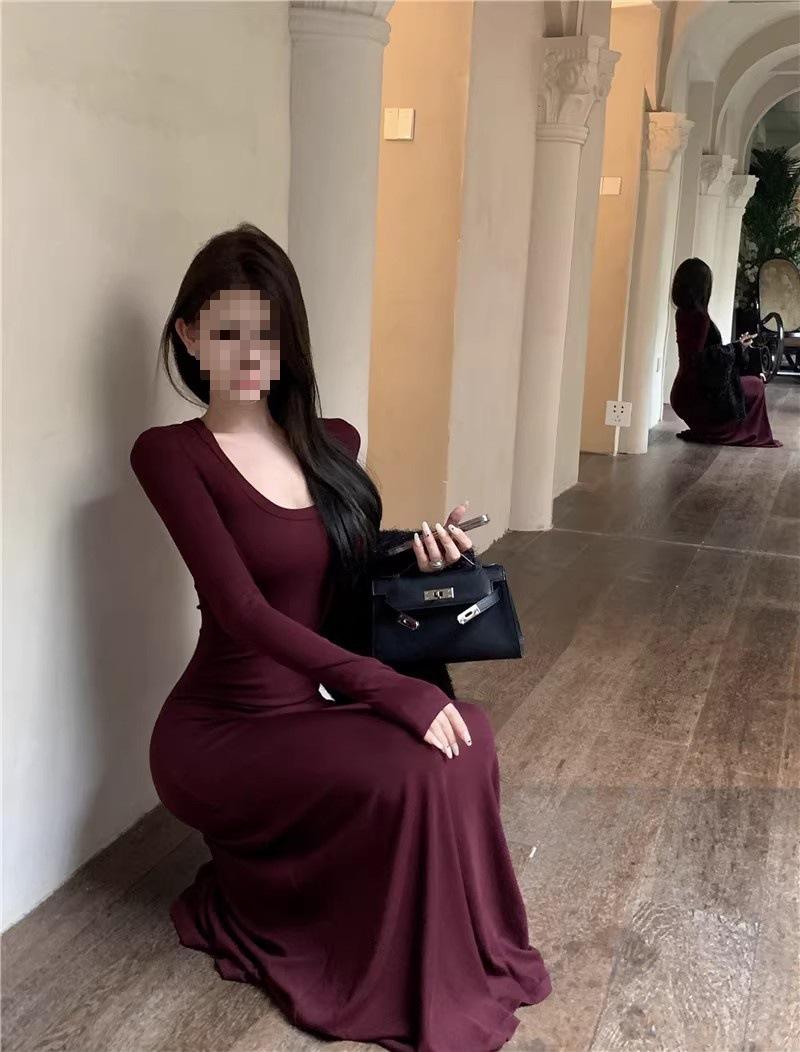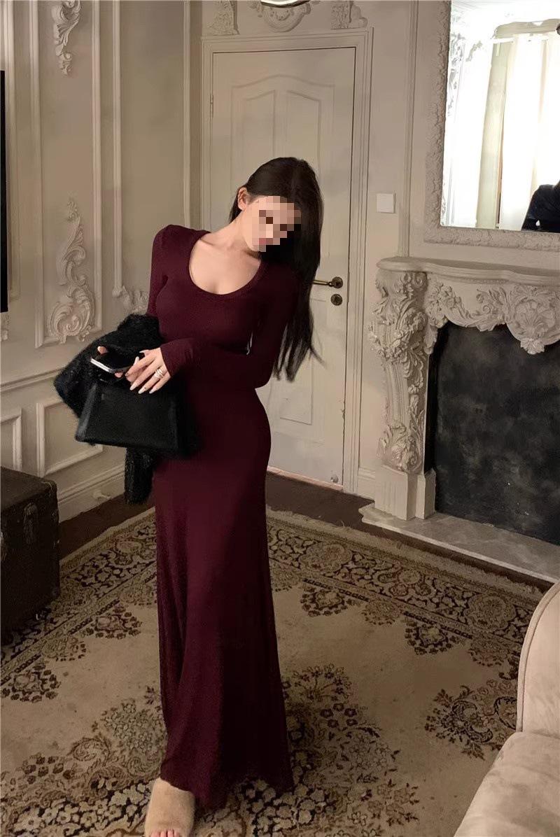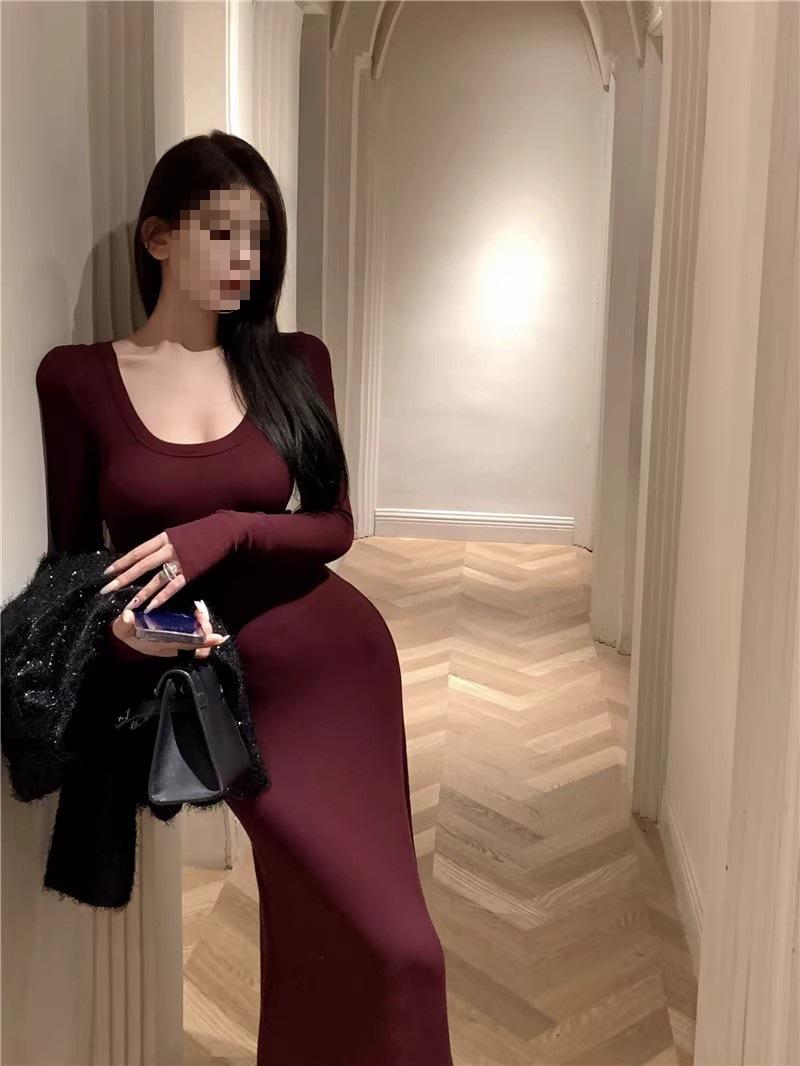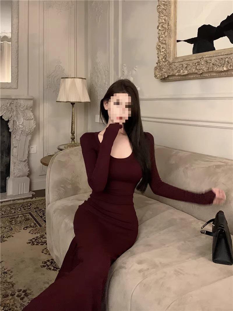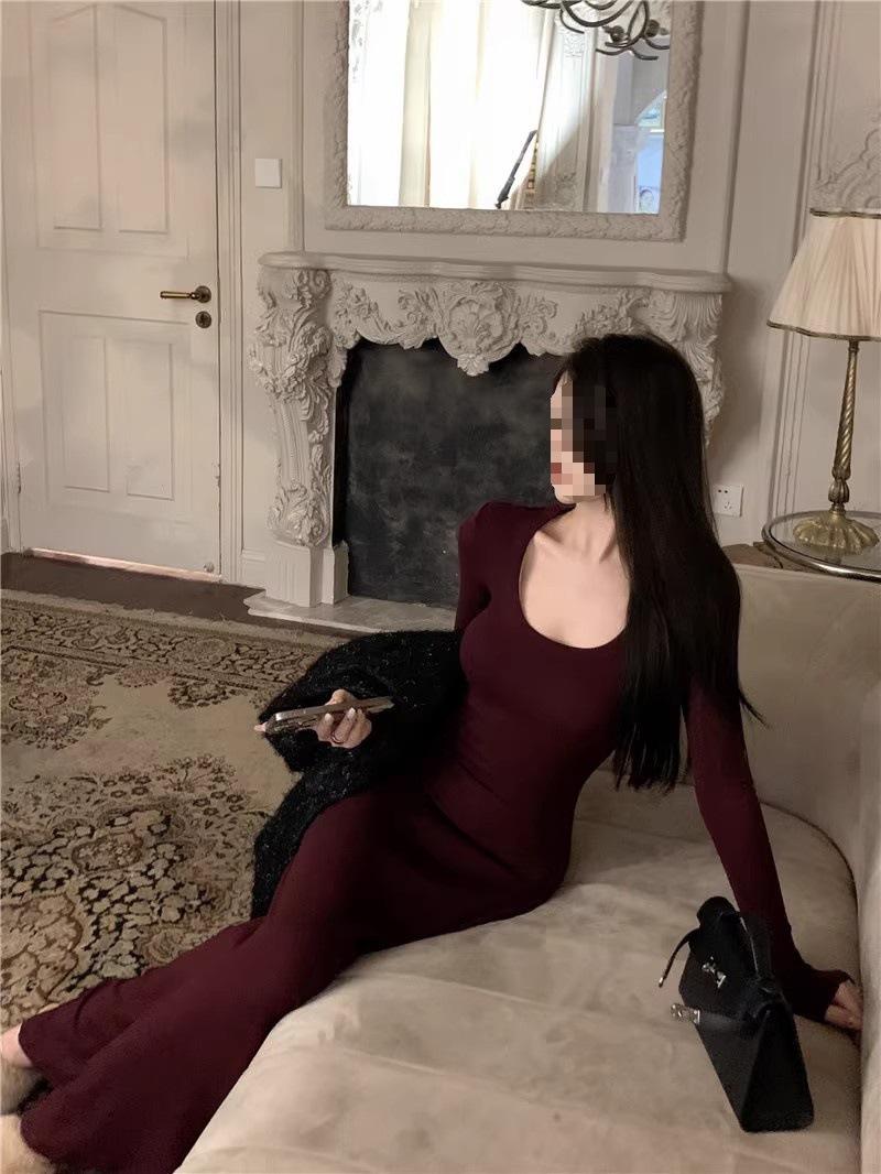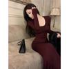 Vestido preto sexy europeu e americano de manga longa para mulheres, cintura justa, emagrecimento, bainha drapeada, vestido rabo de peixe