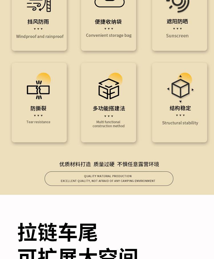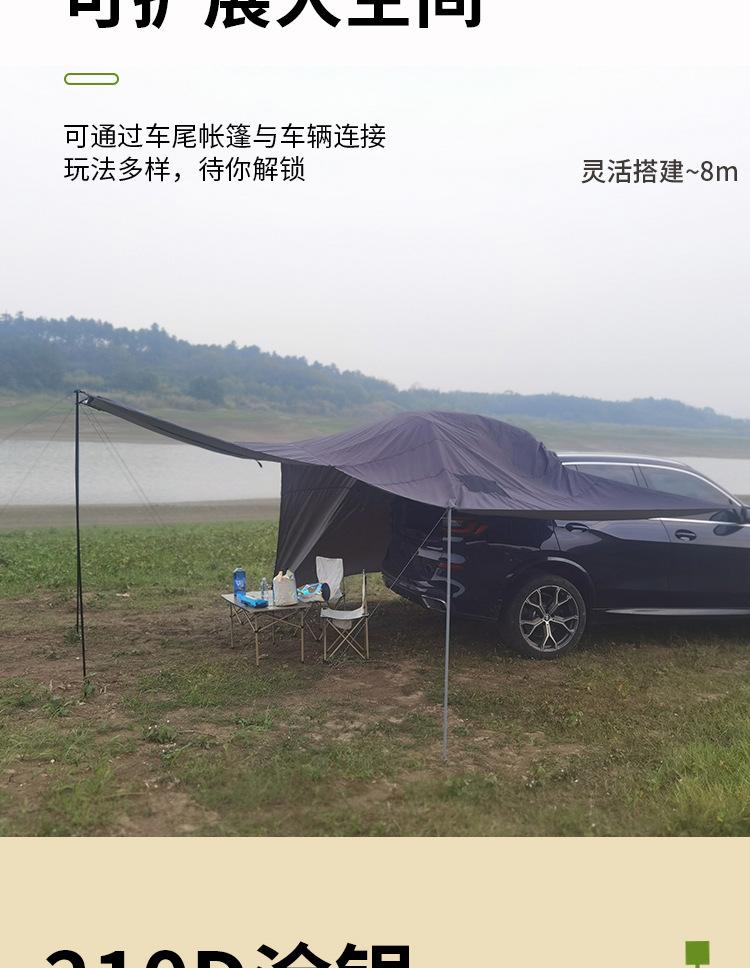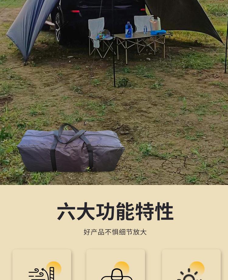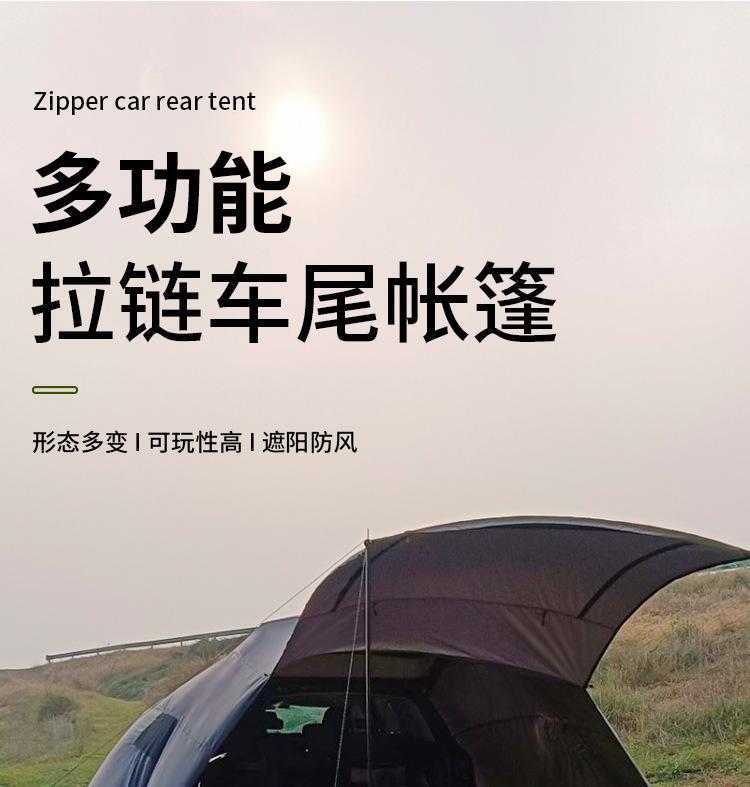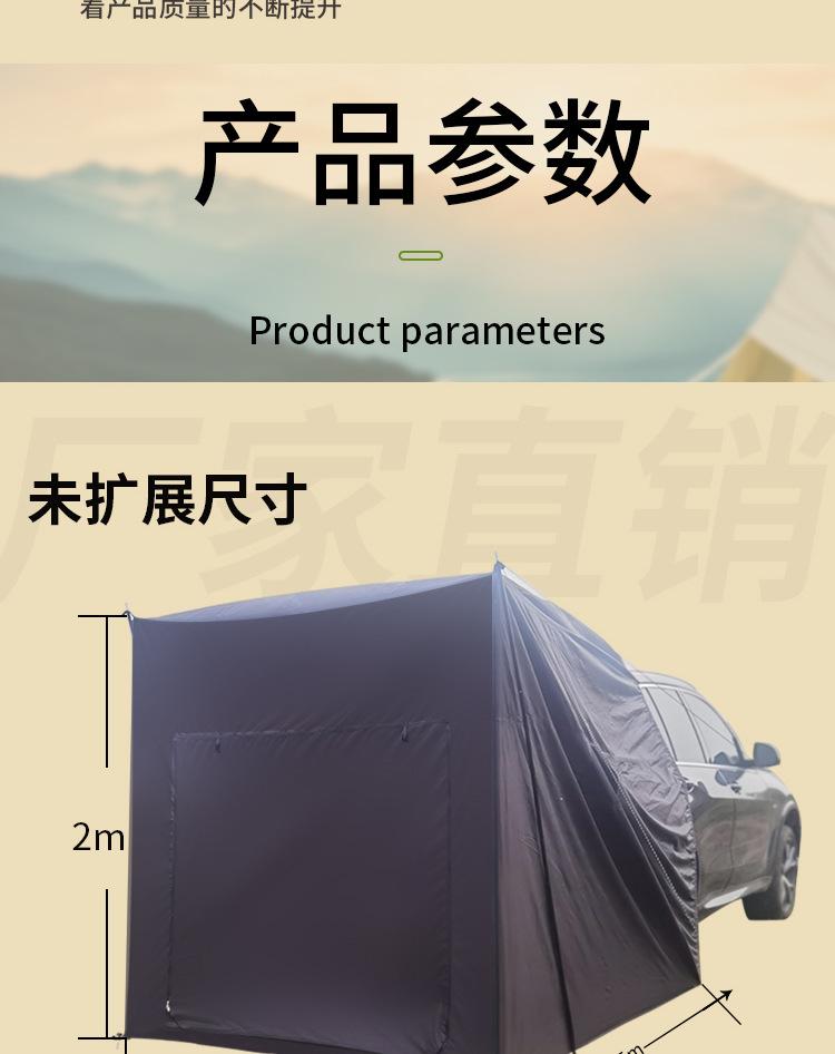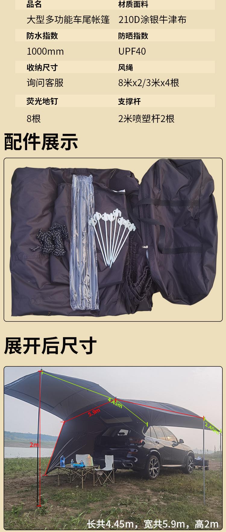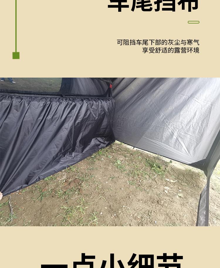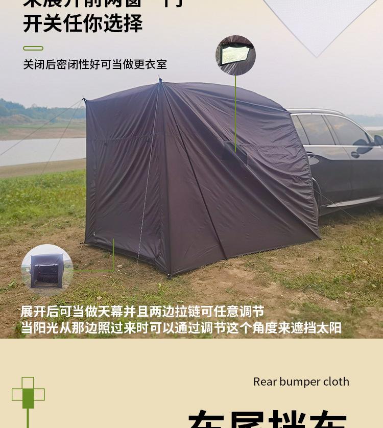 Esta barraca traseira de carro tem a seguinte função: as asas laterais esquerda e direita e a parte traseira podem ser abertas e usadas como um dossel, aumentando instantaneamente a área de sombra. O ângulo de sombra das asas laterais esquerda e direita também pode ser ajustado de acordo com a direção da luz solar. Função 2: feche as asas laterais esquerda e direita, puxe o zíper para baixo e troque para uma barraca de roupas (barraca de chuveiro) em segundos. Função 3: em dias chuvosos, podemos abrir a pequena porta na parte traseira com base na barraca de roupas, para que ela possa ser transformada em uma barraca de acampamento em segundos.