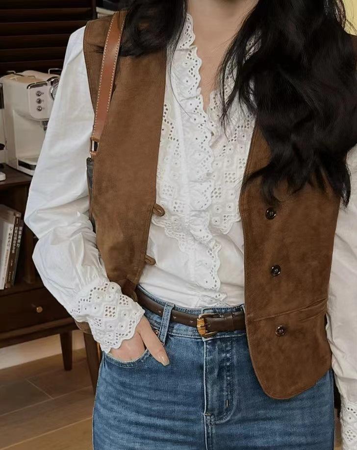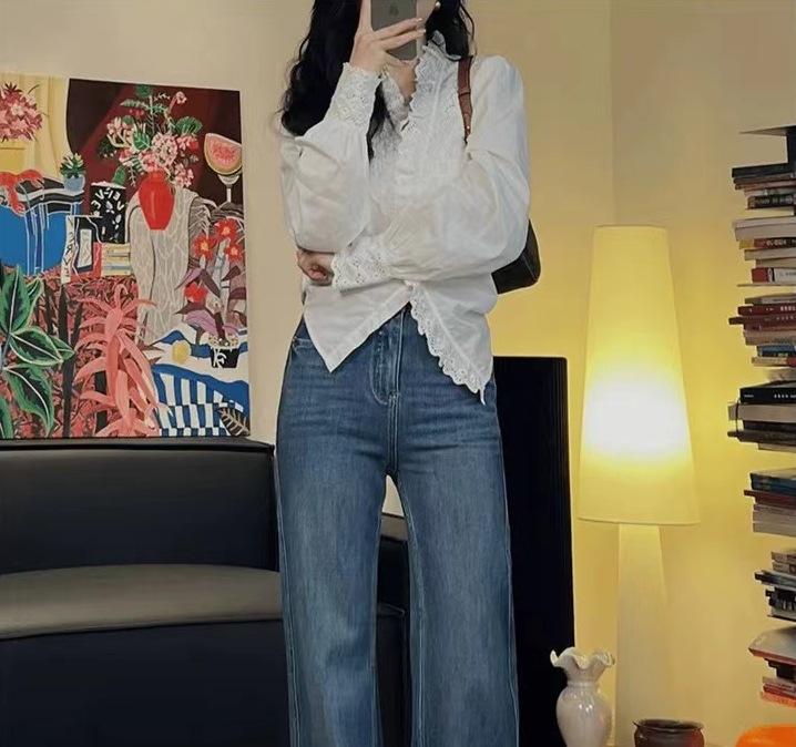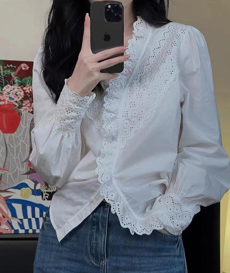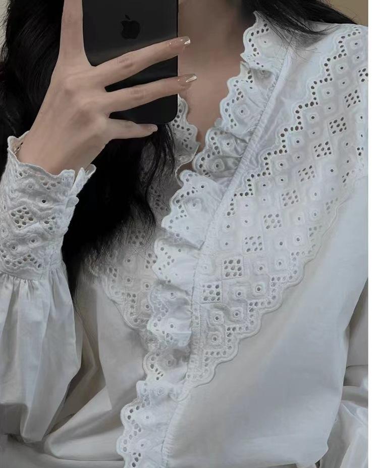 2025 Francês Retro Nicho Hollow Design Sense Bordado Renda Branca Camisa Feminina High Sense Elegante Decote Em V Top