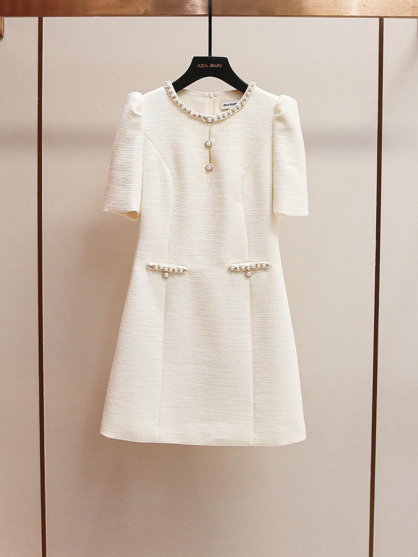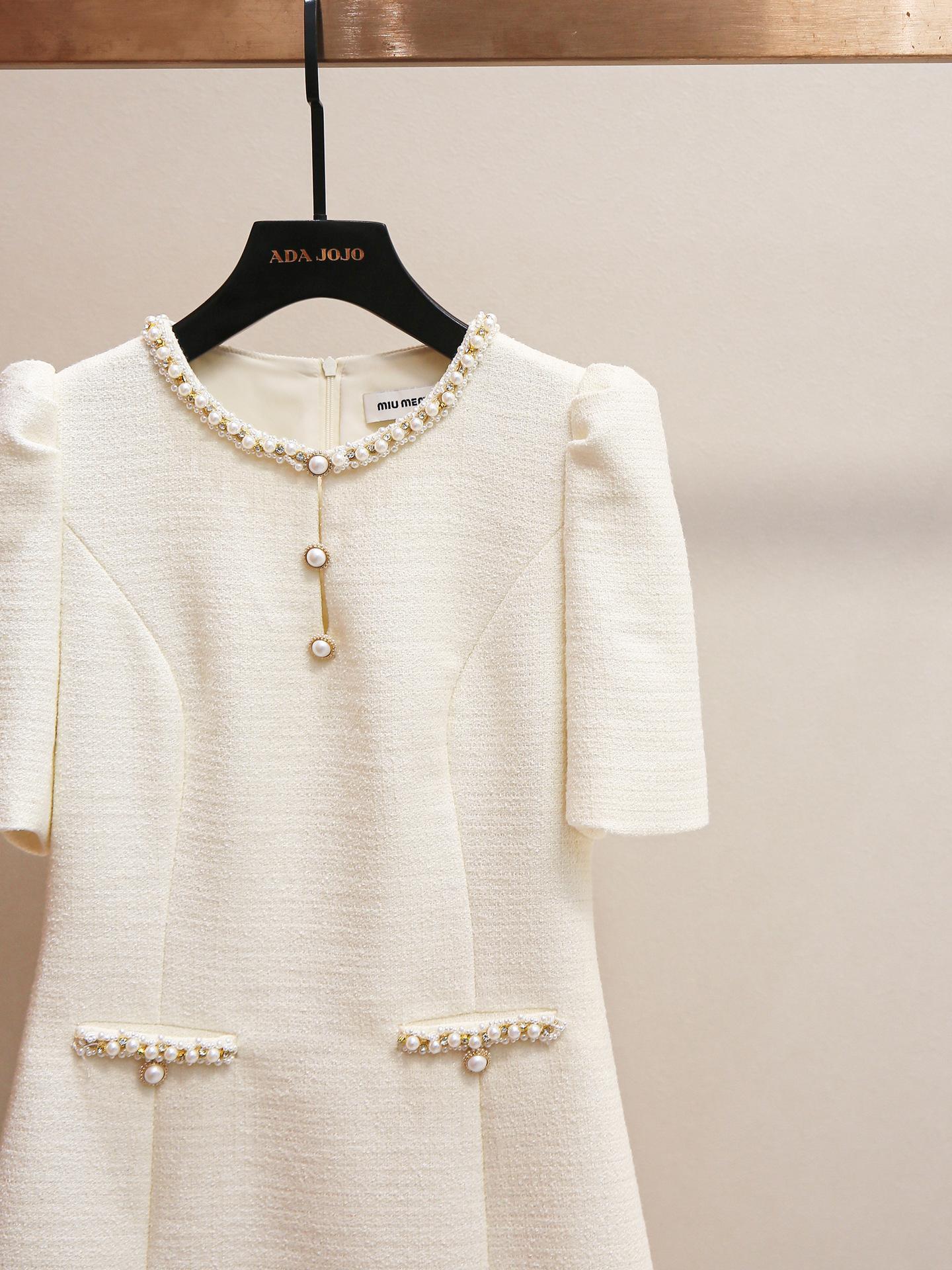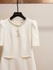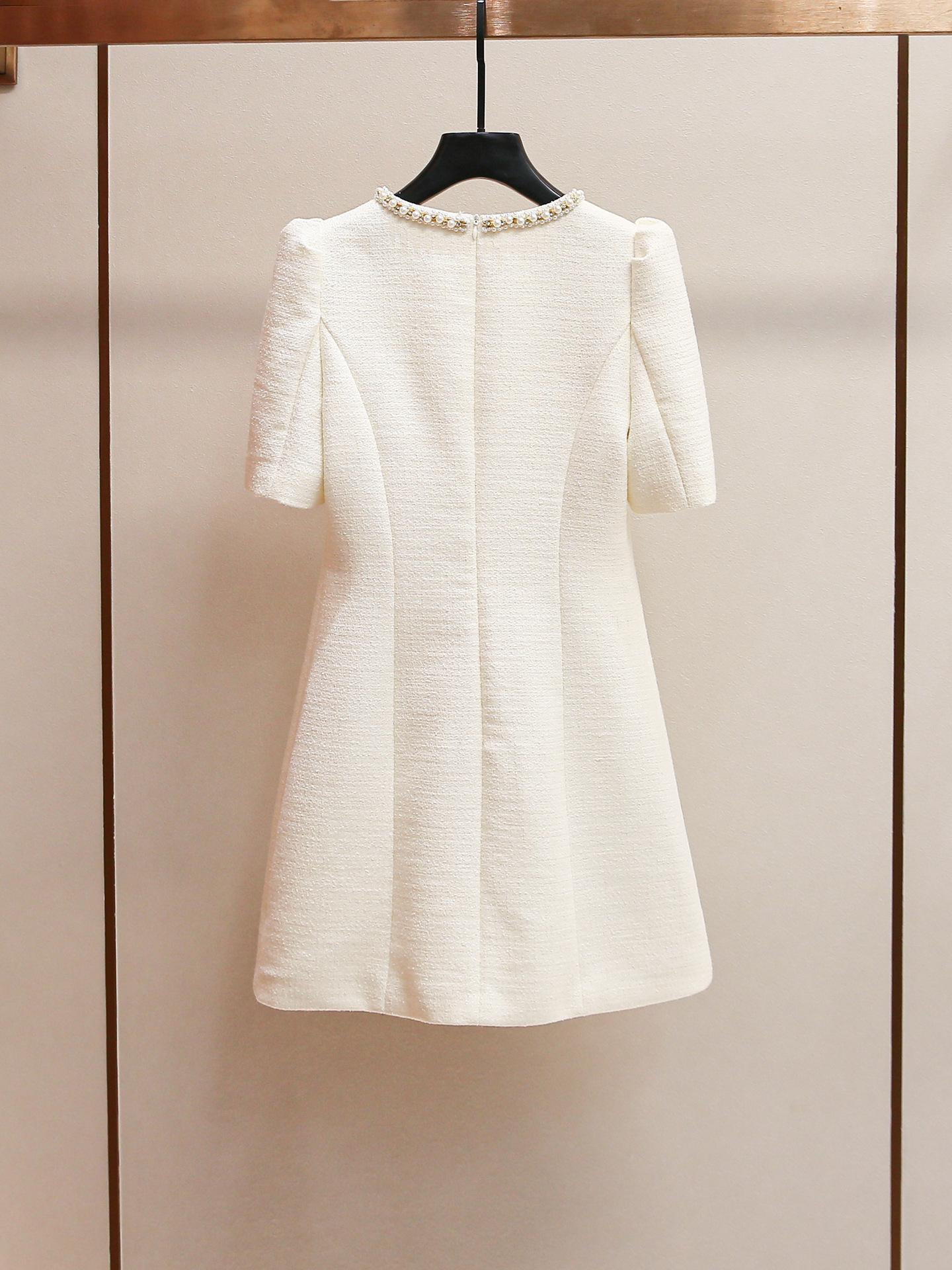 Shenzhen Nanyou Vestido Feminino Elegante Francês Simples Estilo Pequena Fragrância Gola Redonda com Miçangas Manga Bufante Cintura para Mulheres