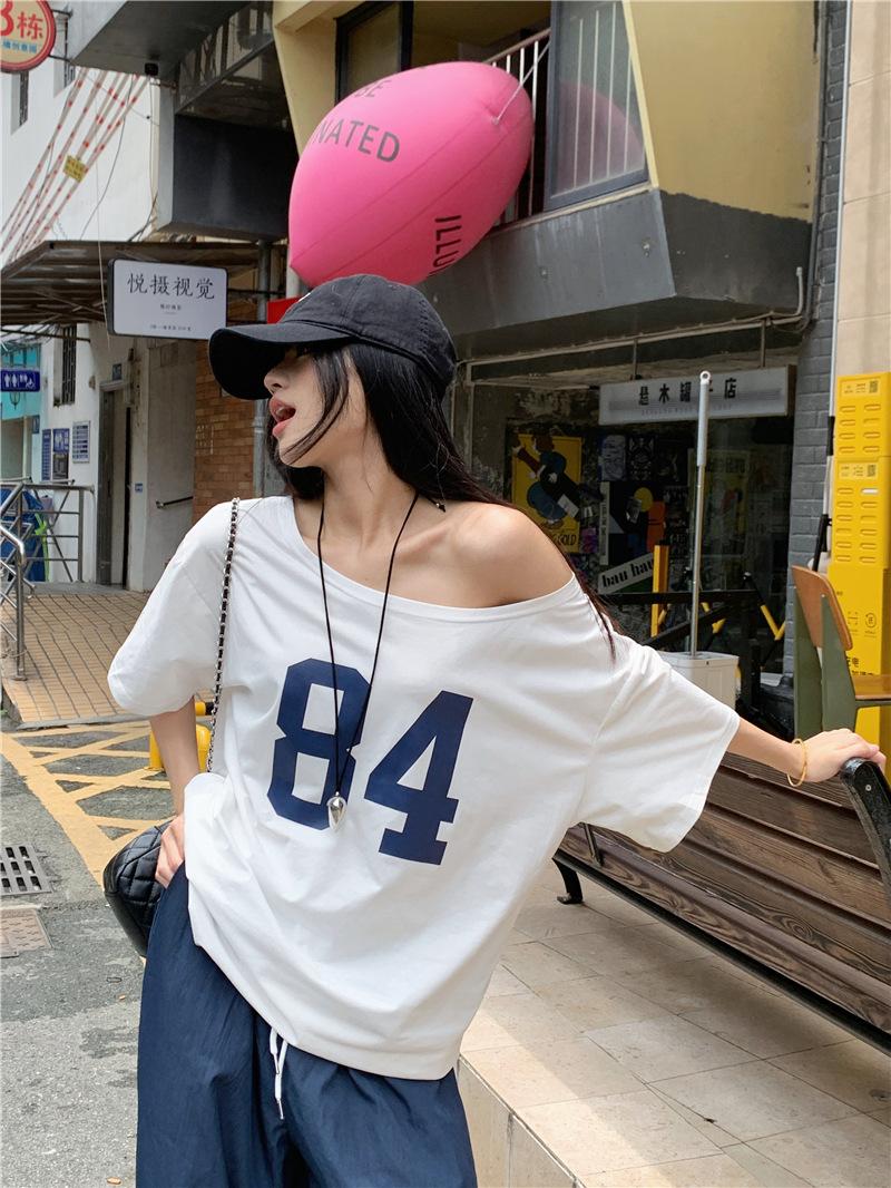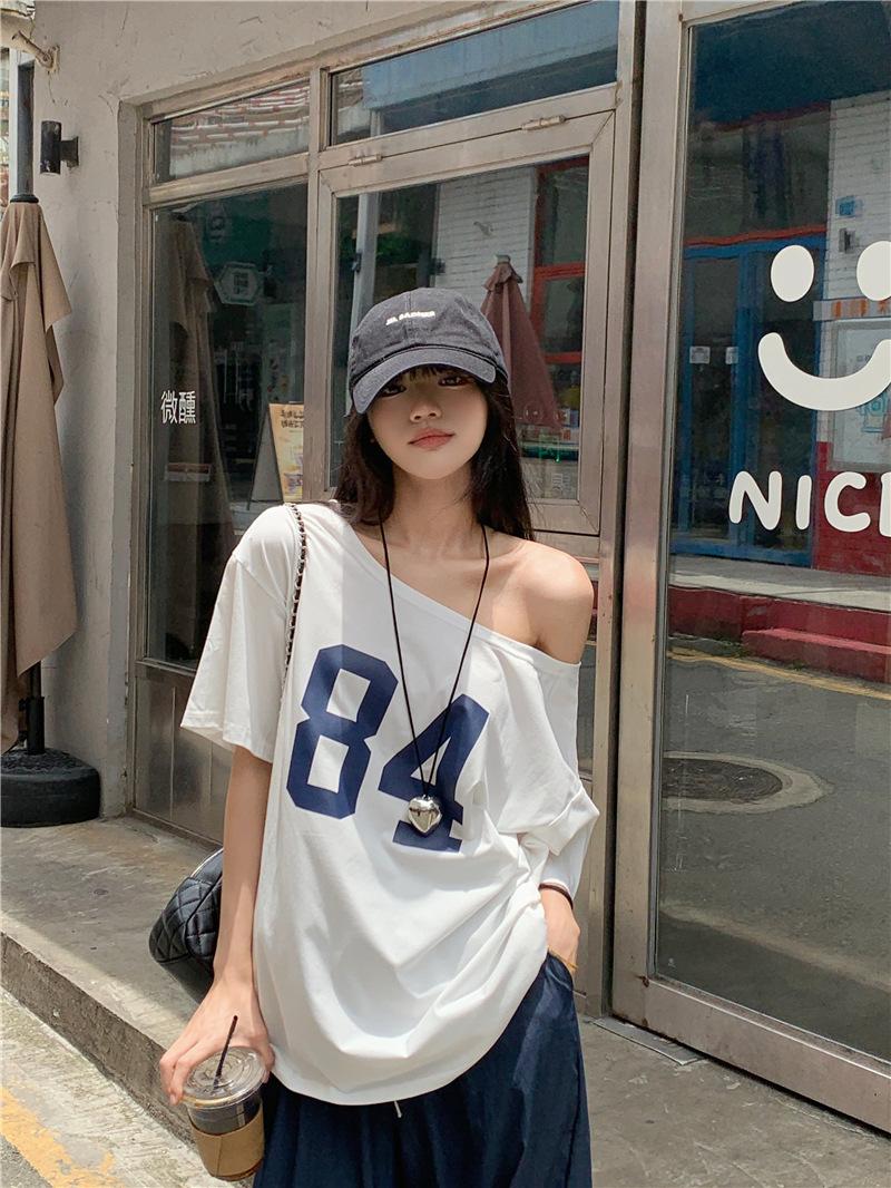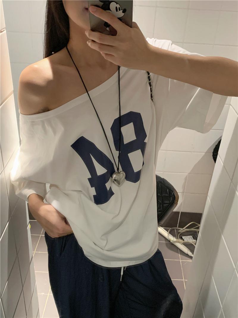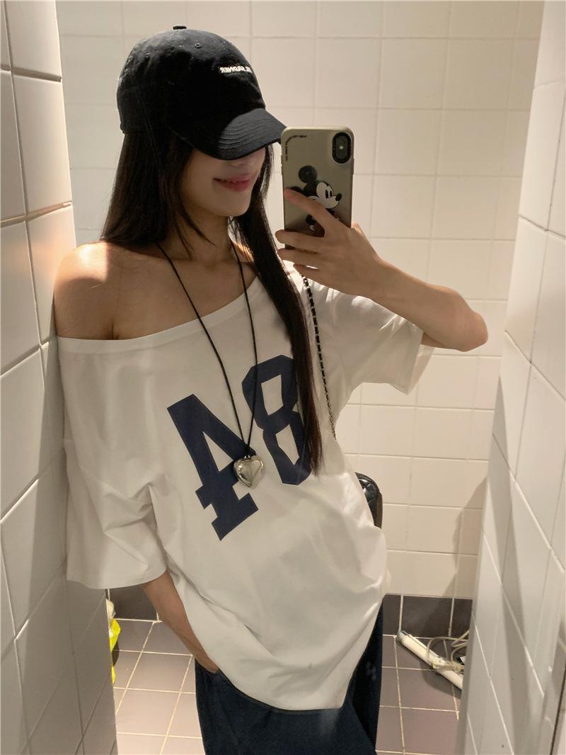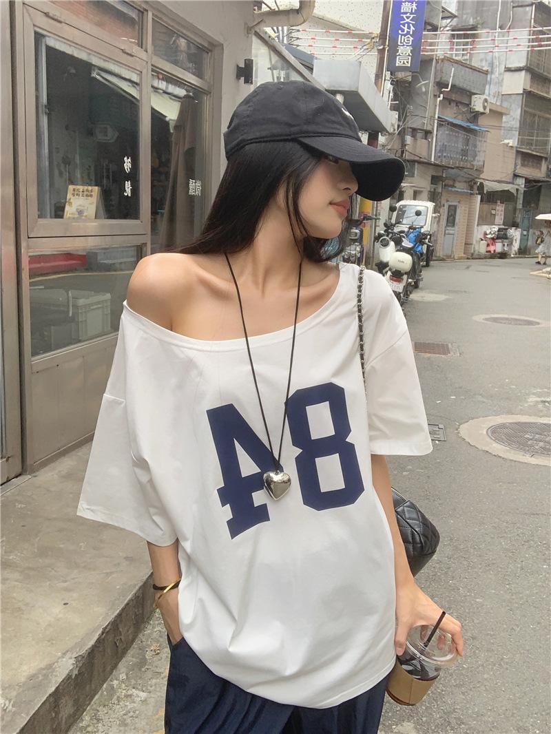 Compre Real Shot Loose All-match Design Sense Ombro Estampa Camiseta Feminina Verão 2025 Novo Estilo Preguiçoso Casual Top Trendy no atacado no Joom.pro