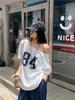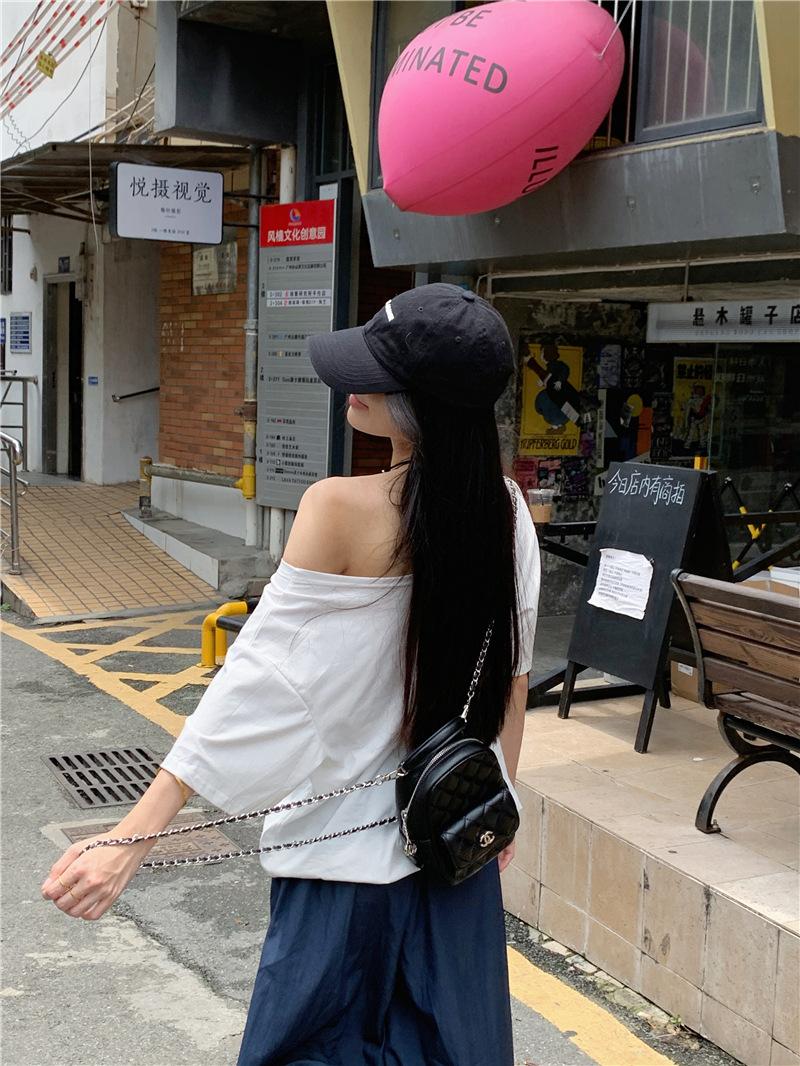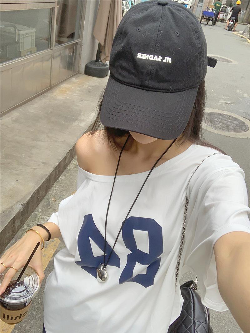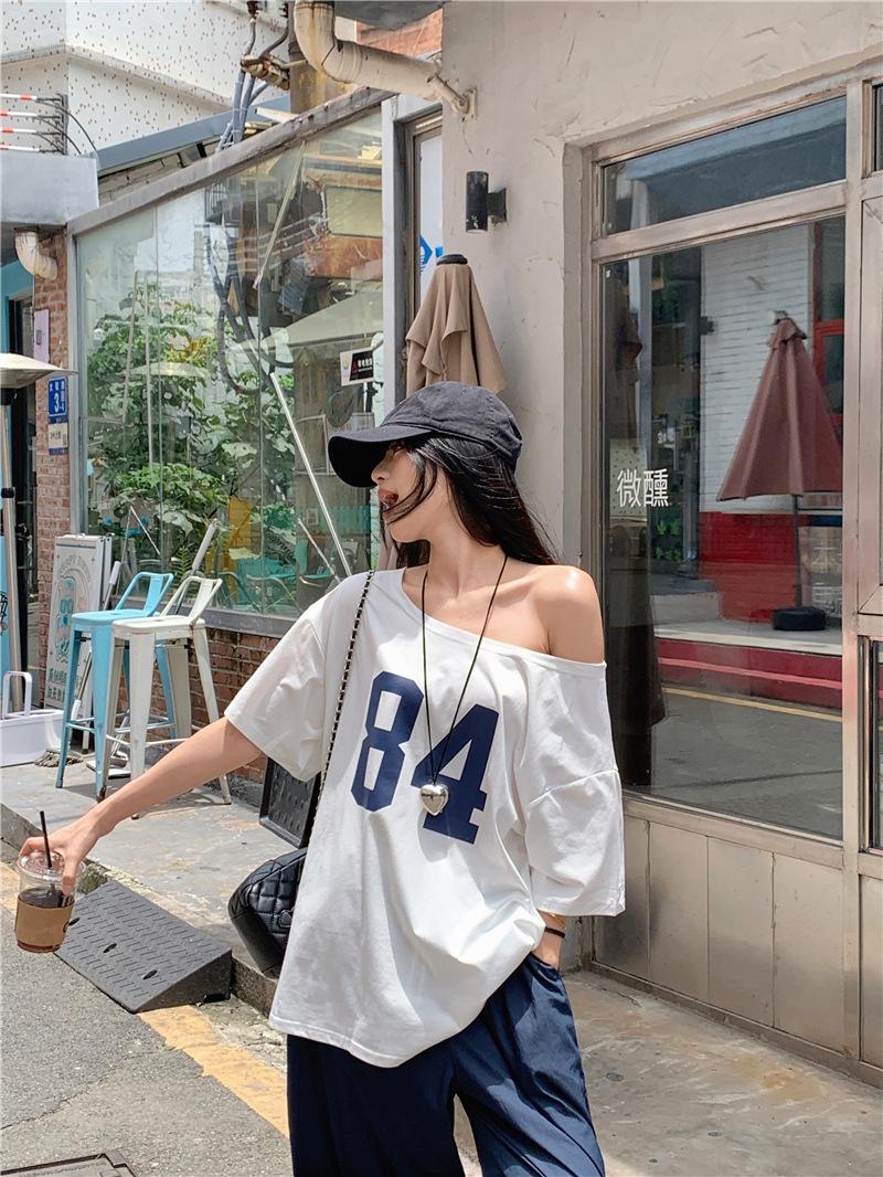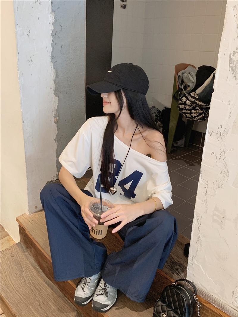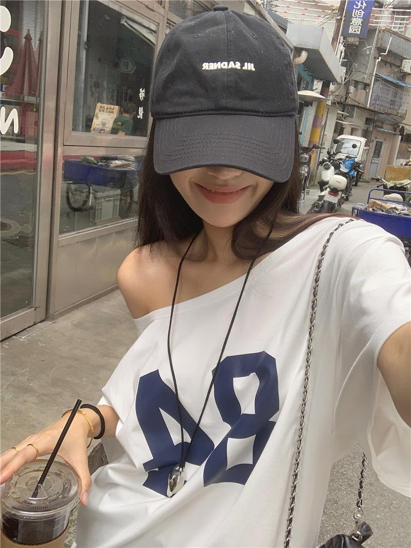 Compre Real Shot Loose All-match Design Sense Ombro Estampa Camiseta Feminina Verão 2025 Novo Estilo Preguiçoso Casual Top Trendy no atacado no Joom.pro