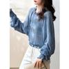 [Girl's Double Tune] 2025 Nova Primavera Elegante Camisa de Chiffon Chic Socialite Manga Longa Decote em V Camisa de Renda Feminina
