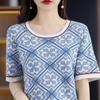 Nova blusa de malha de algodão jacquard para primavera e verão, camiseta feminina de manga curta de algodão porcelana azul e branca, gola redonda, top combinando para cabelo