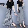 Top xadrez doce e picante com decote em arco, vestido de verão com cintura alta, duas peças, saia de terno feminino