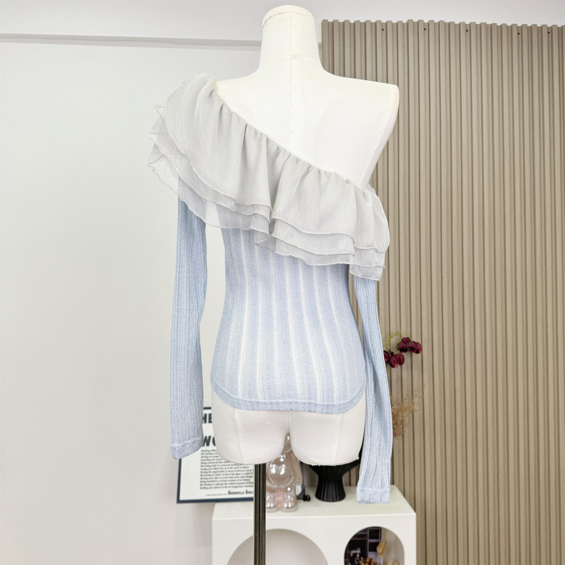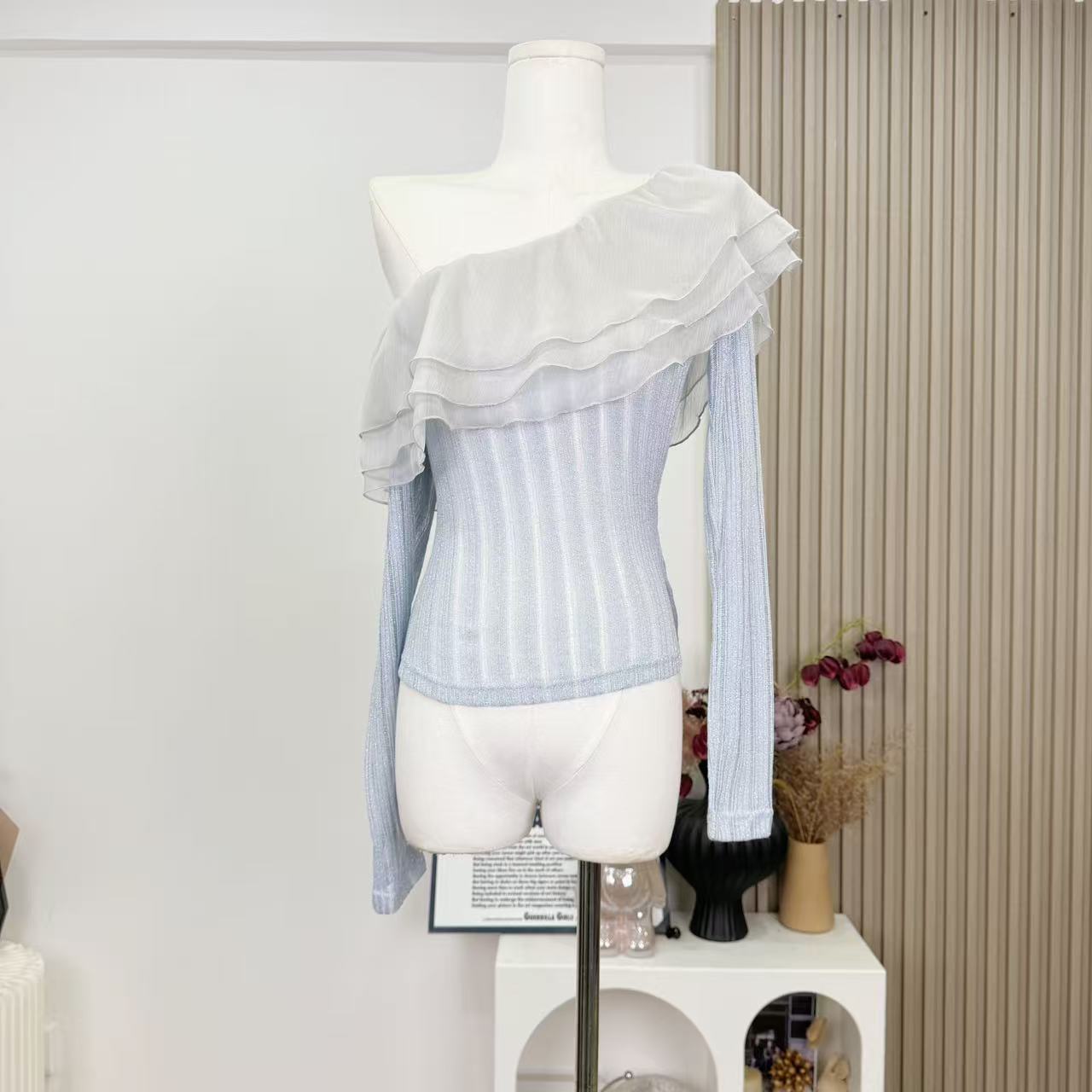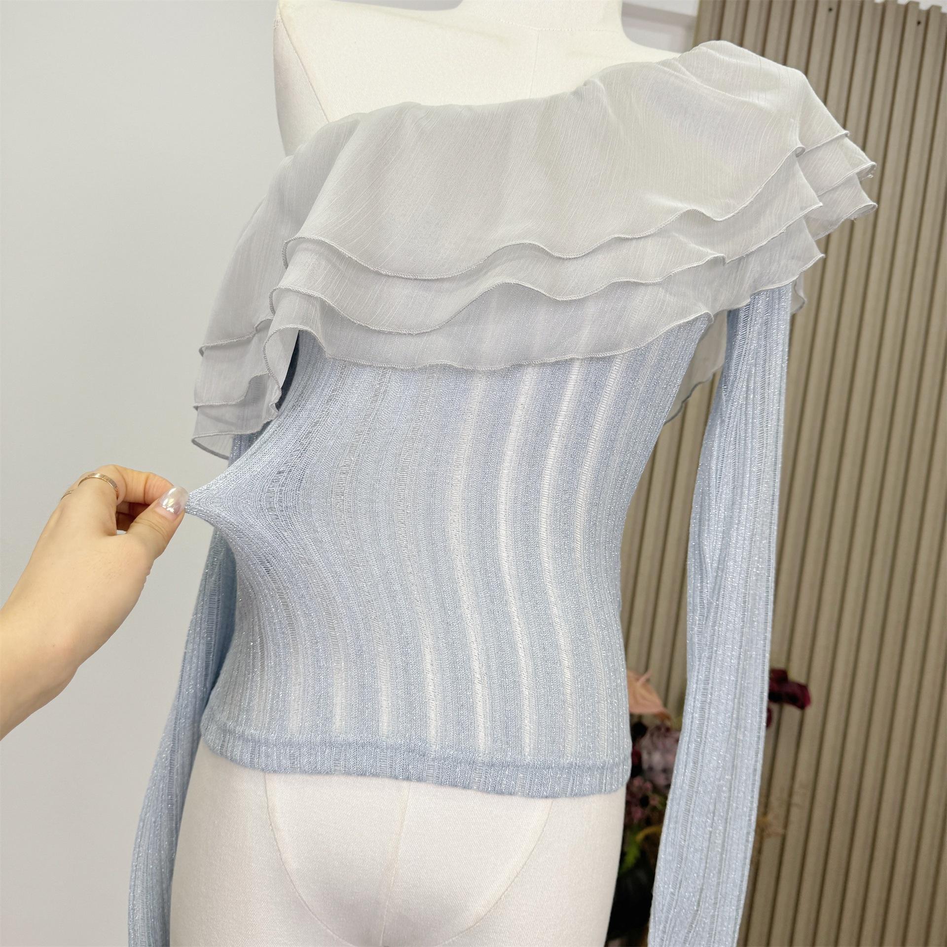 Compre Camiseta Top de Tricô de Ombro Inclinado com Ondulação Suave, Três Camadas de Babados Finos com Brilho, Manga Longa no atacado no Joom.pro