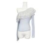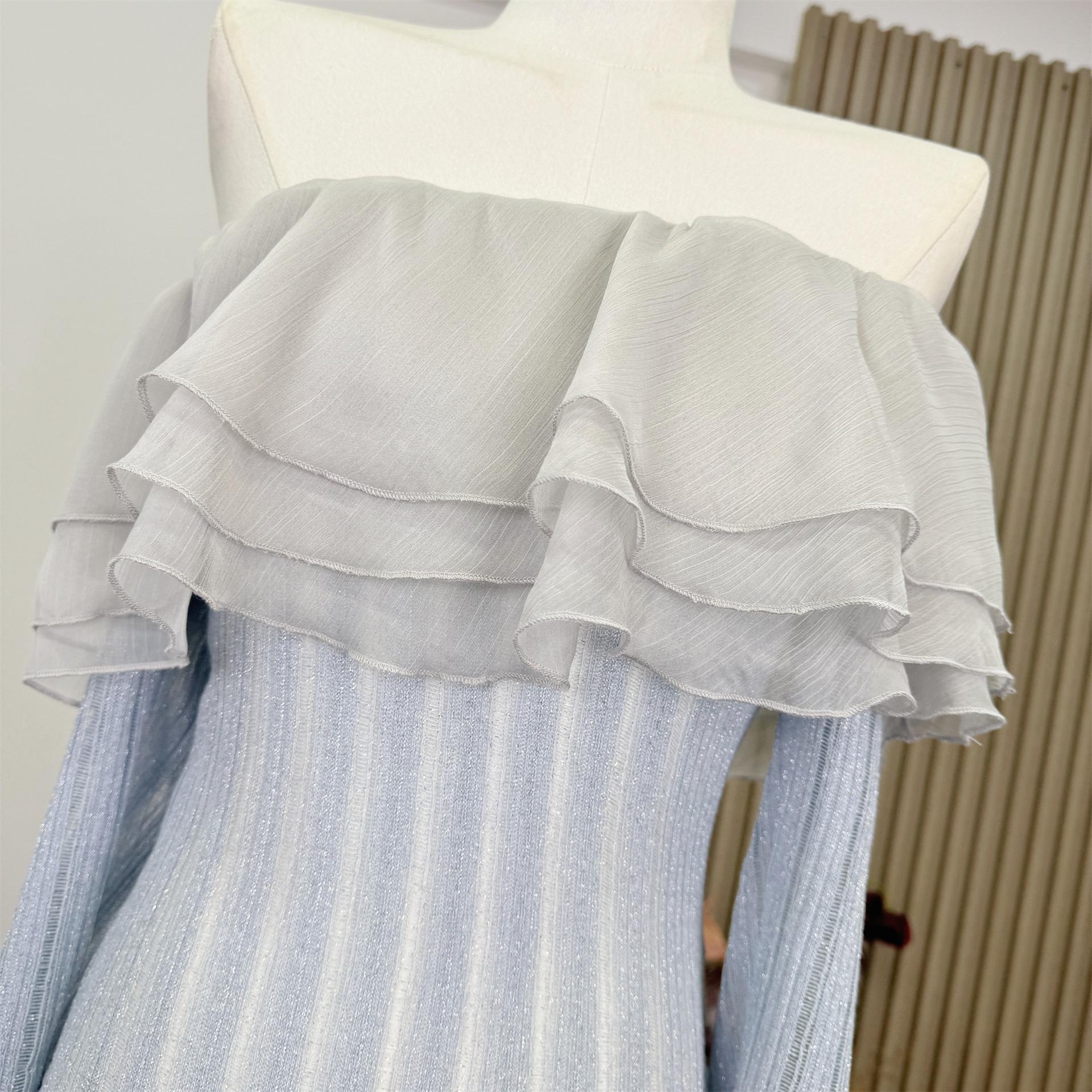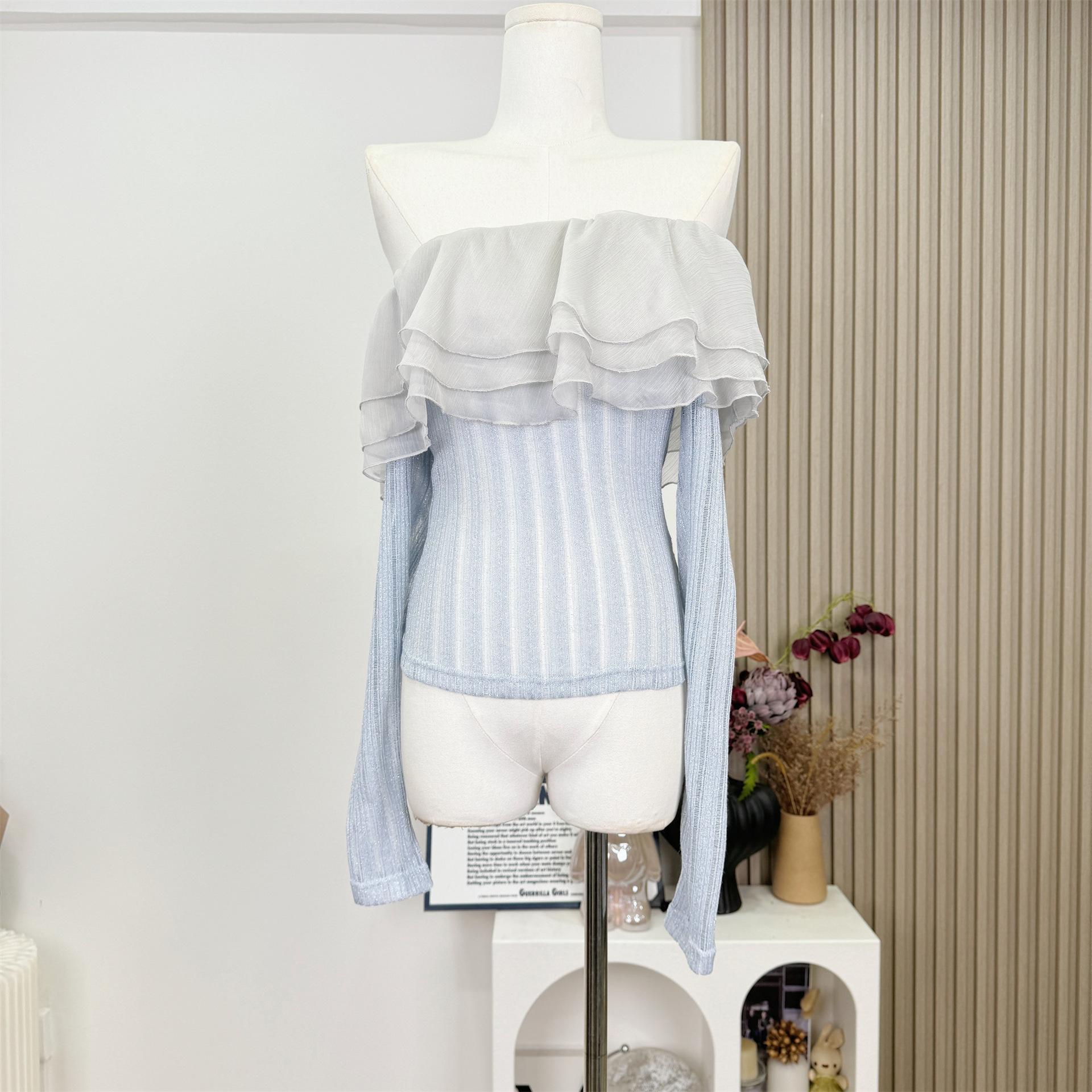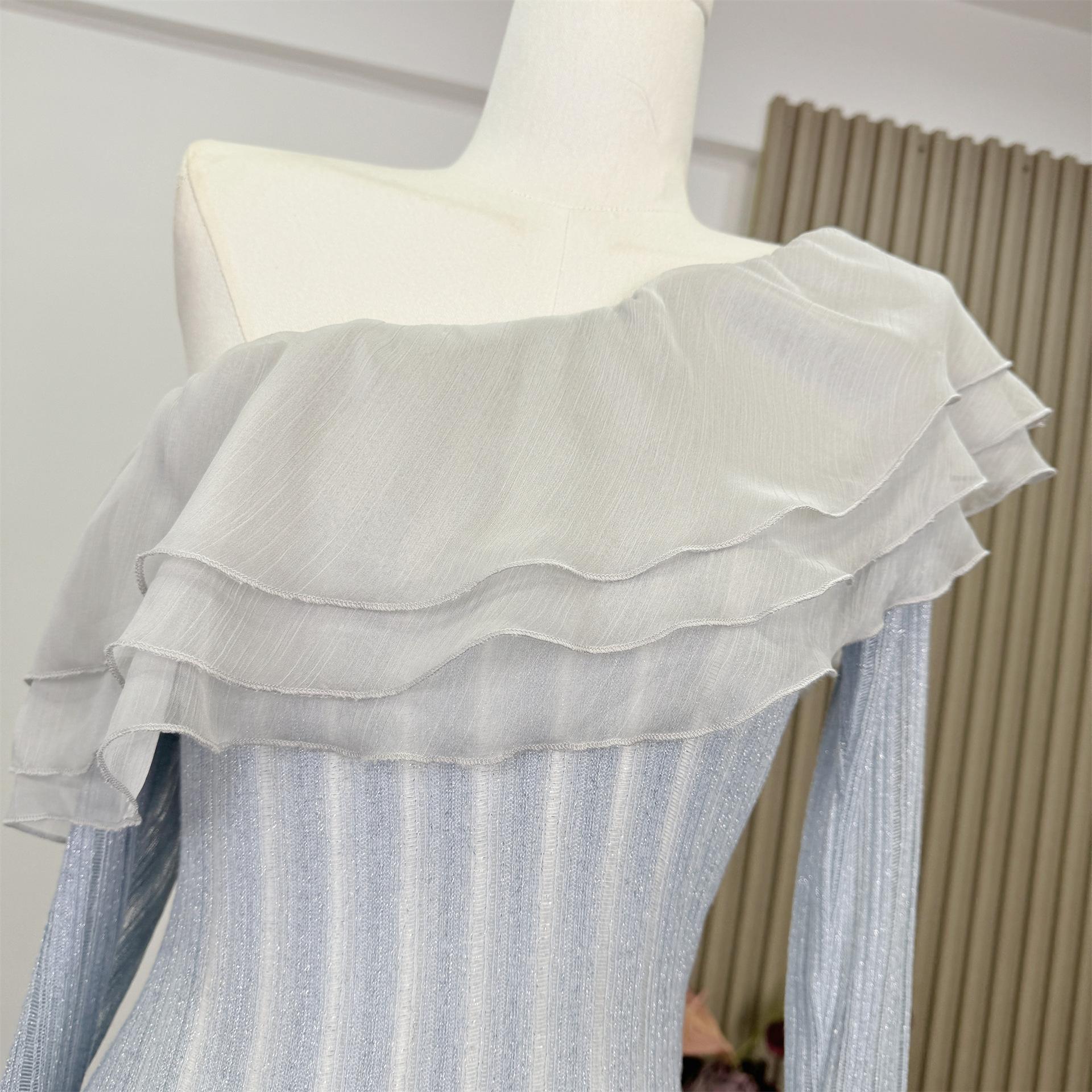 Compre Camiseta Top de Tricô de Ombro Inclinado com Ondulação Suave, Três Camadas de Babados Finos com Brilho, Manga Longa no atacado no Joom.pro