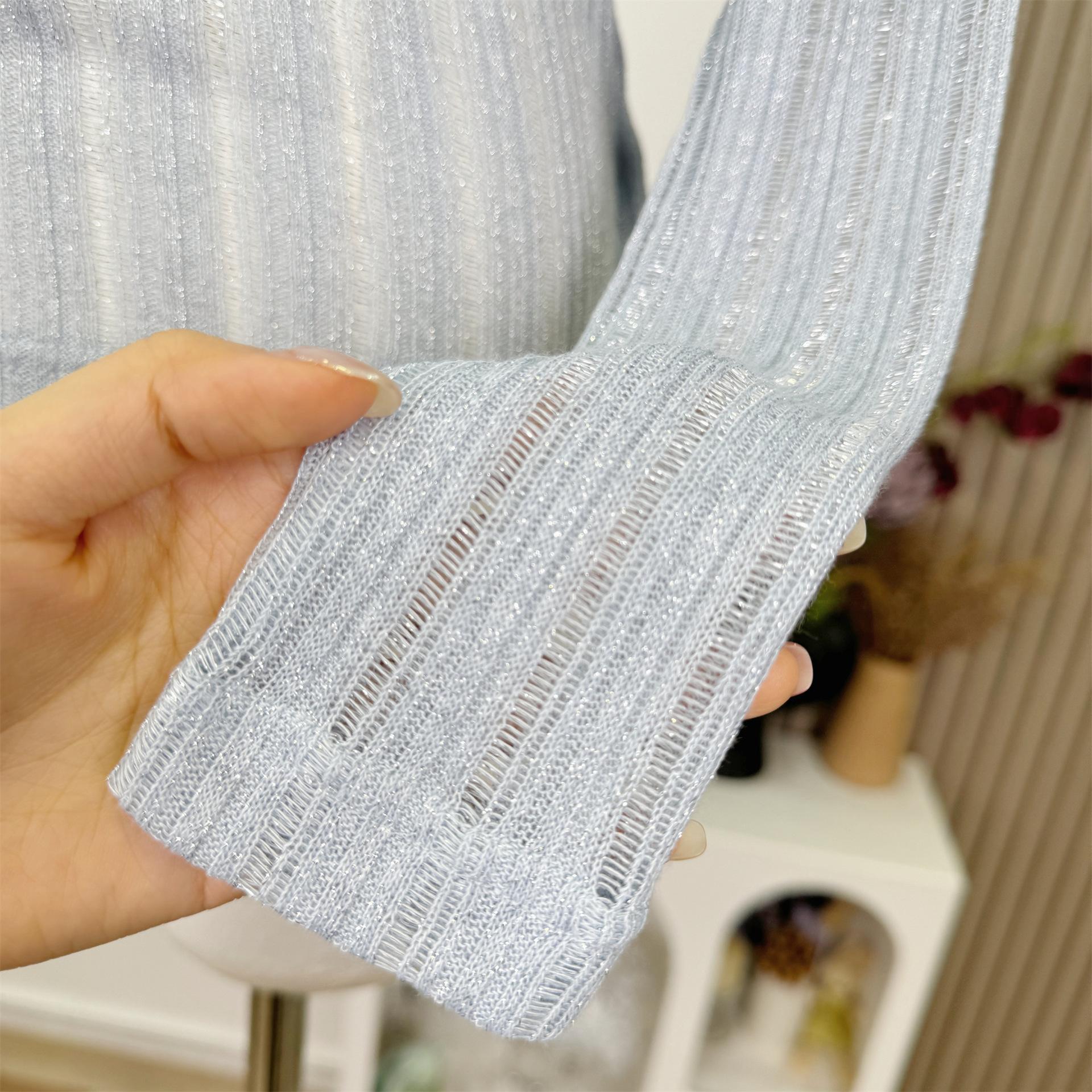 Camiseta Top de Tricô de Ombro Inclinado com Ondulação Suave, Três Camadas de Babados Finos com Brilho, Manga Longa