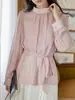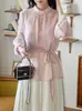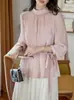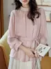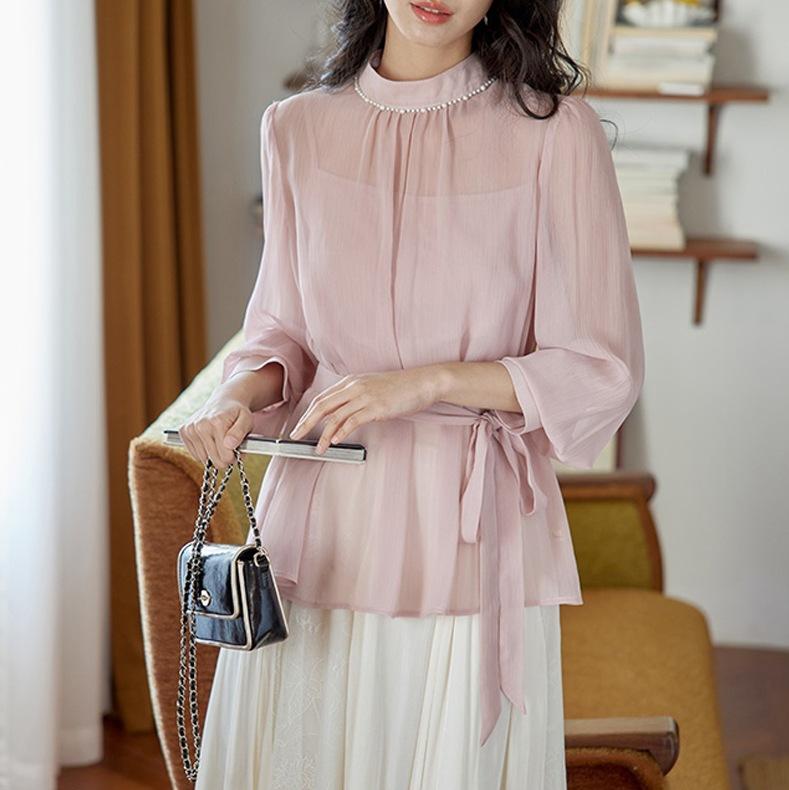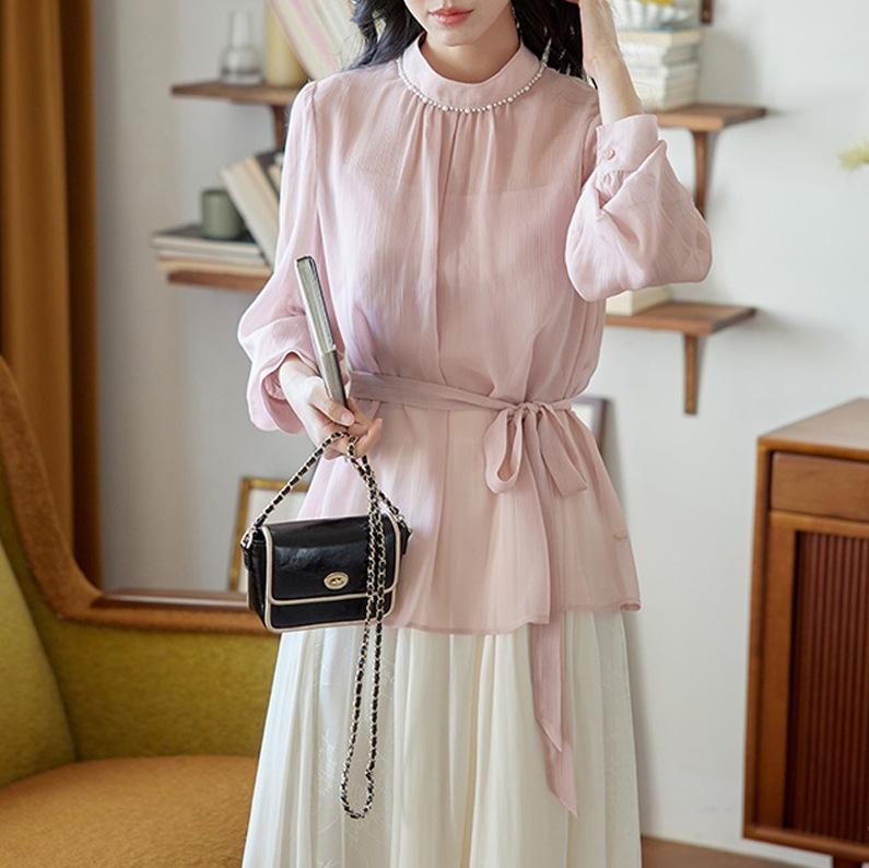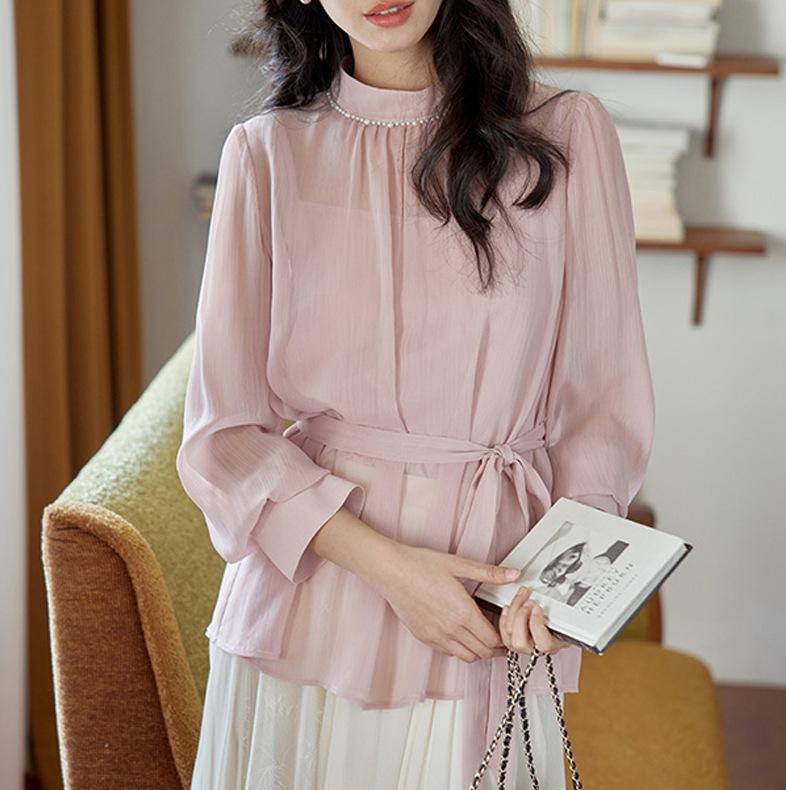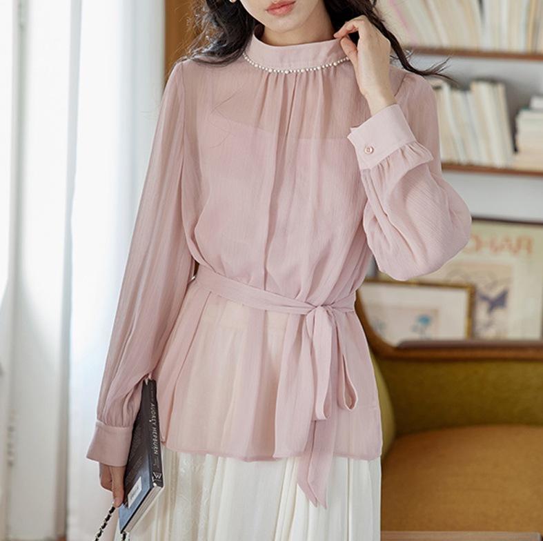 Camisa de renda pérola com gola rosa feminina primavera francesa retrô cintura justa emagrecimento elegante top