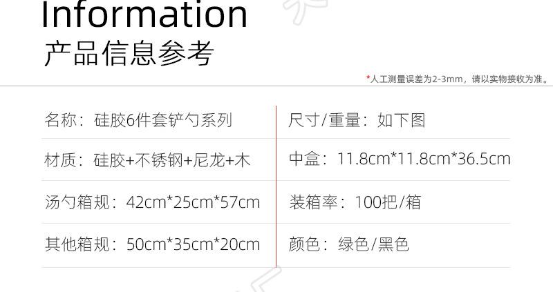 Fábrica de manchas de alta temperatura resistente aço inoxidável espátula colher de sopa 6 peças conjunto cozinha doméstica silicone conjunto