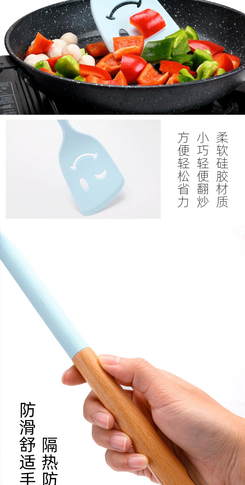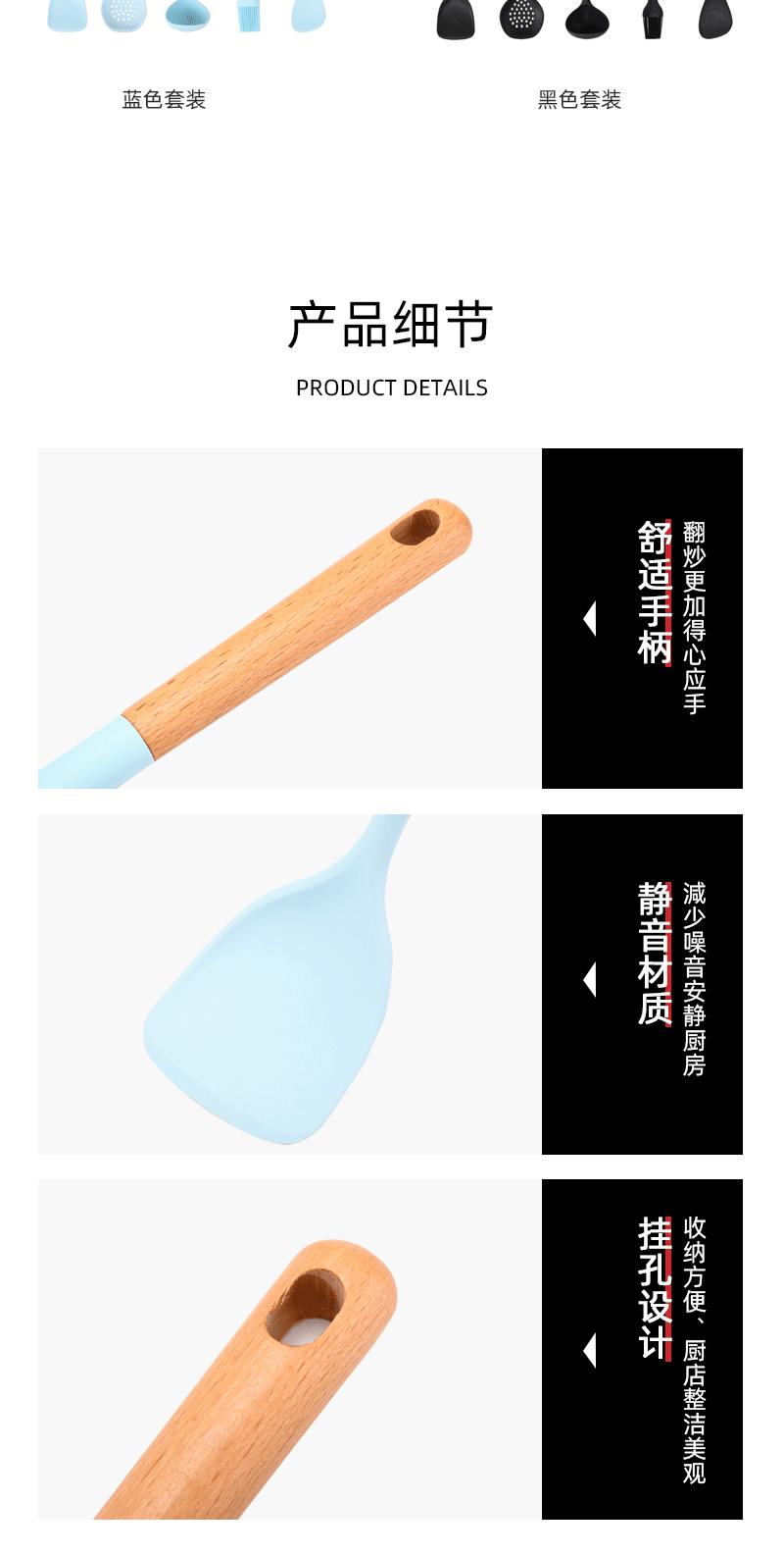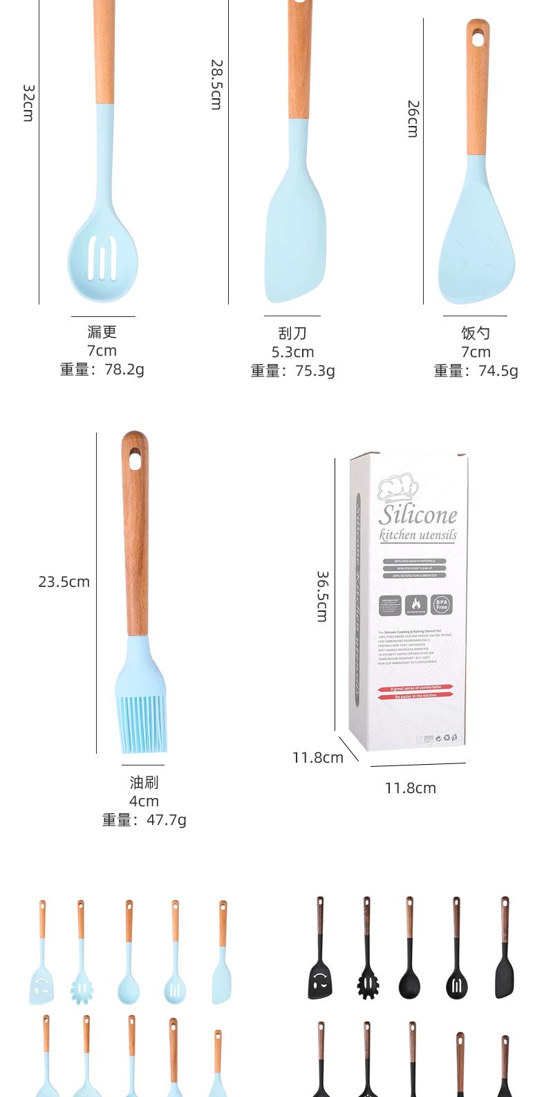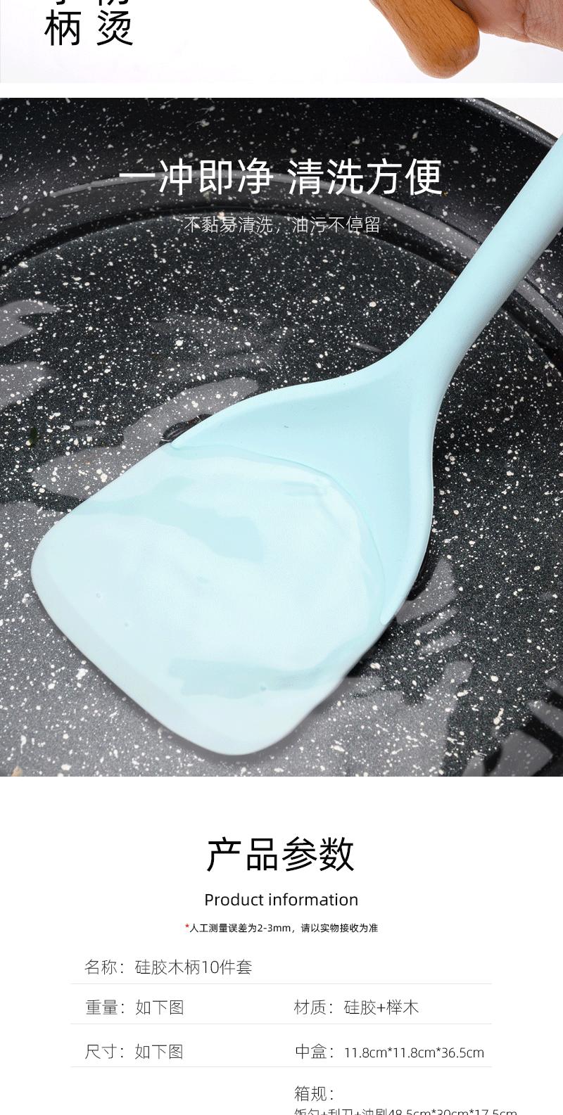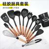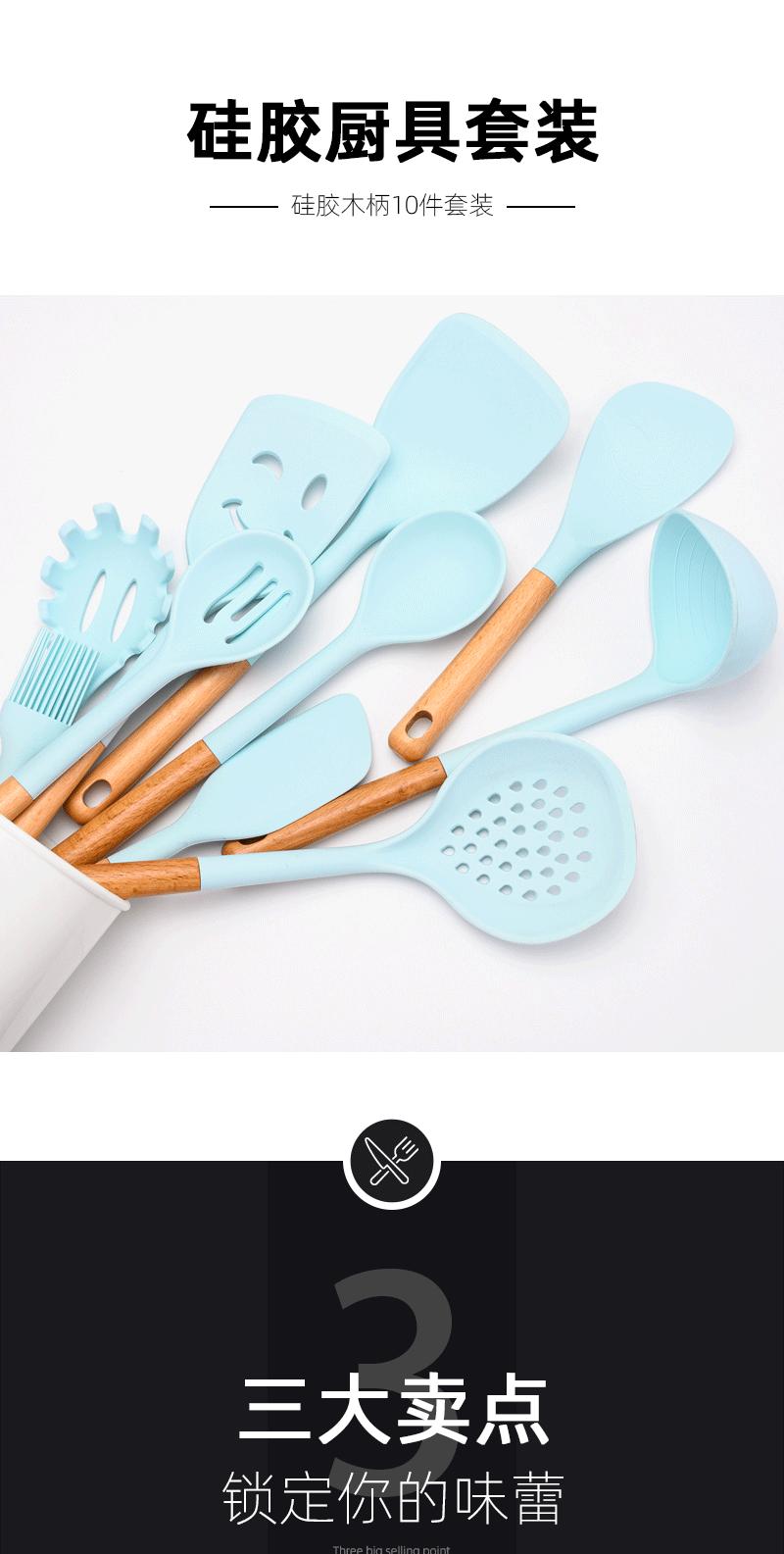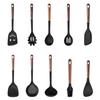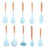 Utensílios de cozinha com cabo de madeira de silicone, espátula de silicone antiaderente de estilo europeu, conjunto de utensílios de cozinha azul e preto resistente a altas temperaturas com 10 peças