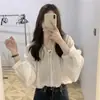 Design Sense Niche Ruffle Collar Manga Longa Camisa Feminina Estilo Francês Elegante Bainha Irregular Manga Bolha Top Chique