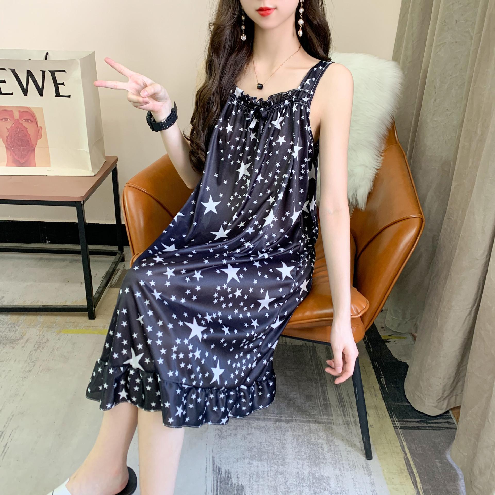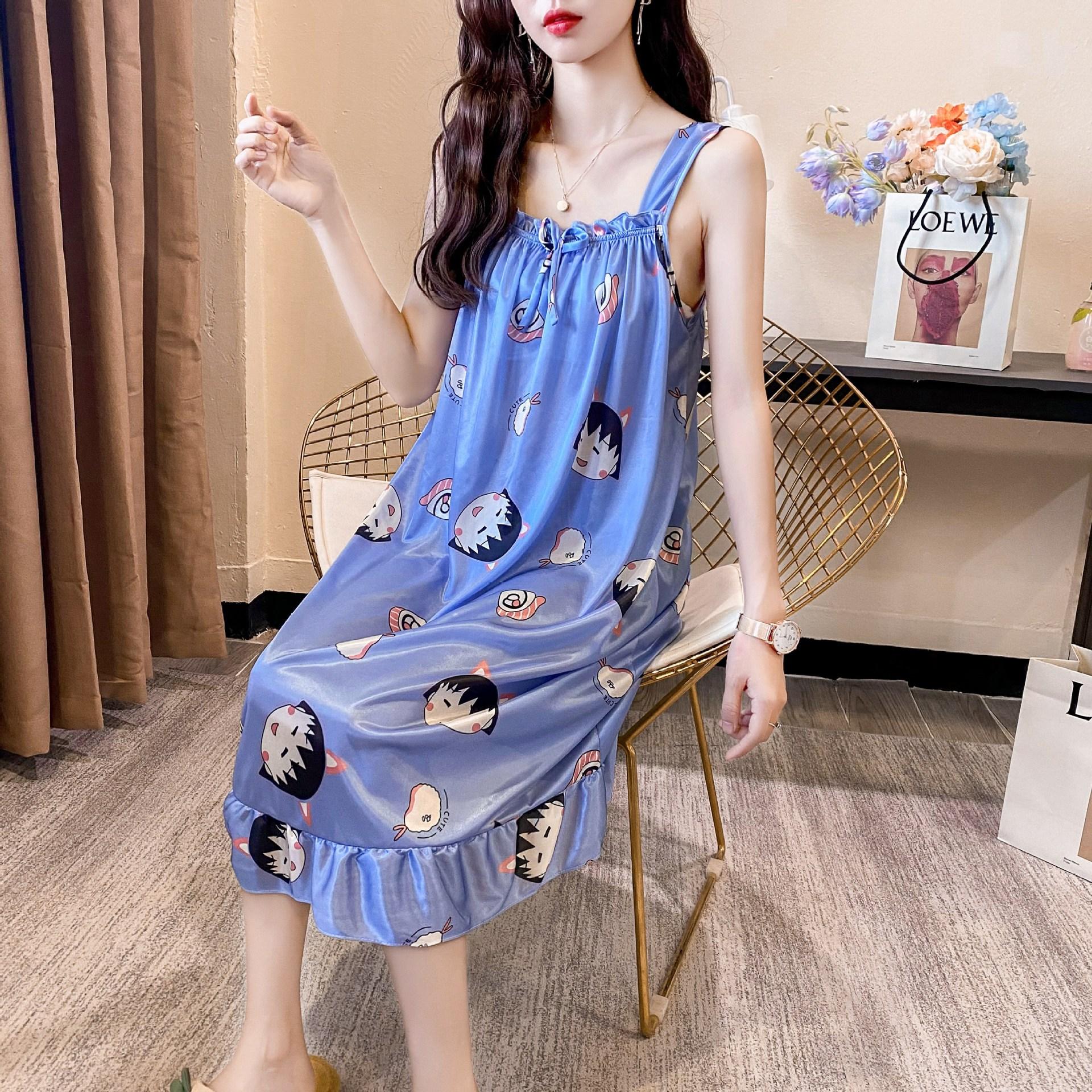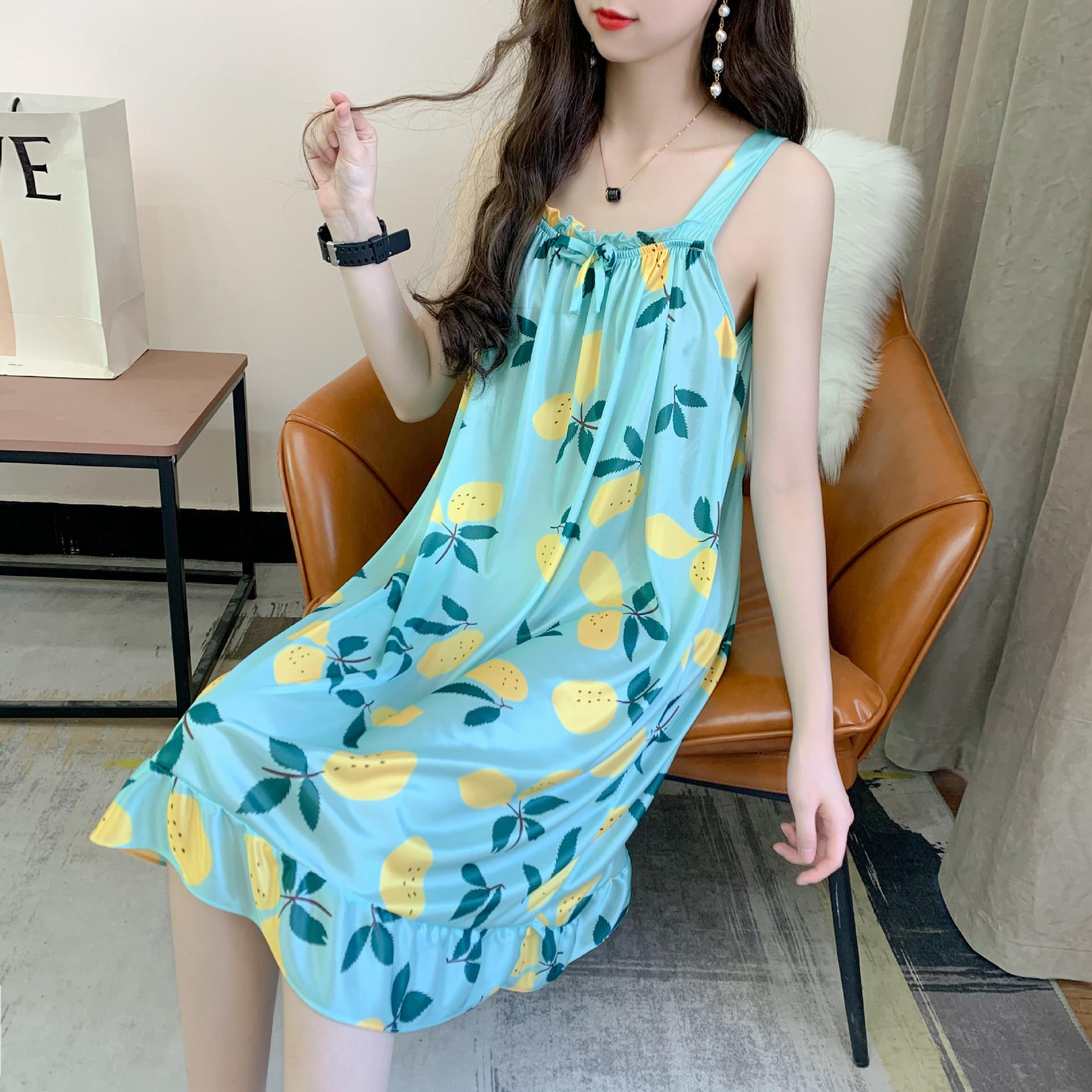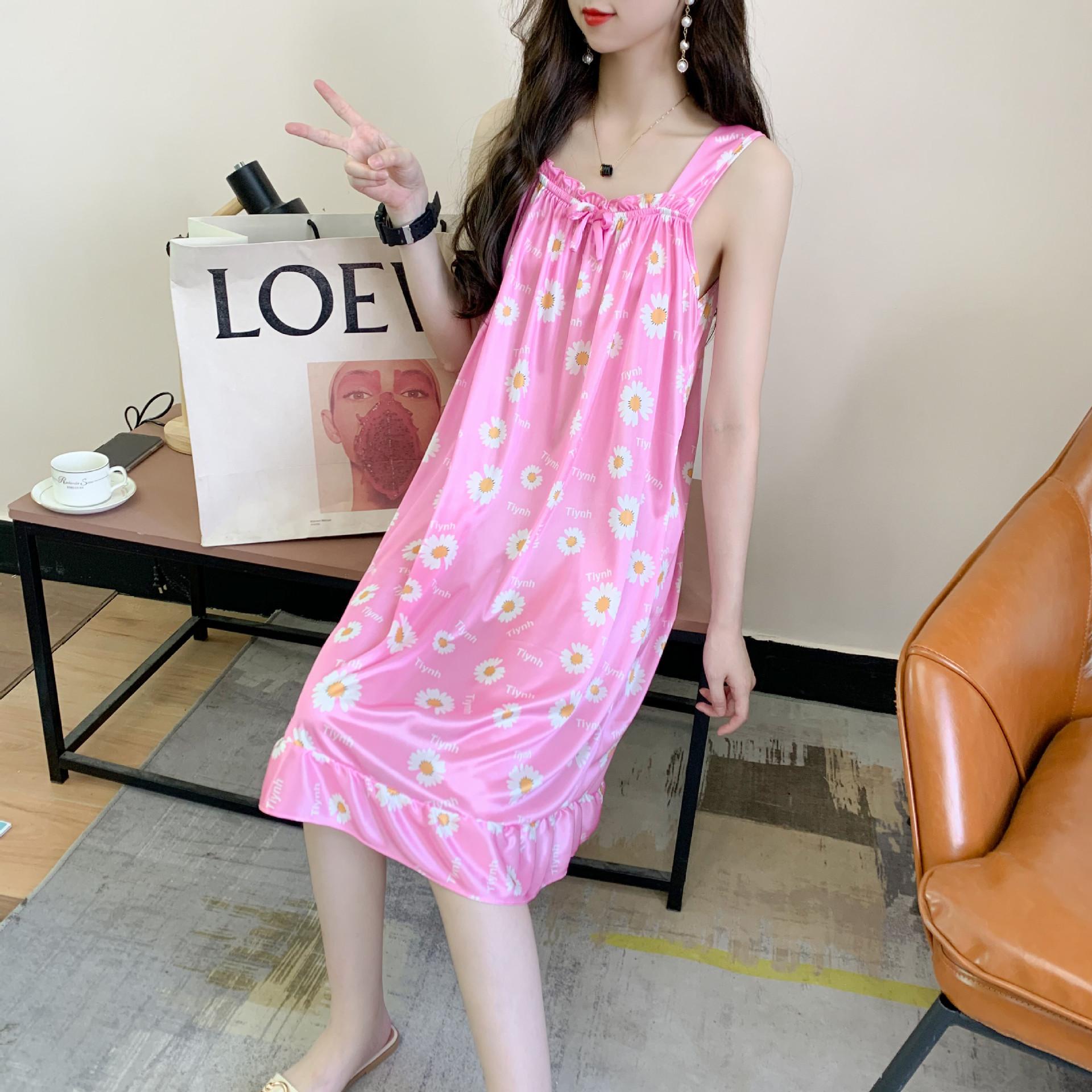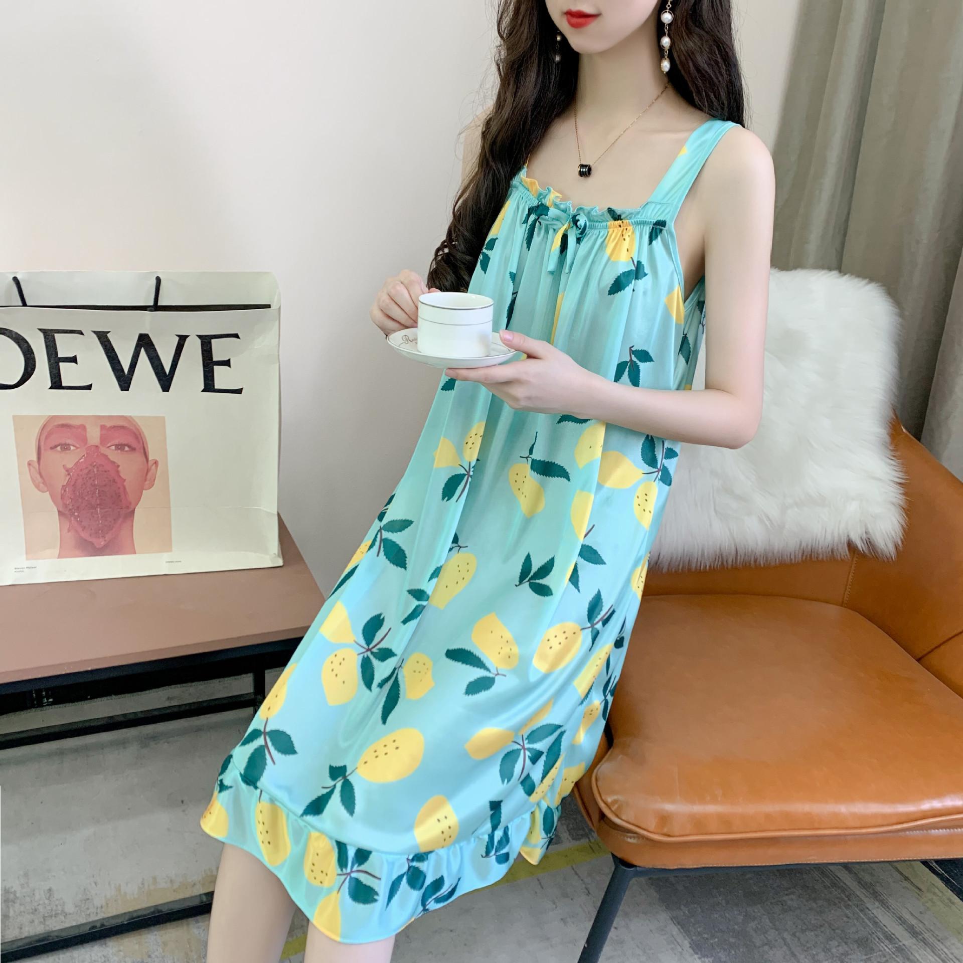 Camisola sem mangas com alças, pijama feminino de seda gelada de verão, sexy, estampado fino, moda solta, tamanho grande, roupas para casa, atacado
