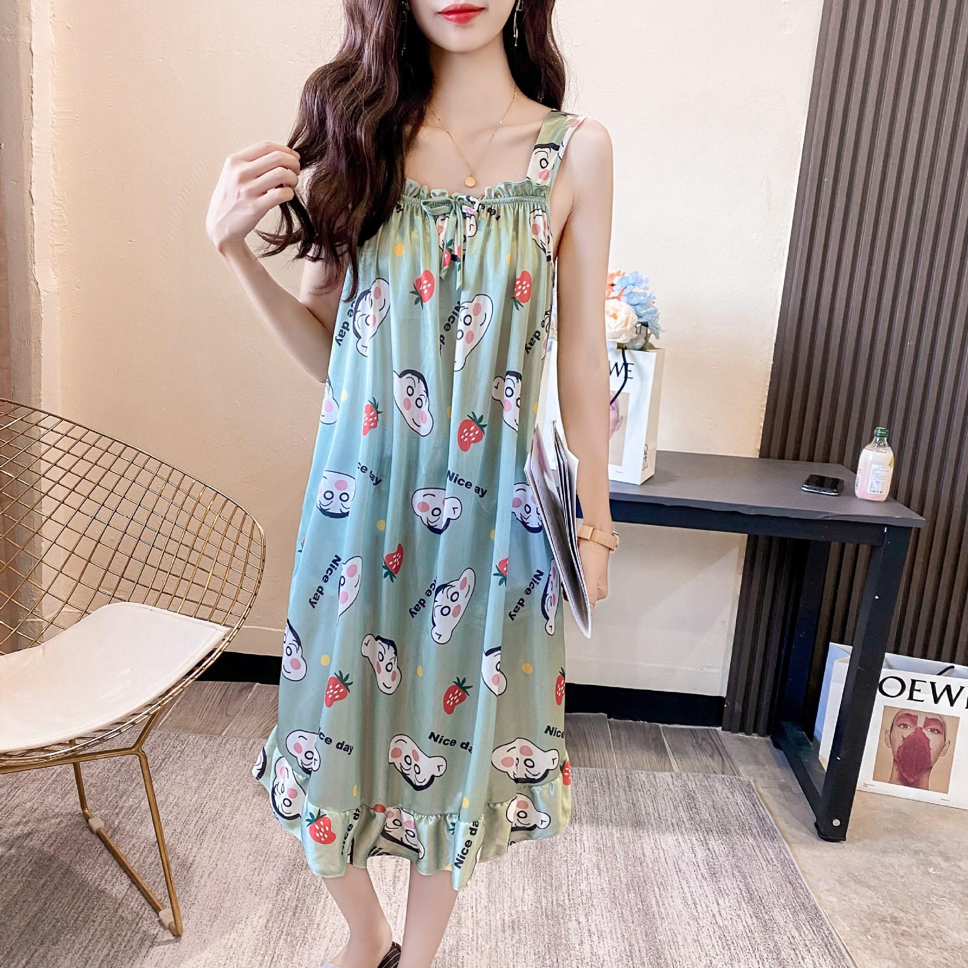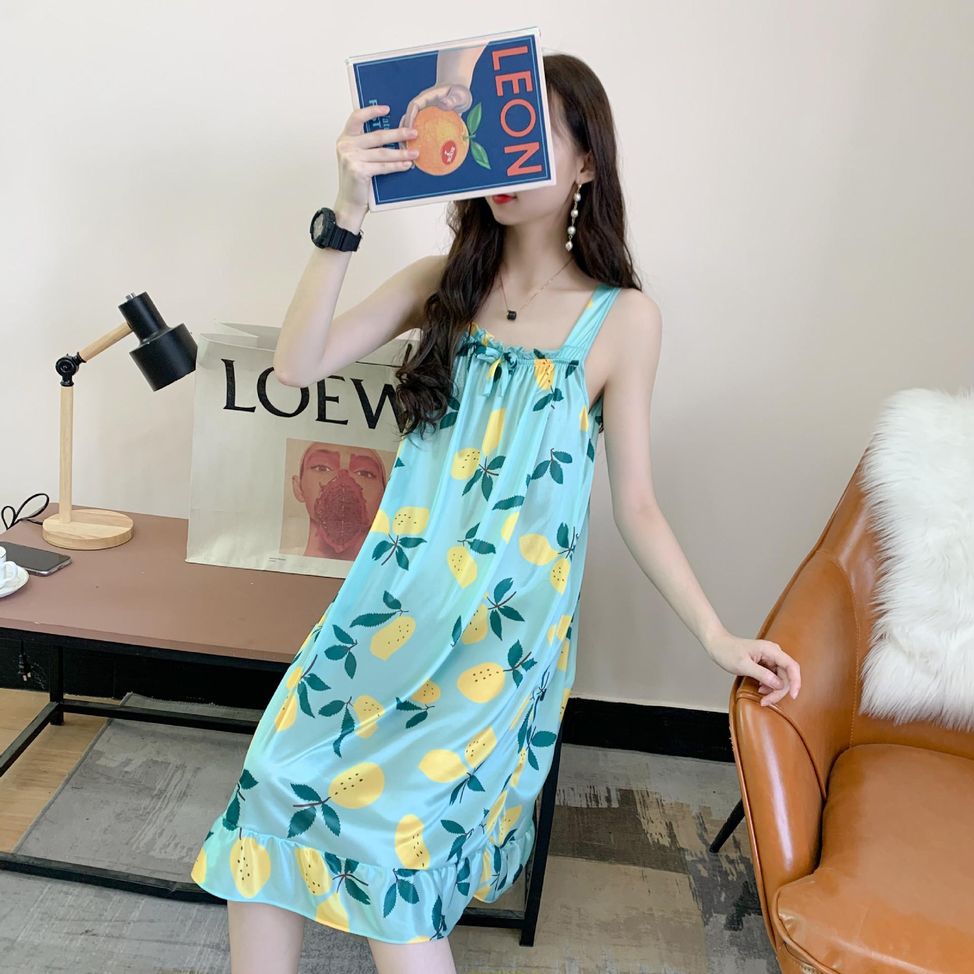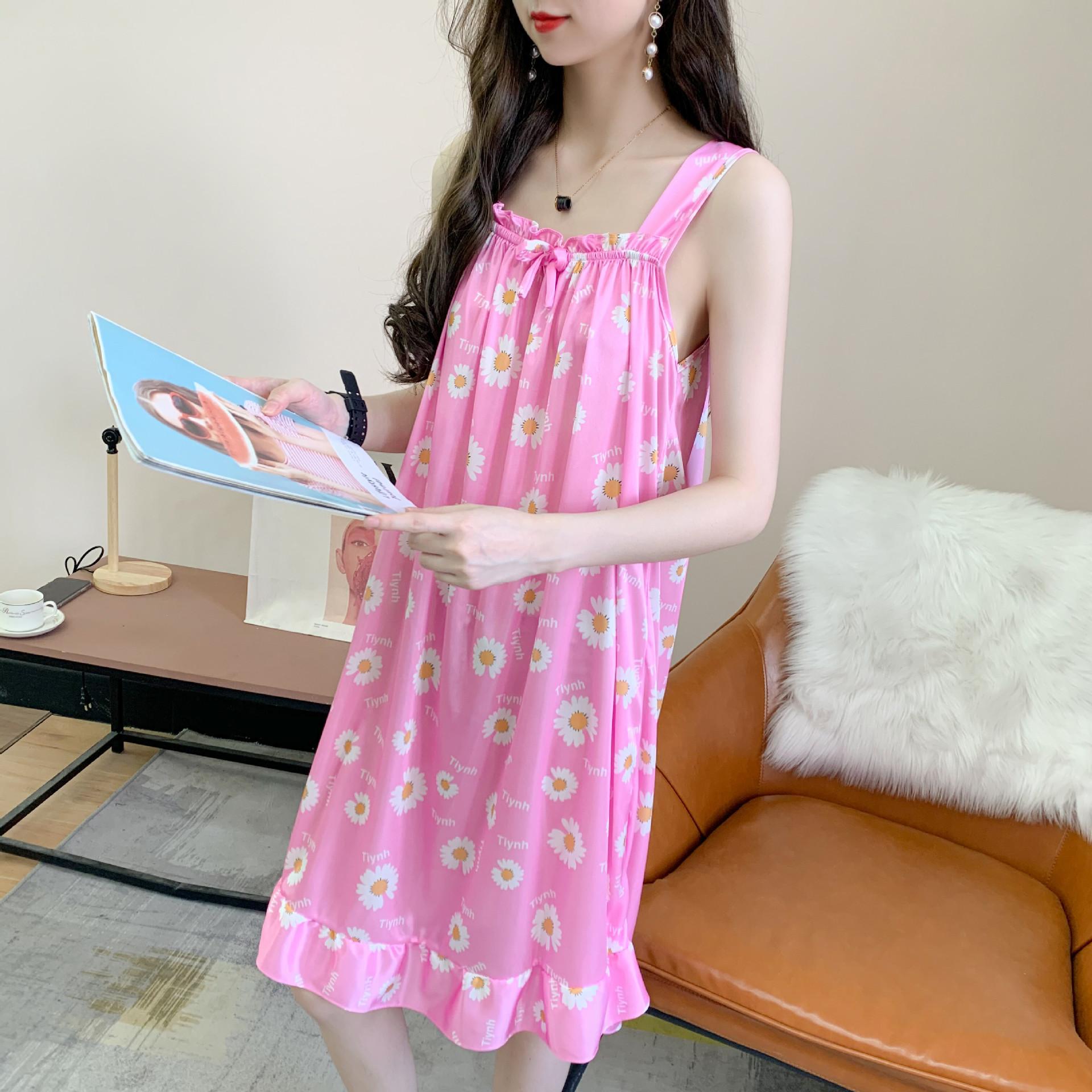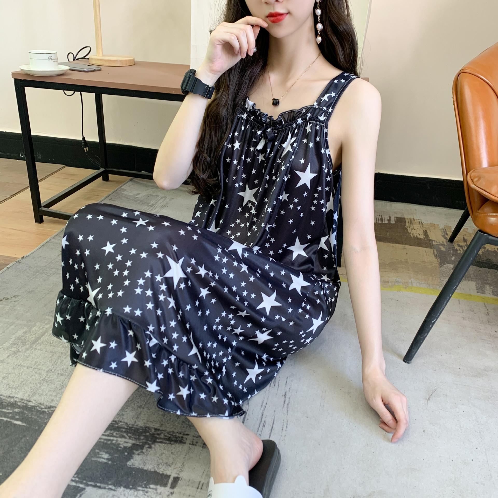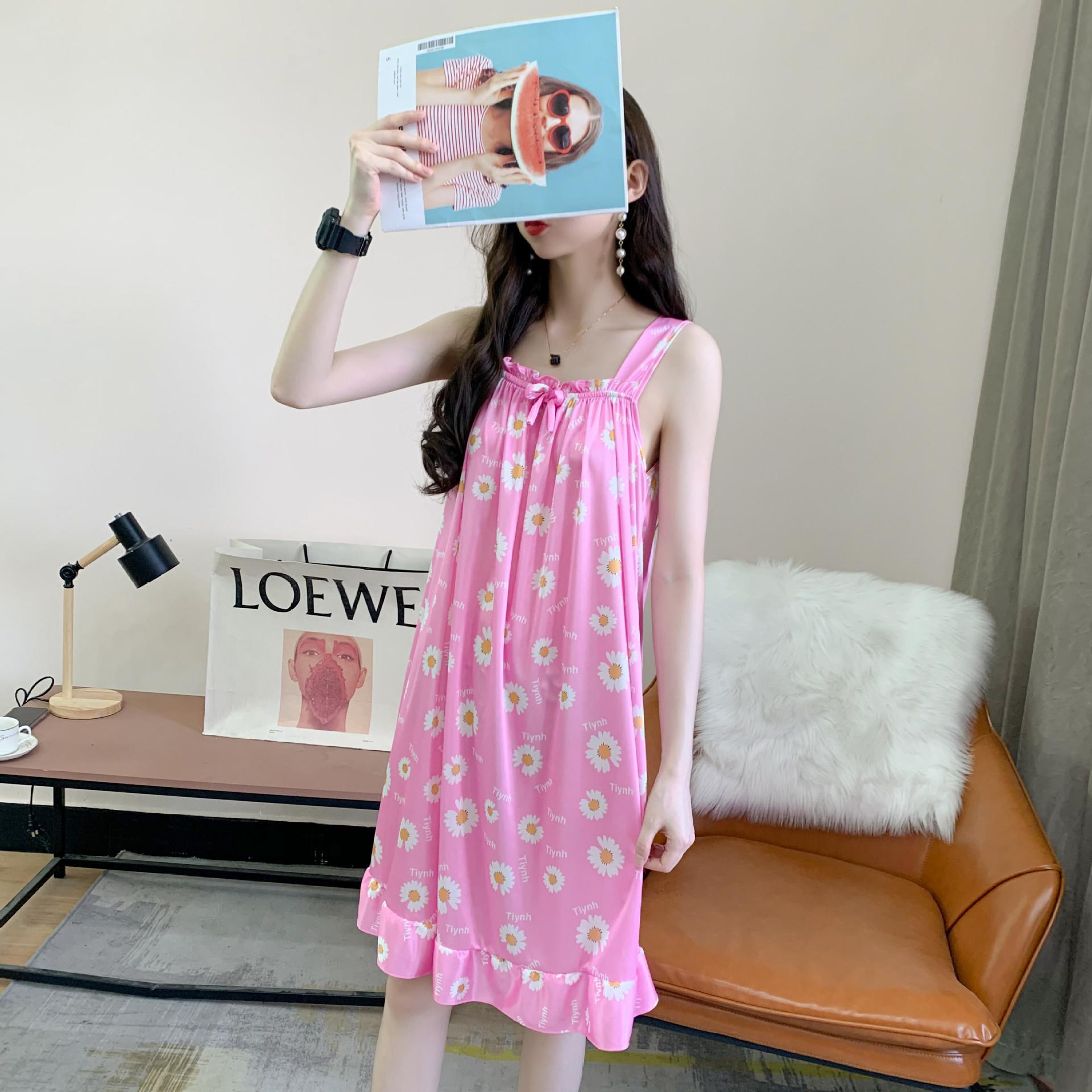 Camisola sem mangas com alças, pijama feminino de seda gelada de verão, sexy, estampado fino, moda solta, tamanho grande, roupas para casa, atacado