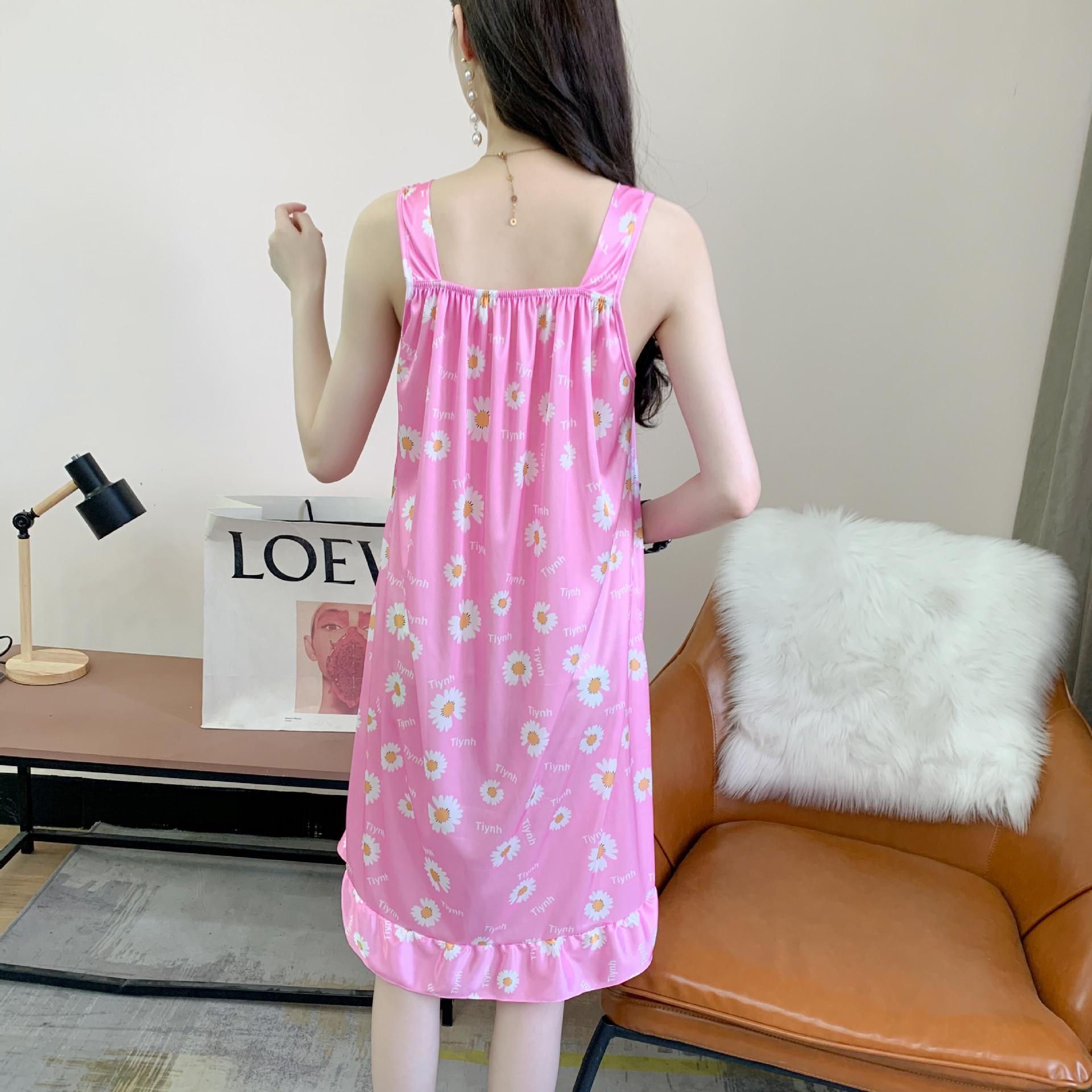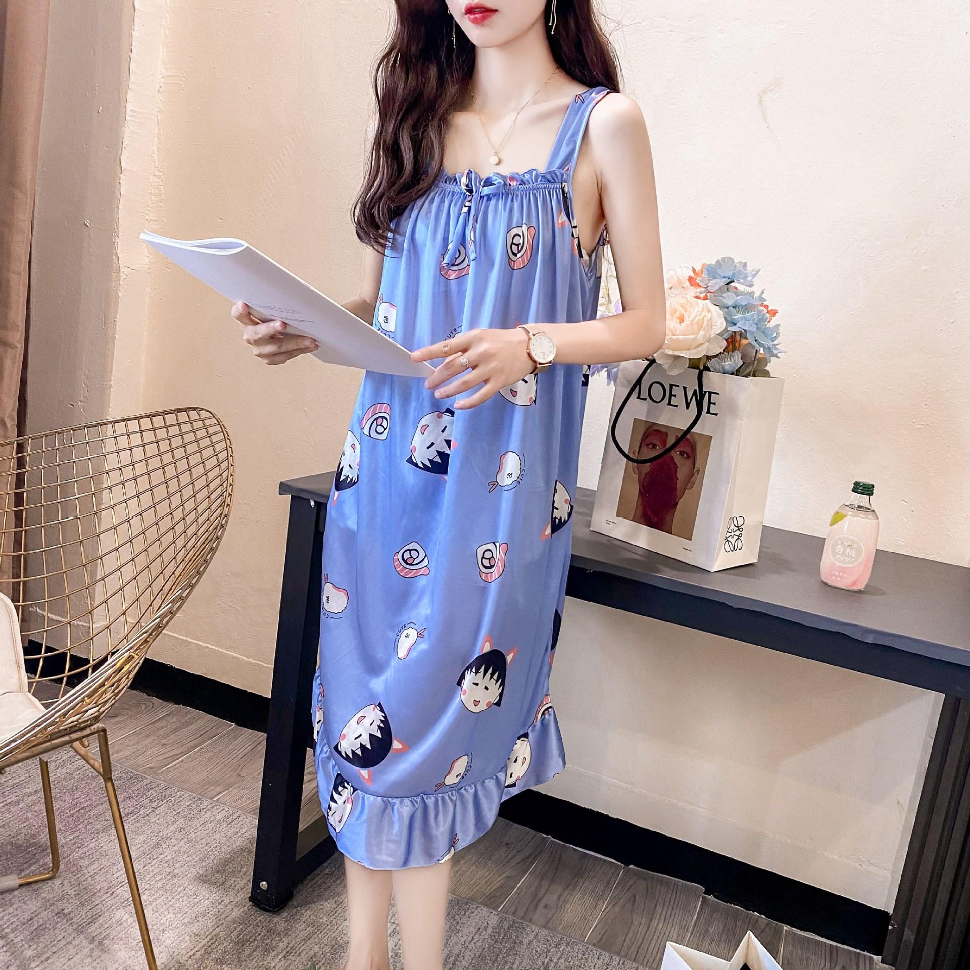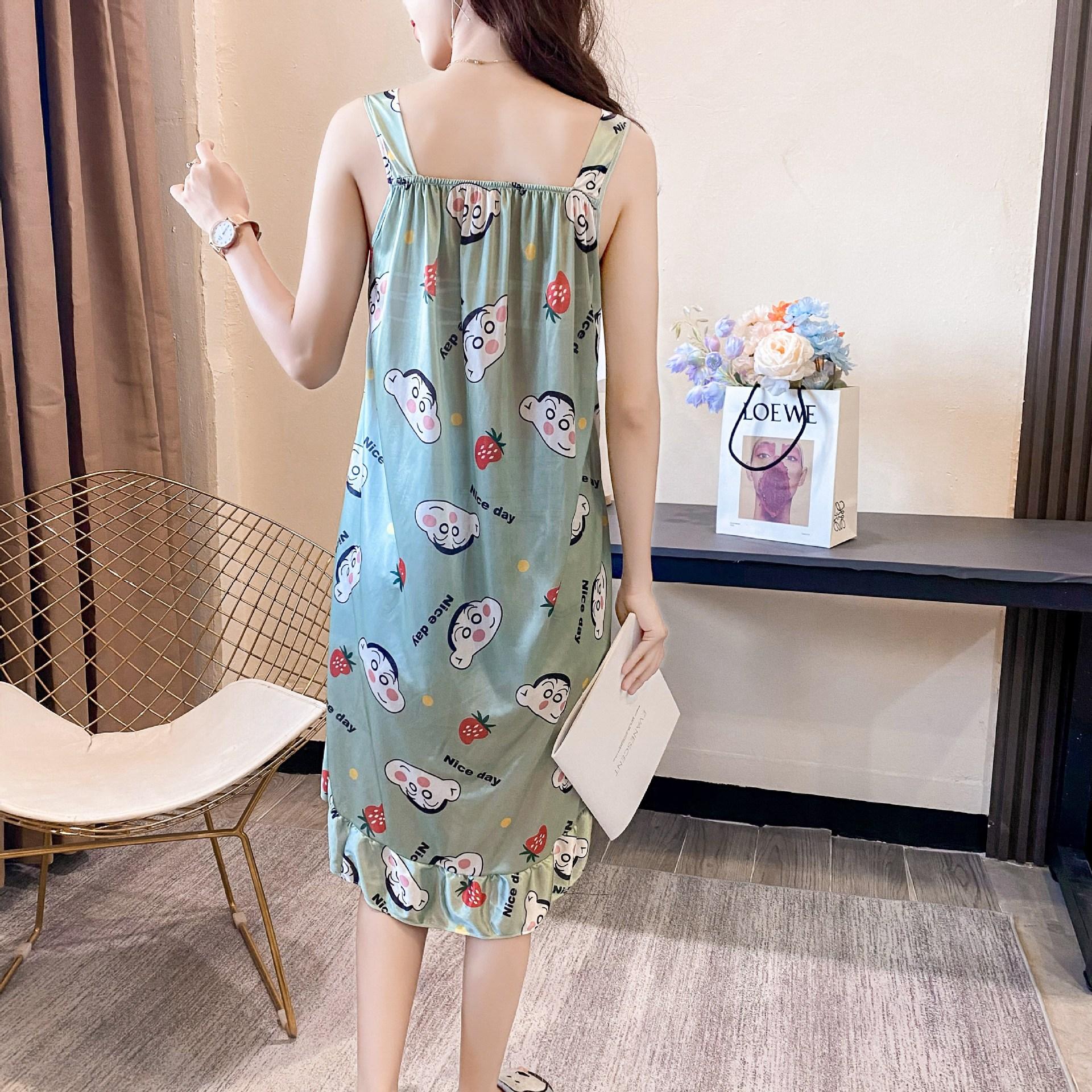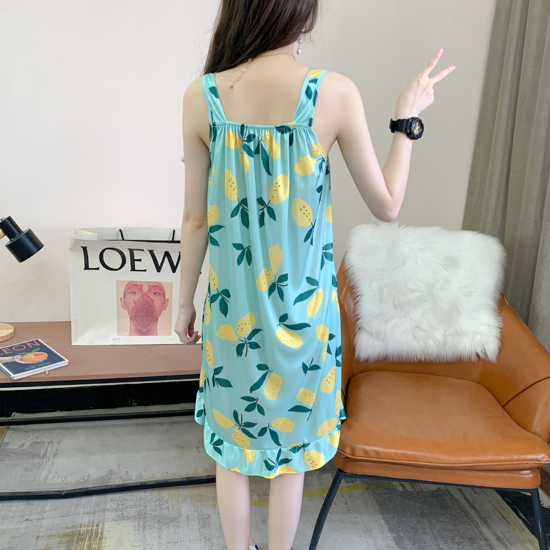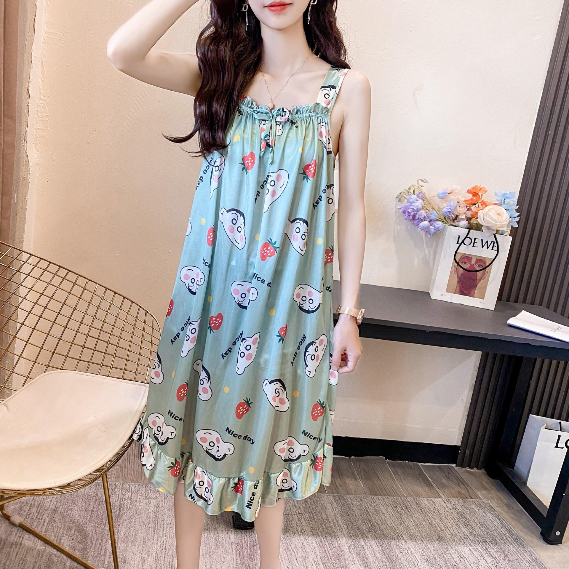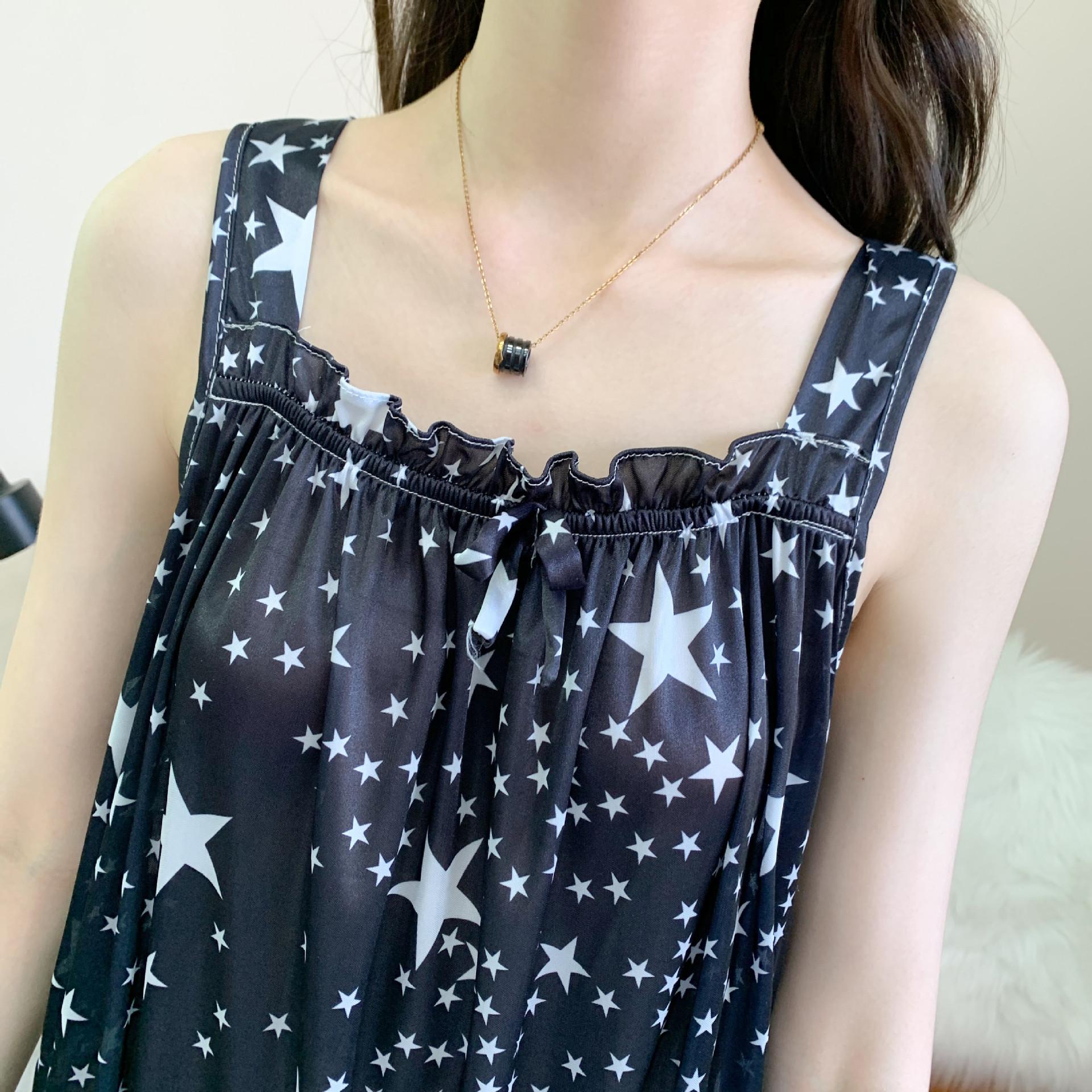 Camisola sem mangas com alças, pijama feminino de seda gelada de verão, sexy, estampado fino, moda solta, tamanho grande, roupas para casa, atacado