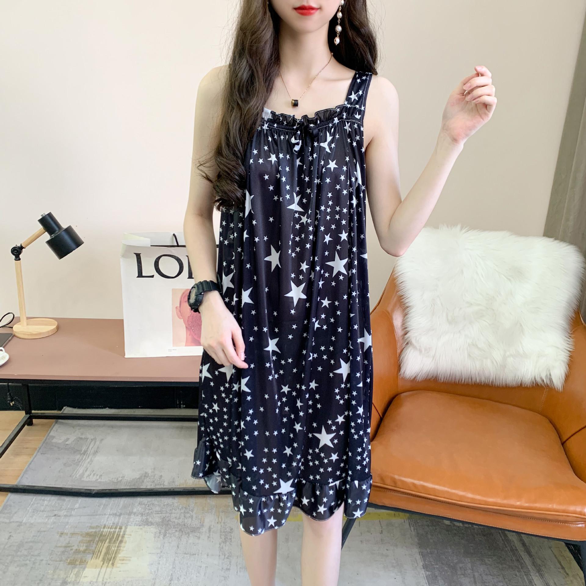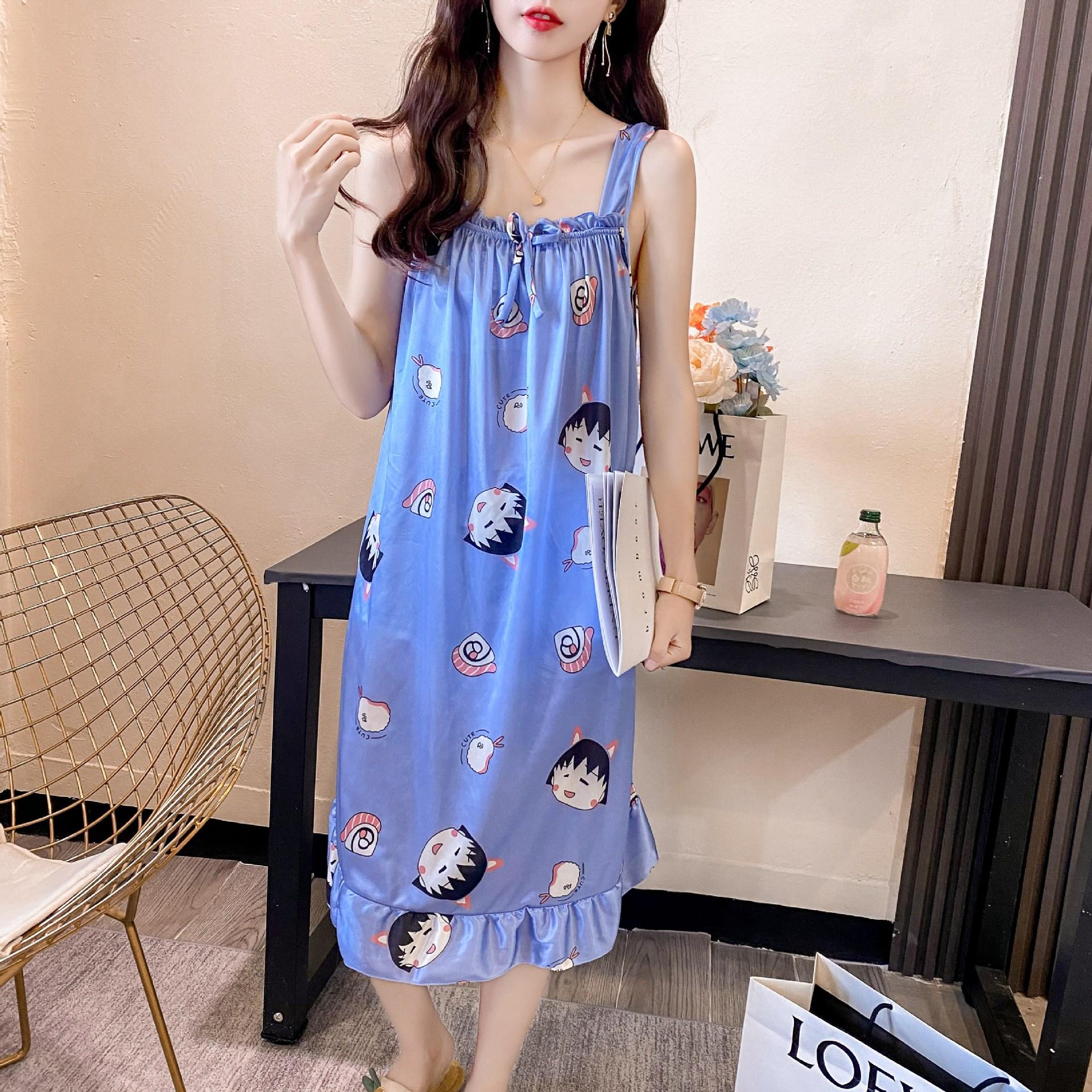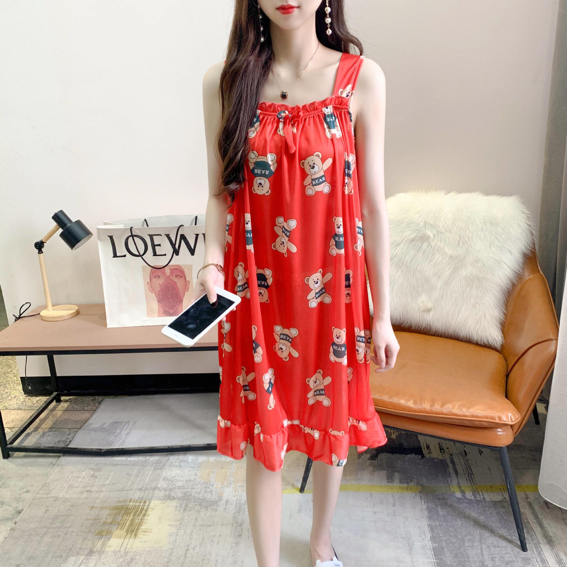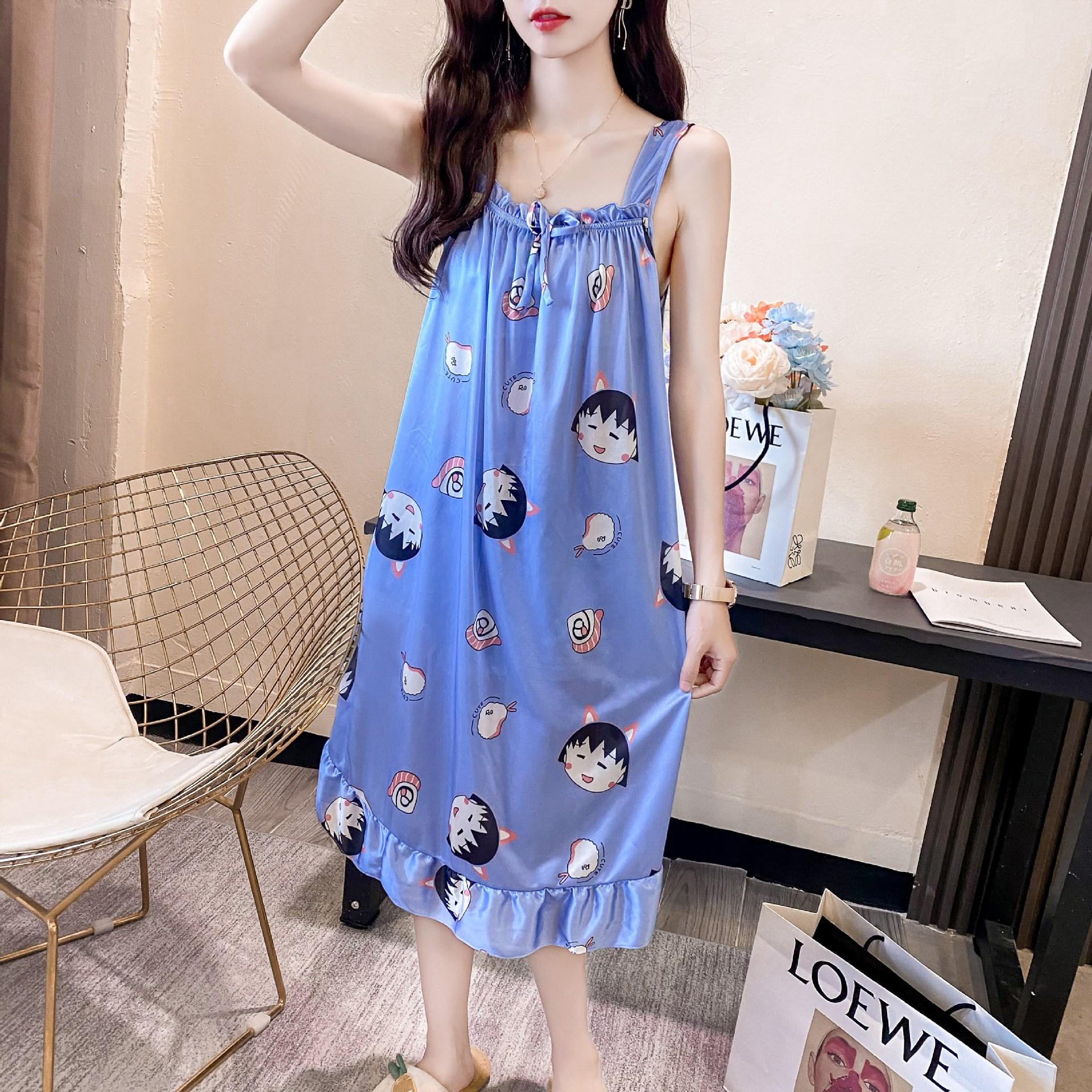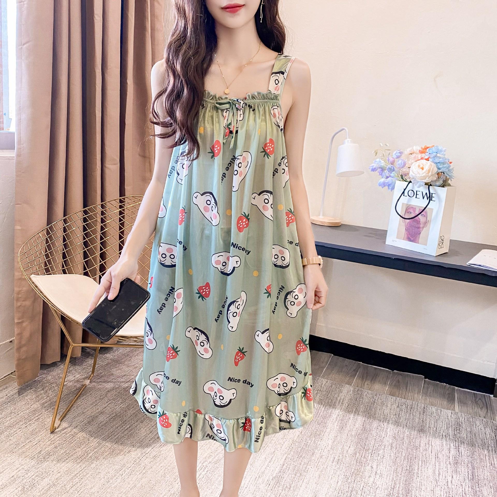 Camisola sem mangas com alças, pijama feminino de seda gelada de verão, sexy, estampado fino, moda solta, tamanho grande, roupas para casa, atacado