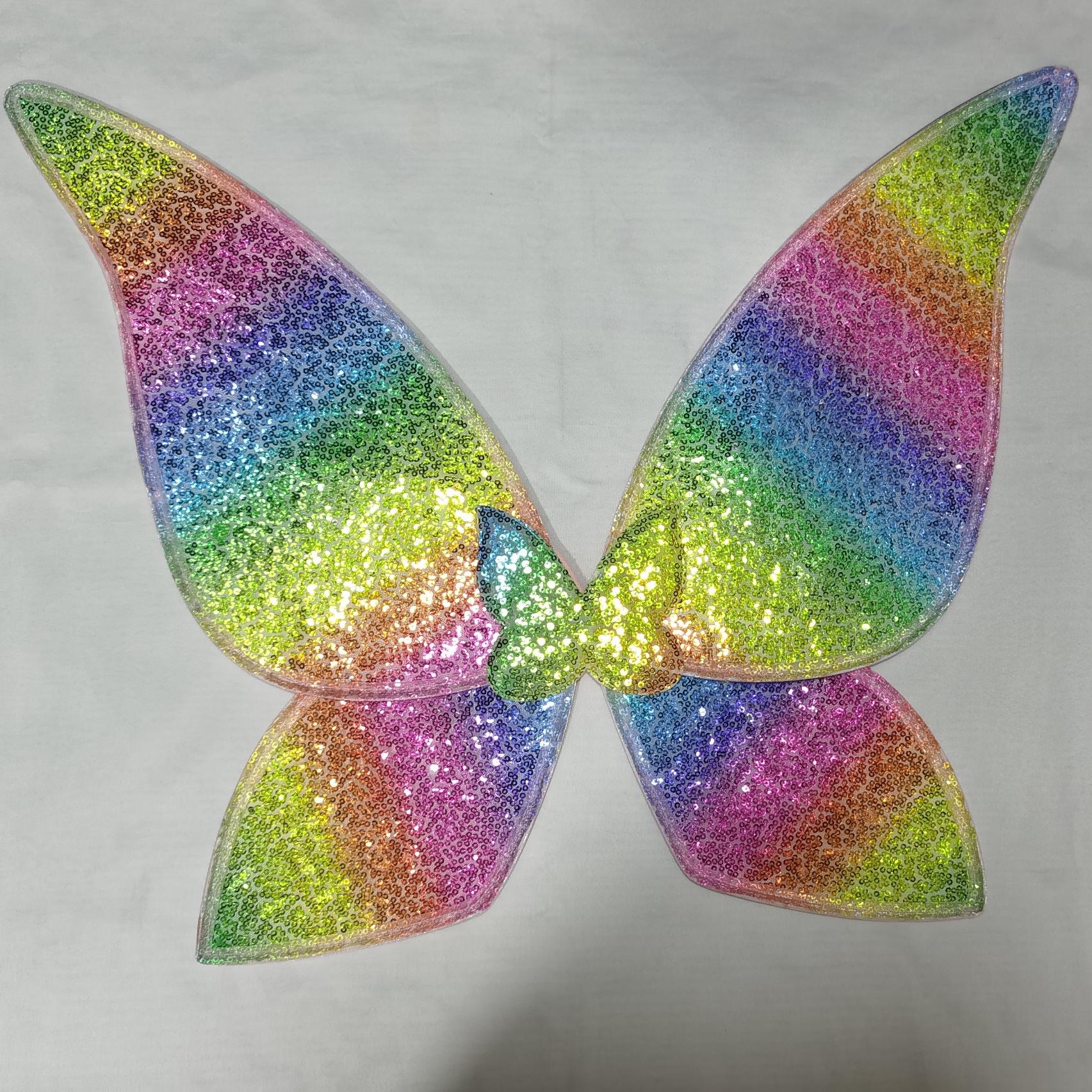 As asas de borboleta são feitas de 2 camadas, uma camada de lantejoulas coloridas na frente e uma camada de tecido nas costas
