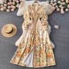 Vestido estilo palácio com mangas lanterna estampadas, decote em V, cintura fina, adelgaçante, trespassado