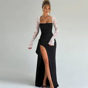 Roupas femininas de comércio exterior europeu e americano 2025 inverno novo renda manga longa sexy sem costas temperamento justo vestido fendado mulheres