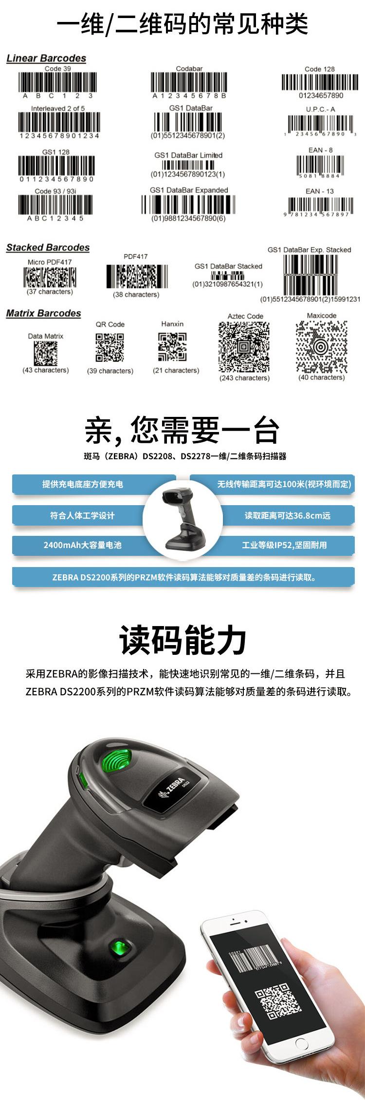 ZEBRA ZEBRA DS2208/2278 Scanner sem fio bidimensional para oficina, gerenciamento de materiais, caixa de supermercado, pistola de digitalização