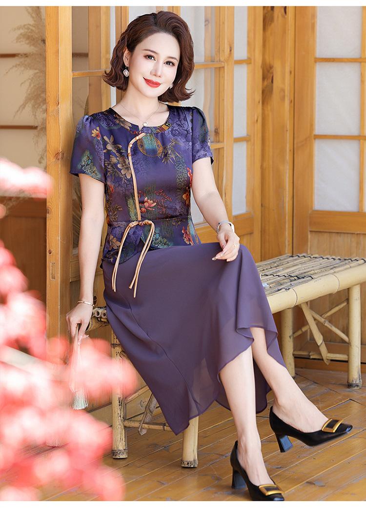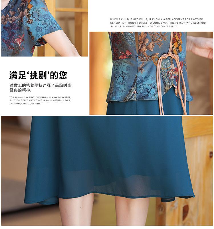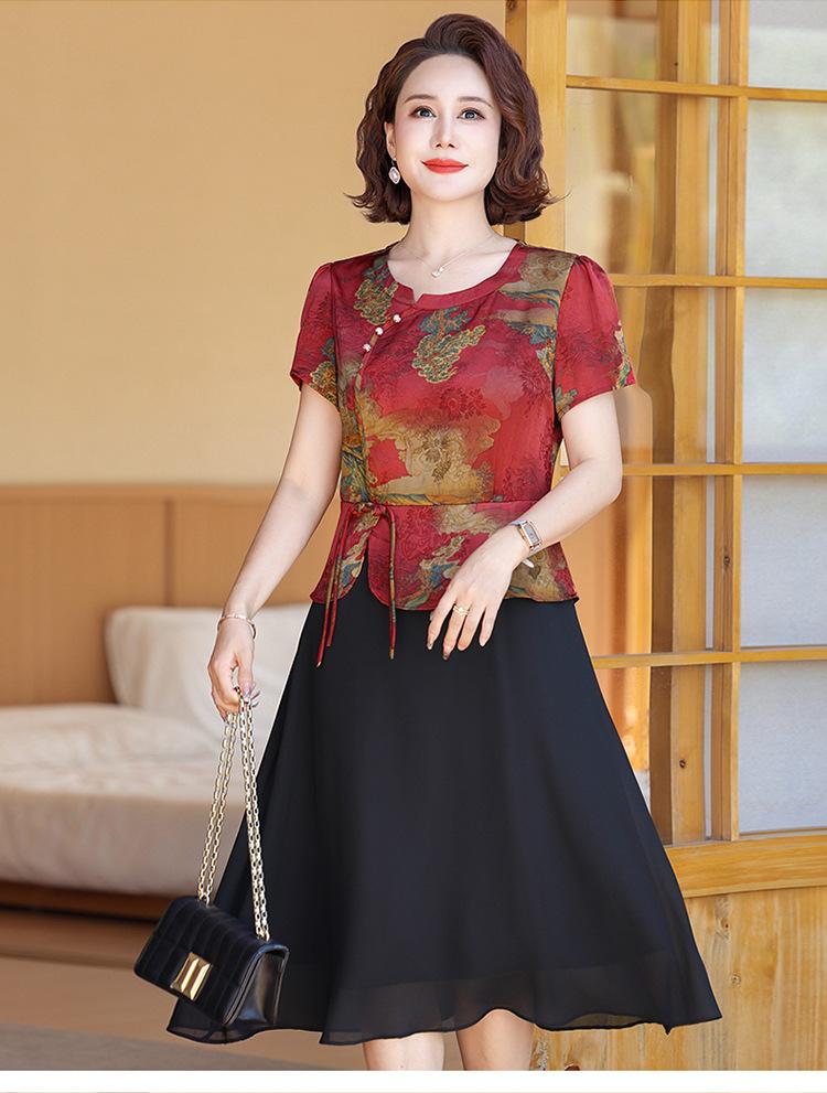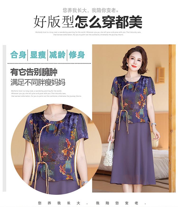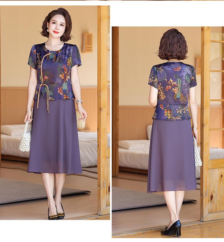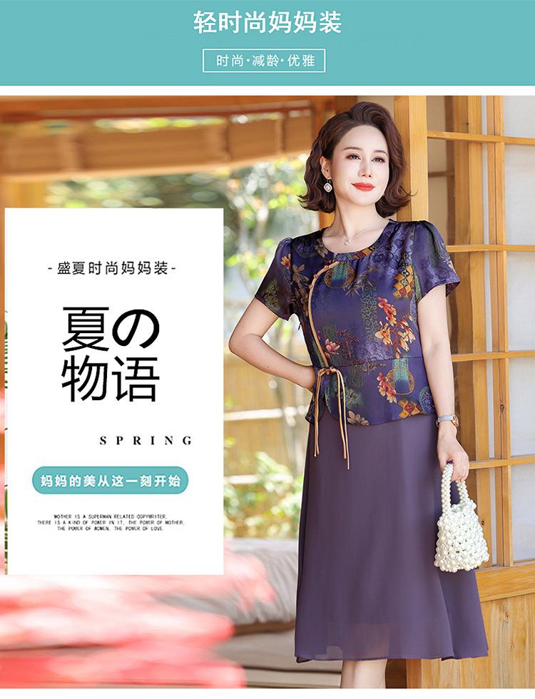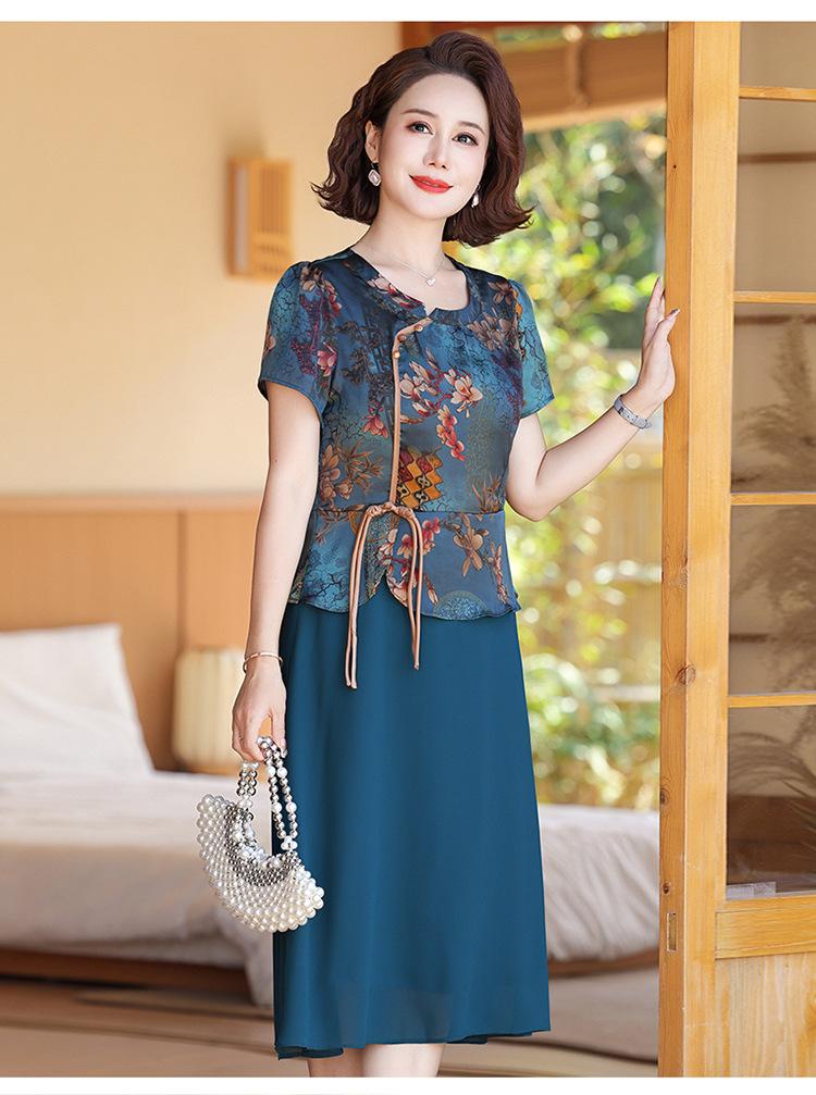 Vestido de verão para mãe, novo cheongsam, pequeno, estrangeiro, elegante, de meia-idade, feminino, verão, falso, vestido de duas peças, moda