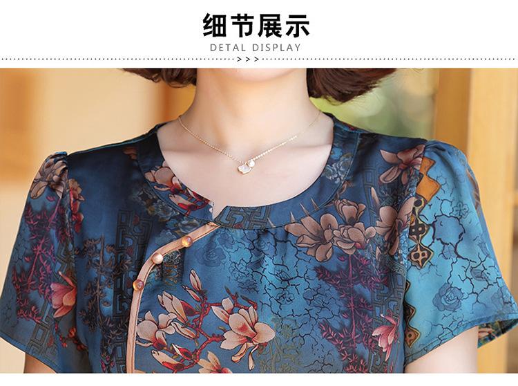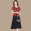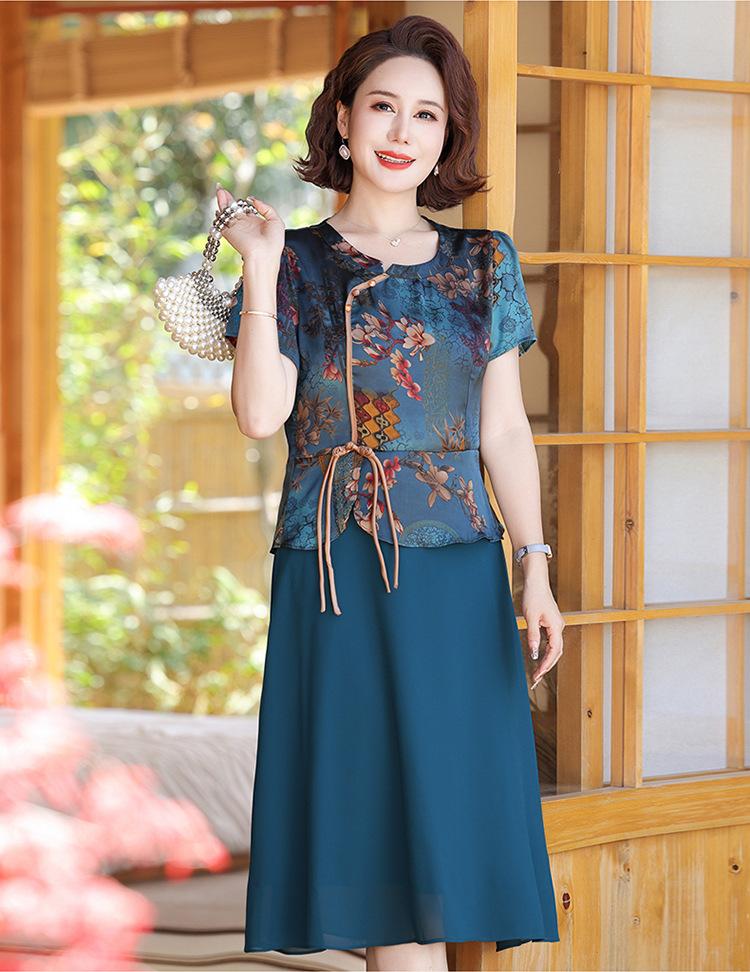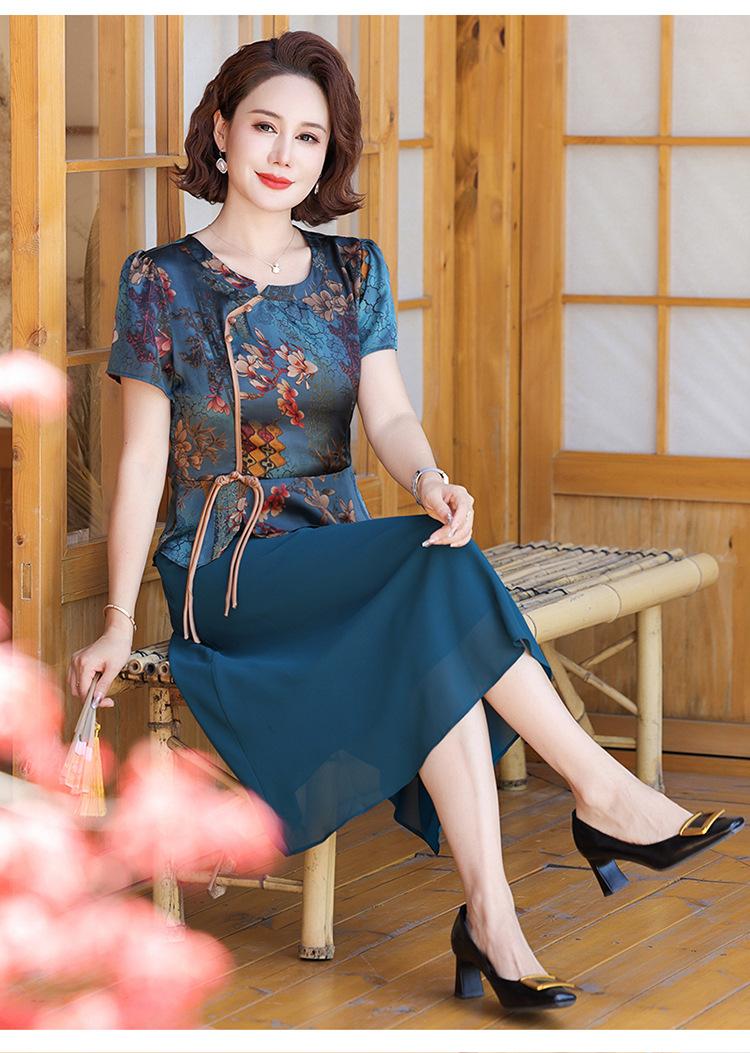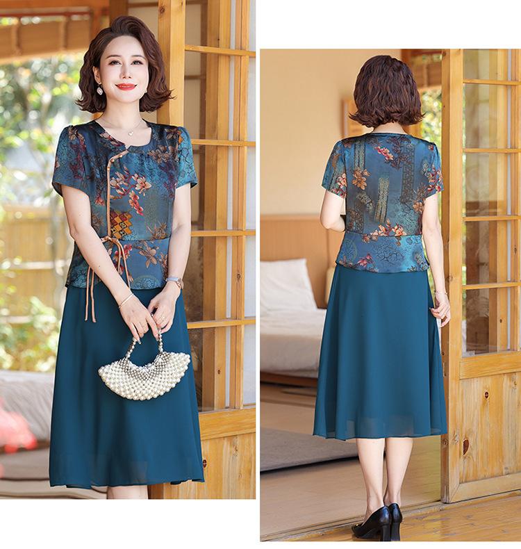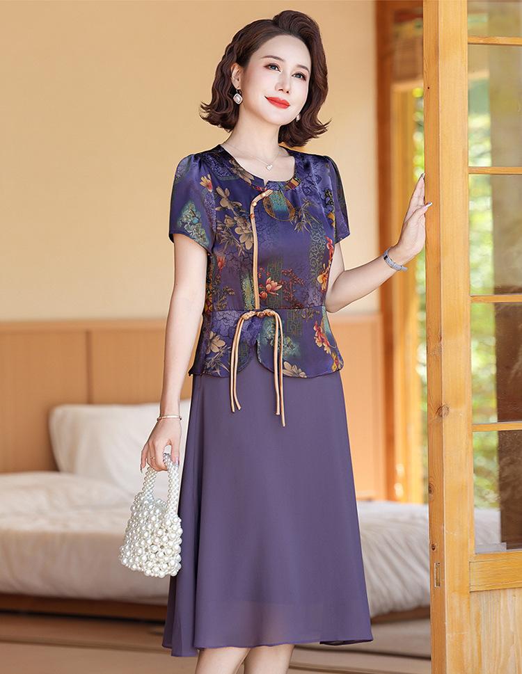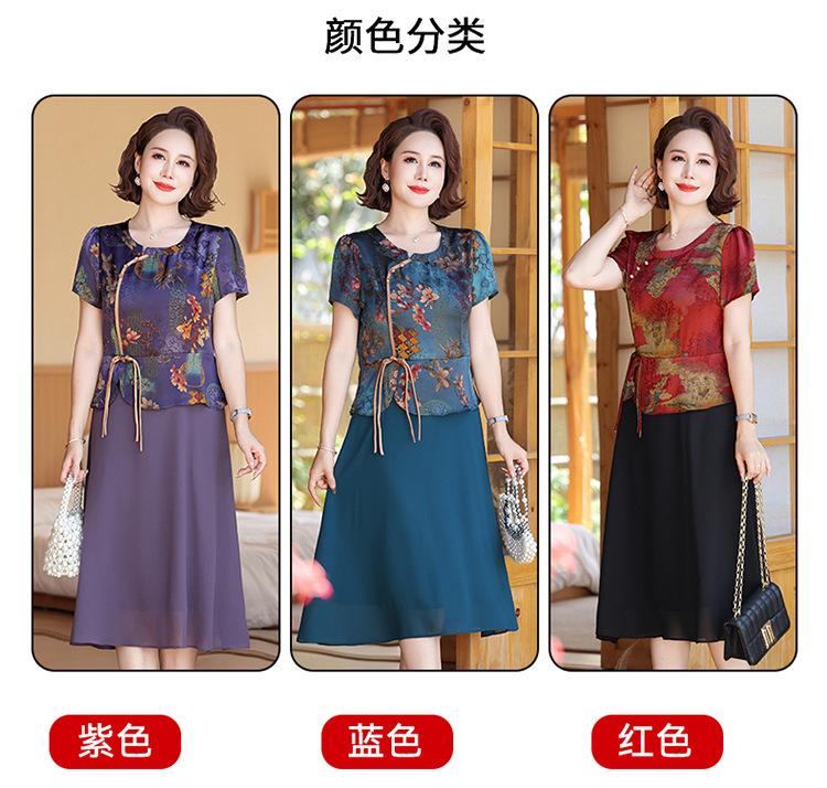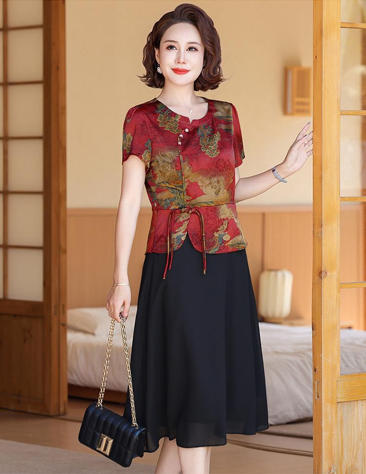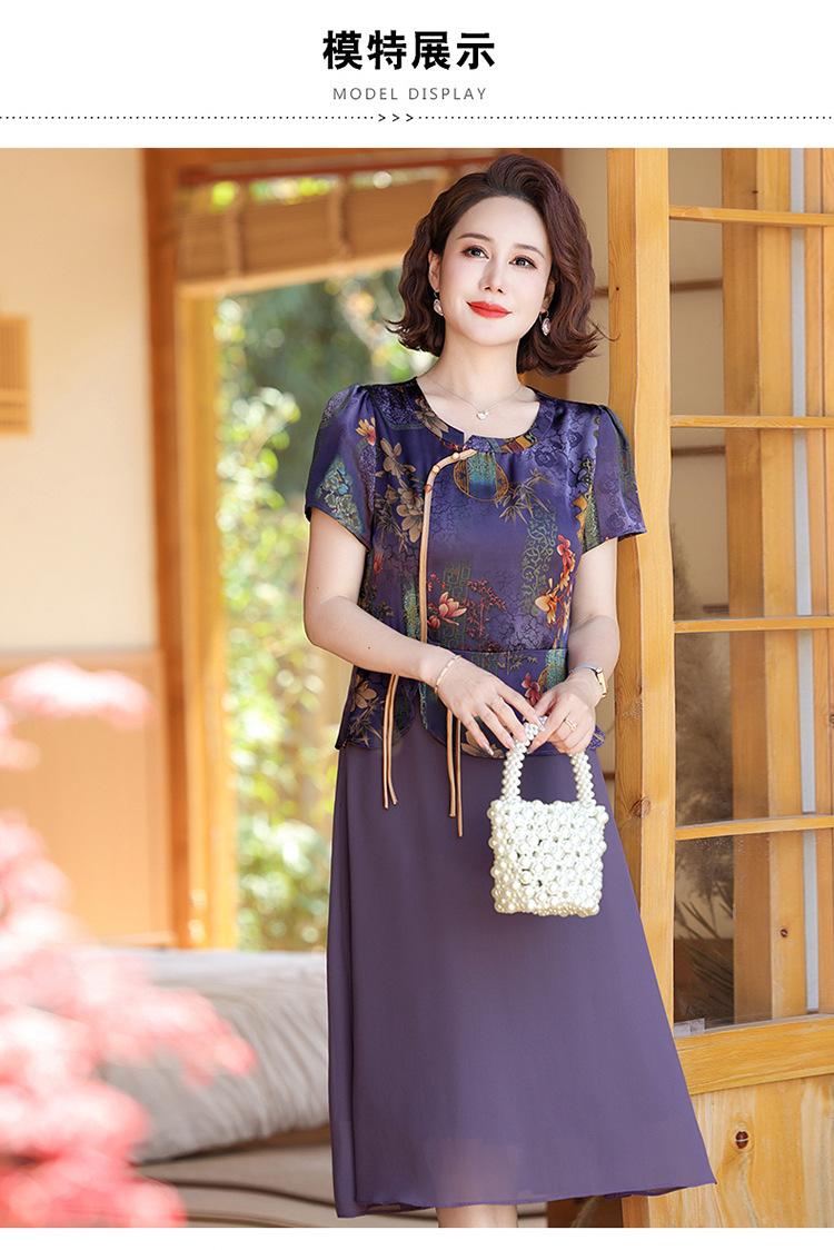 Vestido de verão para mãe, novo cheongsam, pequeno, estrangeiro, elegante, de meia-idade, feminino, verão, falso, vestido de duas peças, moda